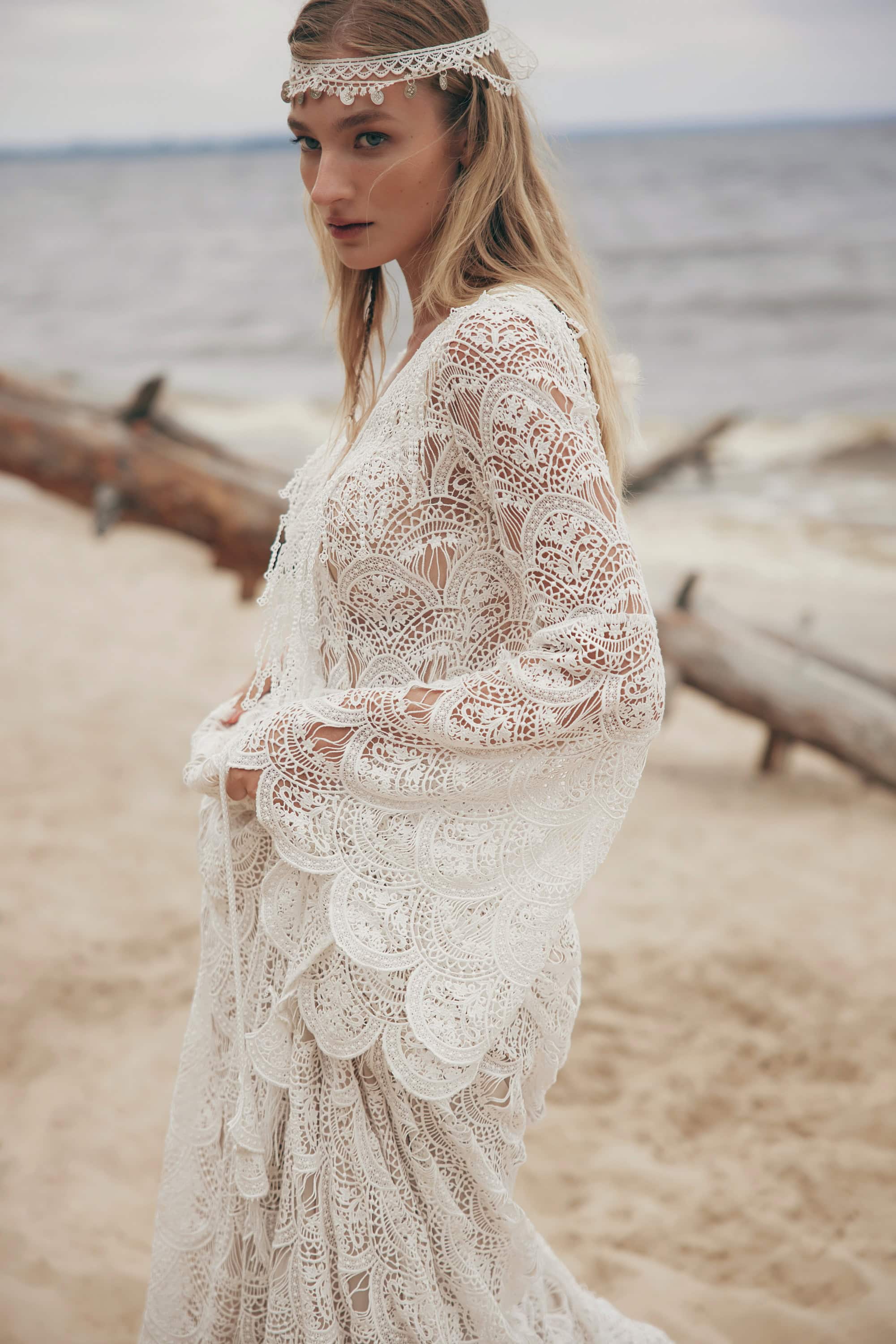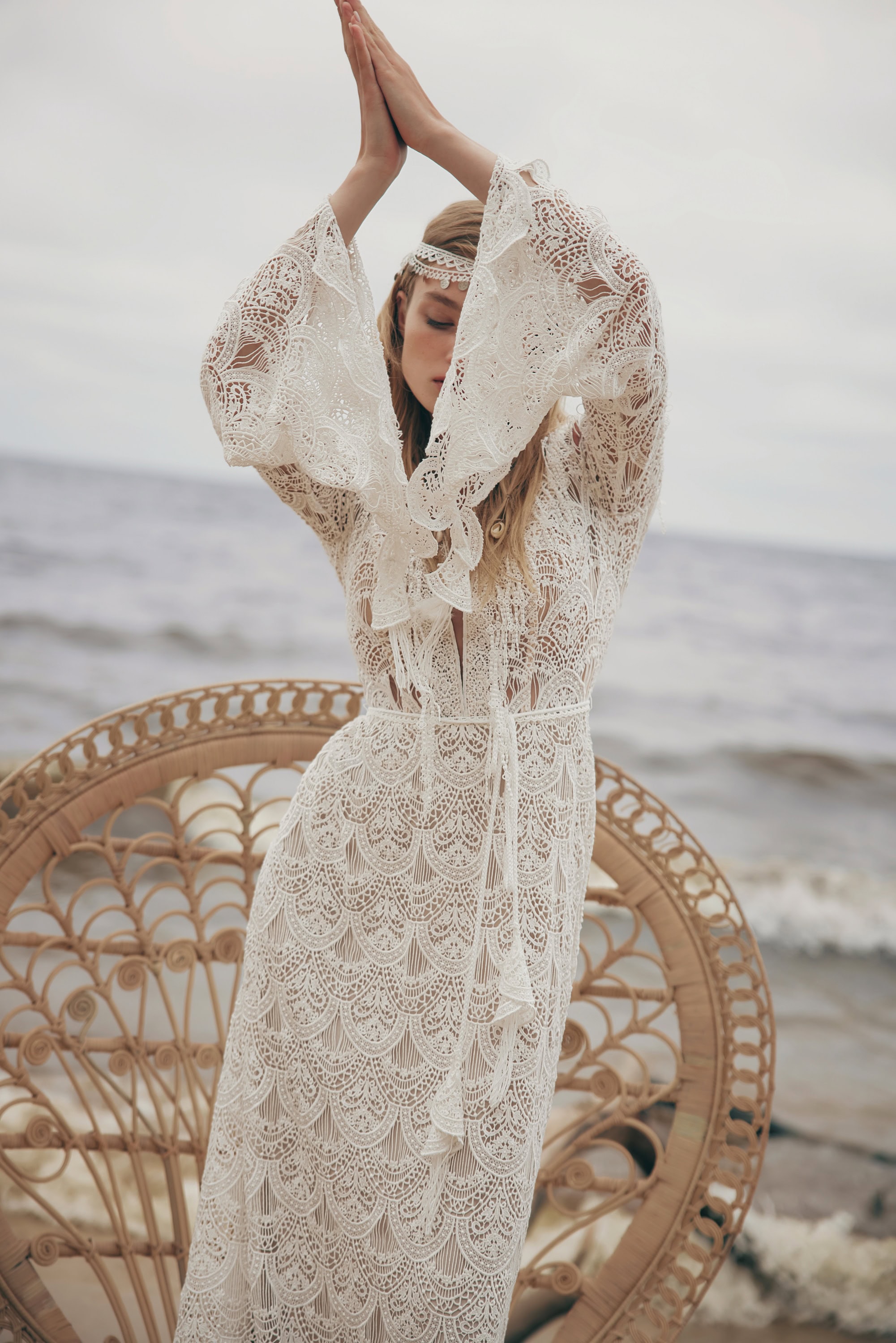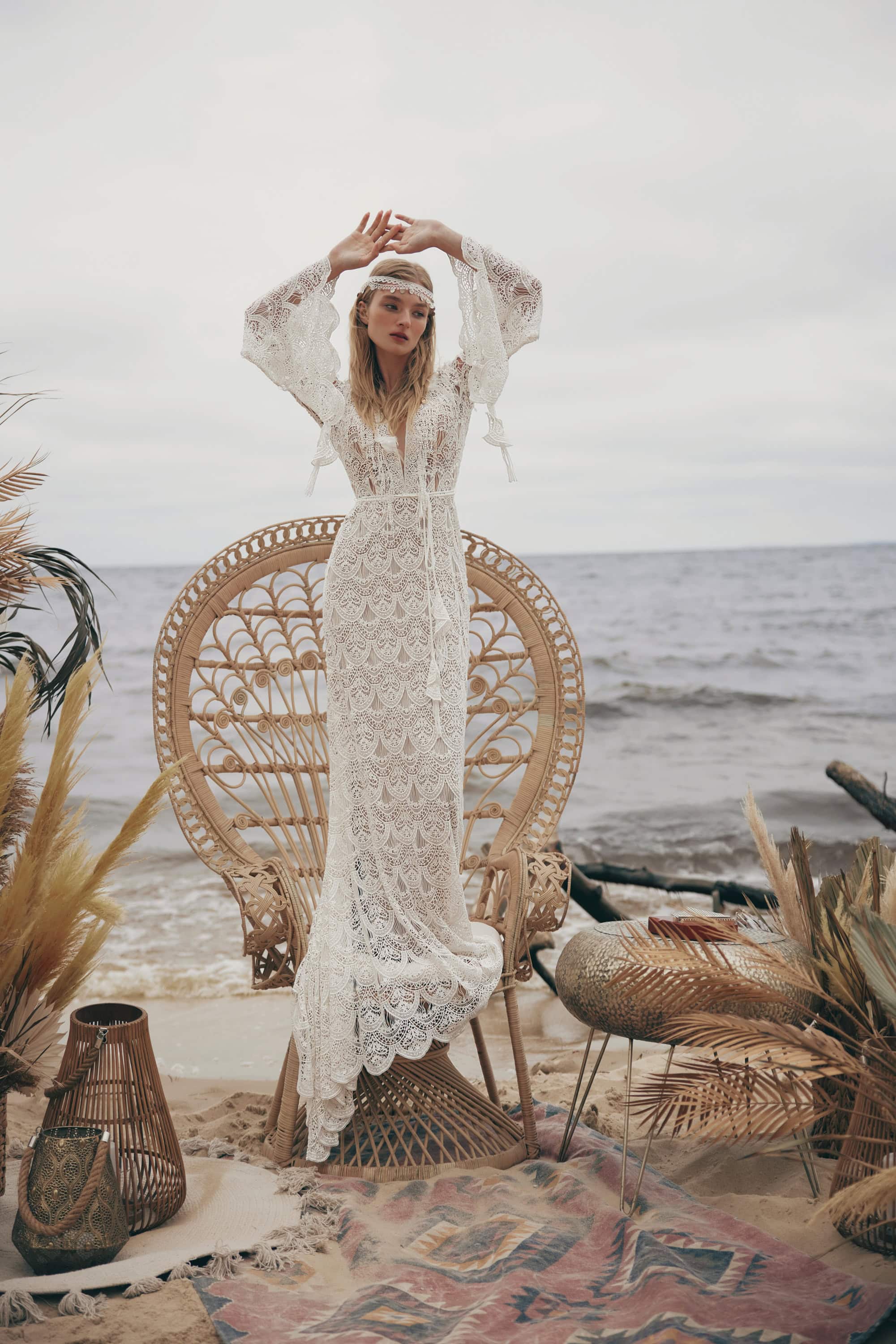 Rochia de mireasă Addicted To You este o celebrare a spiritului boem și a feminității naturale, perfectă pentru miresele care visează la o nuntă în aer liber, pe plajă sau în mijlocul naturii. Această creație spectaculoasă este realizată integral din dantelă croșetată cu model tip scoică, care se așază lejer pe corp și creează o siluetă relaxată și senzuală. Mâneci lungi, evazate și fluide, împreună cu decolteul în V și detaliile cu franjuri delicate, compun un look lejer, dar plin de rafinament. Spatele decupat și închis cu șnur adaugă un aer de naturalețe seducătoare, în timp ce trena discretă completează perfect ținuta cu o notă de romantism boho.