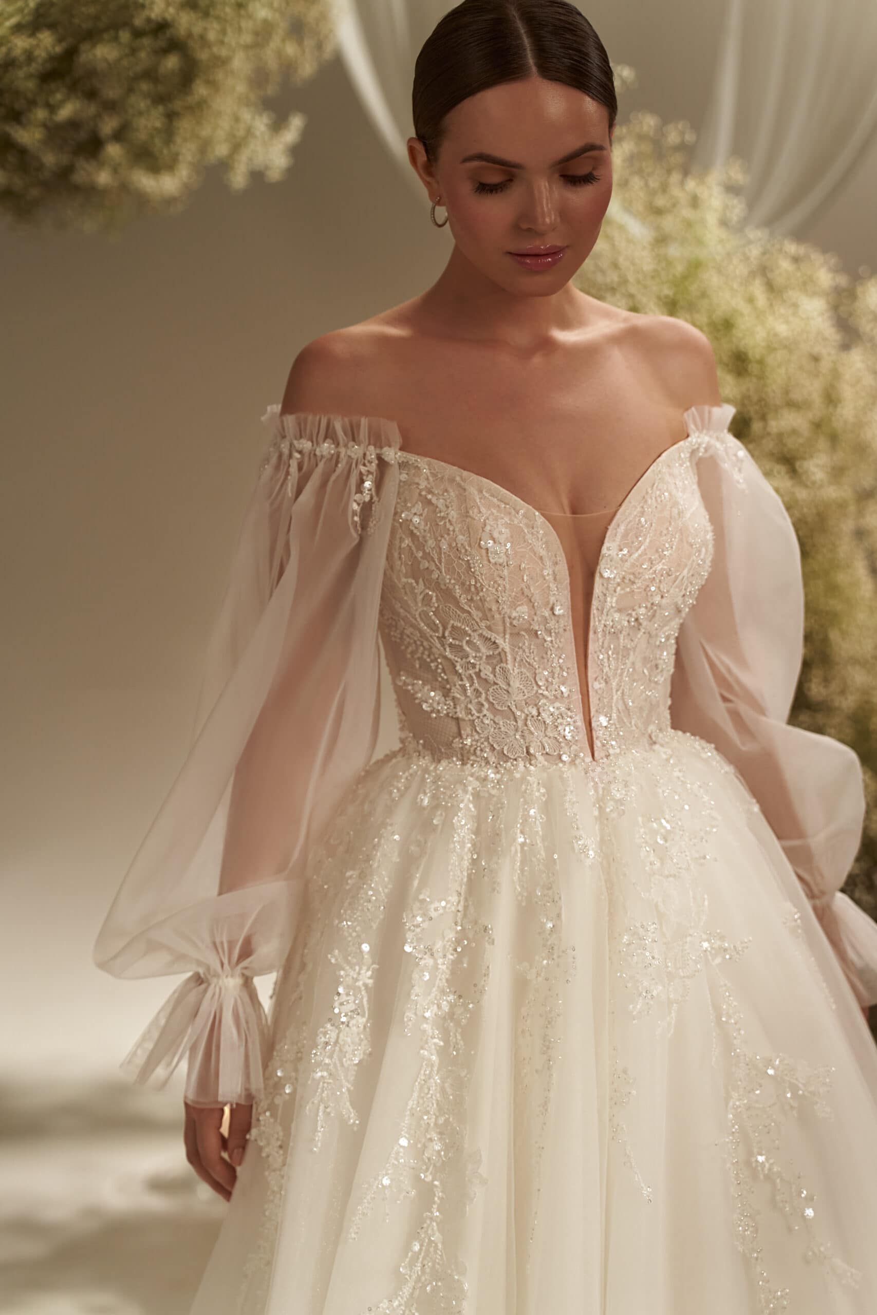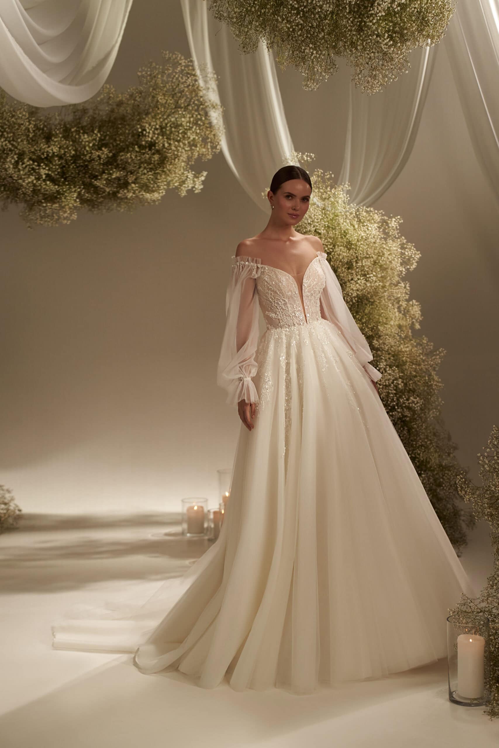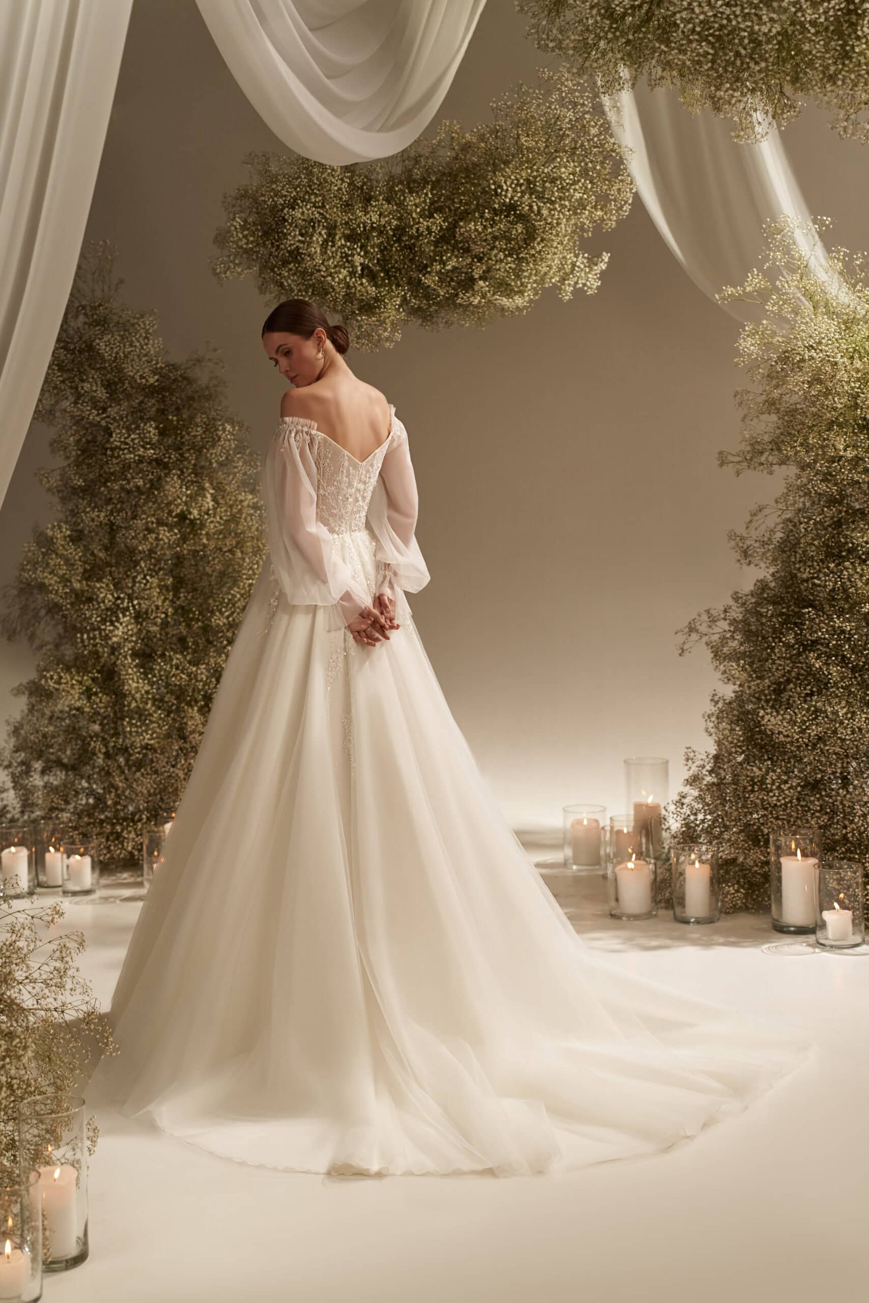 Rochia Alba îmbină romantismul atemporal cu o senzualitate discretă, într-o creație ce radiază delicatețe și rafinament. Corsetul cu decolteu adânc în formă de inimă este decorat subtil cu broderii fine, care se pierd treptat în fusta amplă din straturi vaporoase de tulle. Mânecile lungi, transparente, din voal fin, se termină în volane delicate și panglici gingașe, adăugând un aer de vis și feminitate absolută. Croiala care lasă umerii ușor descoperiți subliniază eleganța naturală a miresei, iar trena amplă completează perfect tabloul unei apariții regale, diafane și memorabile.