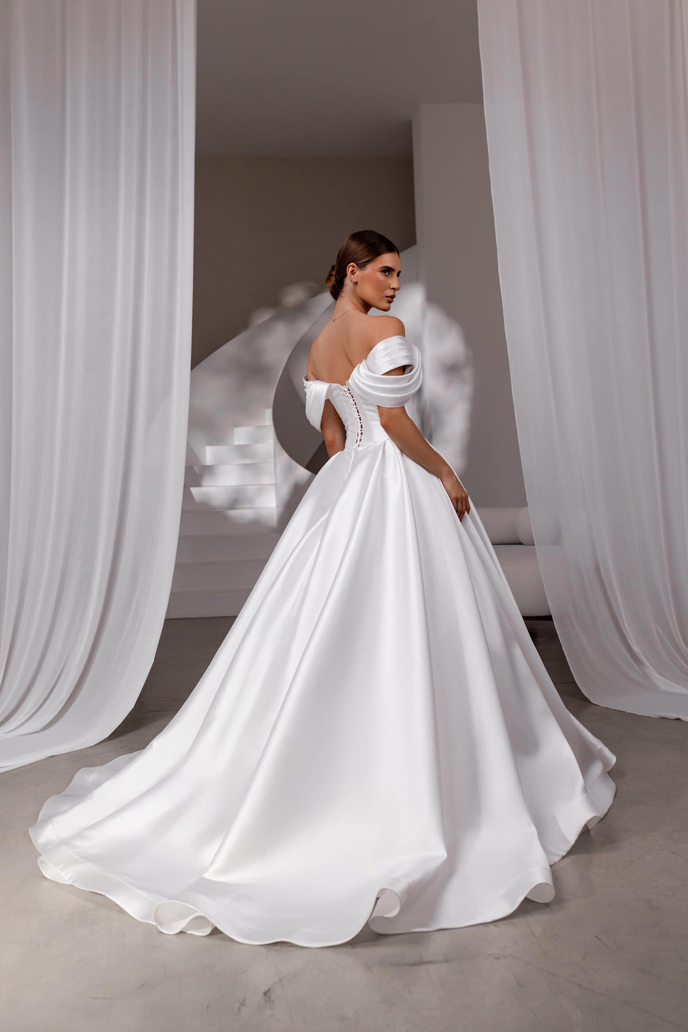 Rochia de mireasă Clemence impresionează prin eleganța sa sculpturală și simplitatea sofisticată a materialului mikado satinat. Croiala tip prințesă oferă volum și rafinament, evidențiind talia și alungind silueta într-un mod regal. Corsetul prezintă un design deosebit, cu drapaje amplasate simetric care formează un joc arhitectural elegant, completat de un decupaj în formă de inimă, decorat cu inserții fine de dantelă și perle. Mânecile bardot ample, realizate din același material prețios, încadrează umerii cu grație, oferind un aer romantic și sofisticat. Trena generoasă întărește senzația de prestanță și nobilime, făcând din Clemence o alegere impecabilă pentru o mireasă ce își dorește o apariție clasică, dar memorabilă.