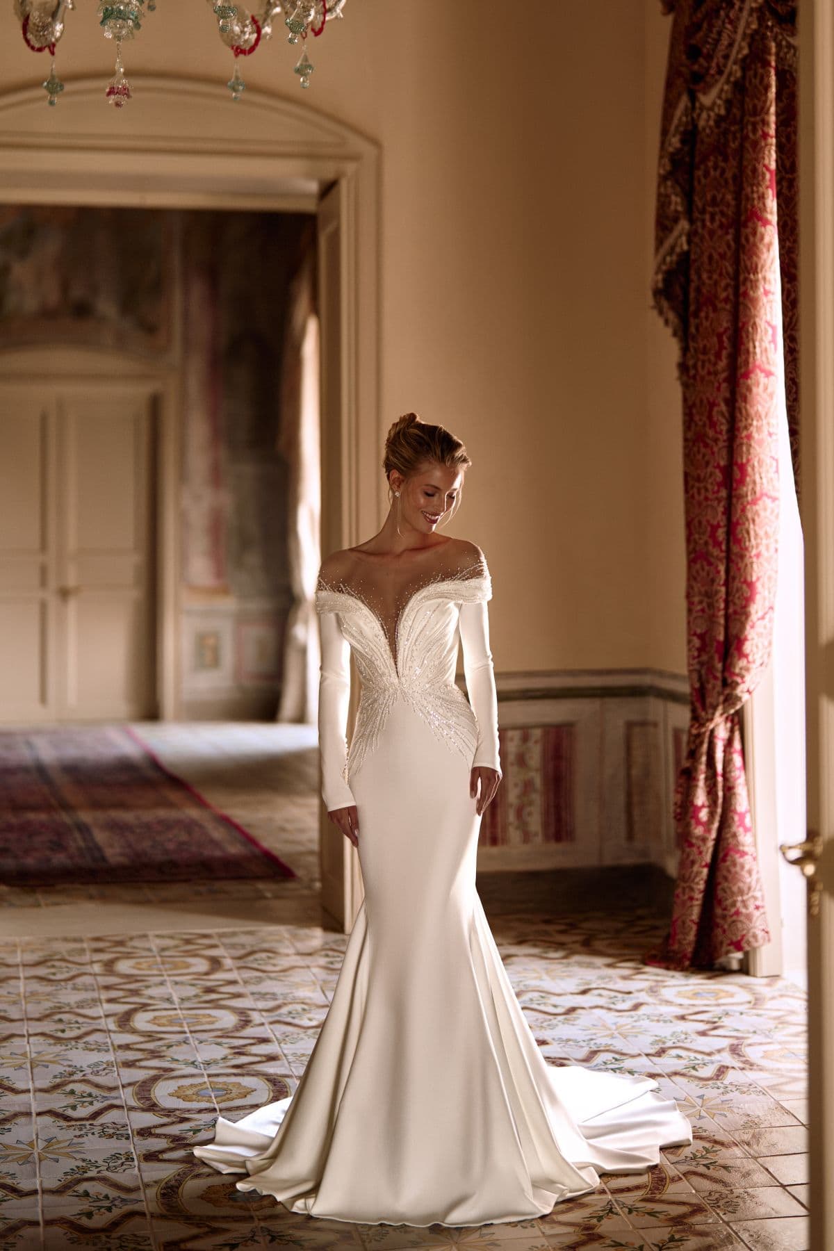 Rochia Dolfa impresionează prin minimalism sofisticat și rafinament sculptural. Liniile sale curate conturează perfect silueta, iar detaliile brodate cu perle delicate din zona bustului se revarsă într-un efect optic ce alungește talia și pune în valoare feminitatea. Decolteul adânc în formă de V, acoperit de tulle iluzie, creează un echilibru subtil între senzualitate și eleganță, în timp ce umerii lăsați conferă un aer regal. Spatele decoltat, accesorizat cu nasturi perlați și broderii fine, adaugă o notă spectaculoasă, iar trena fluidă completează un look memorabil și atemporal.