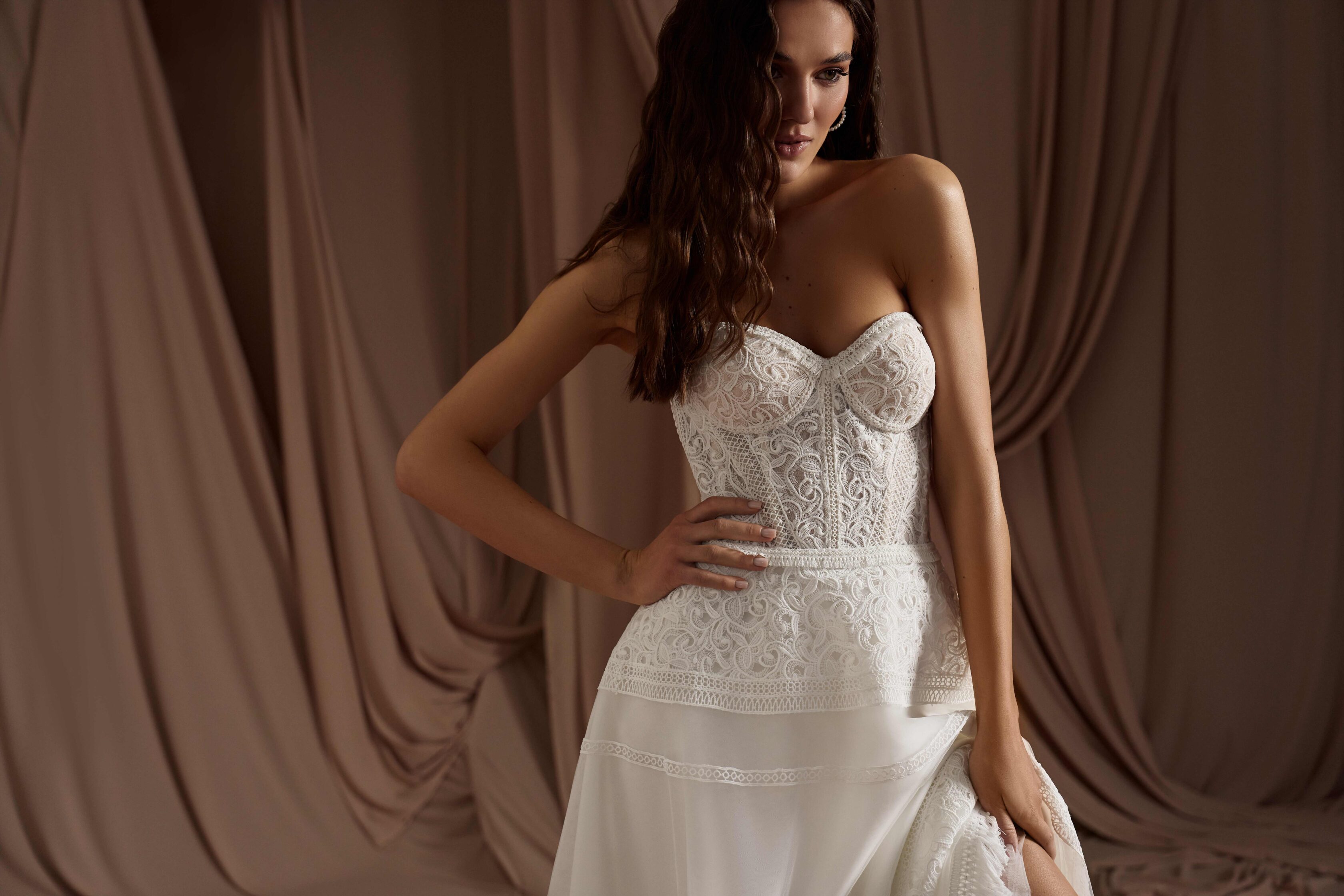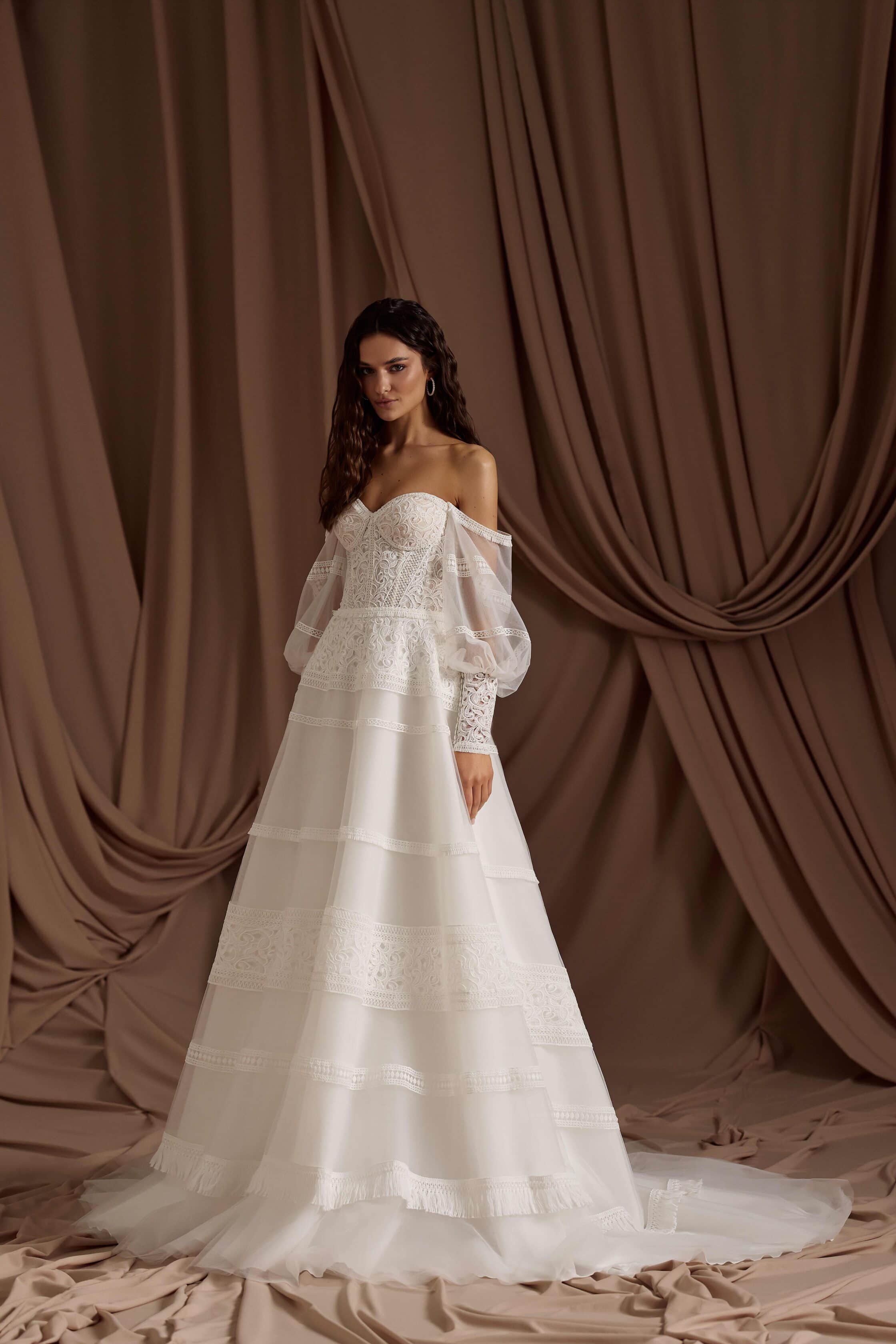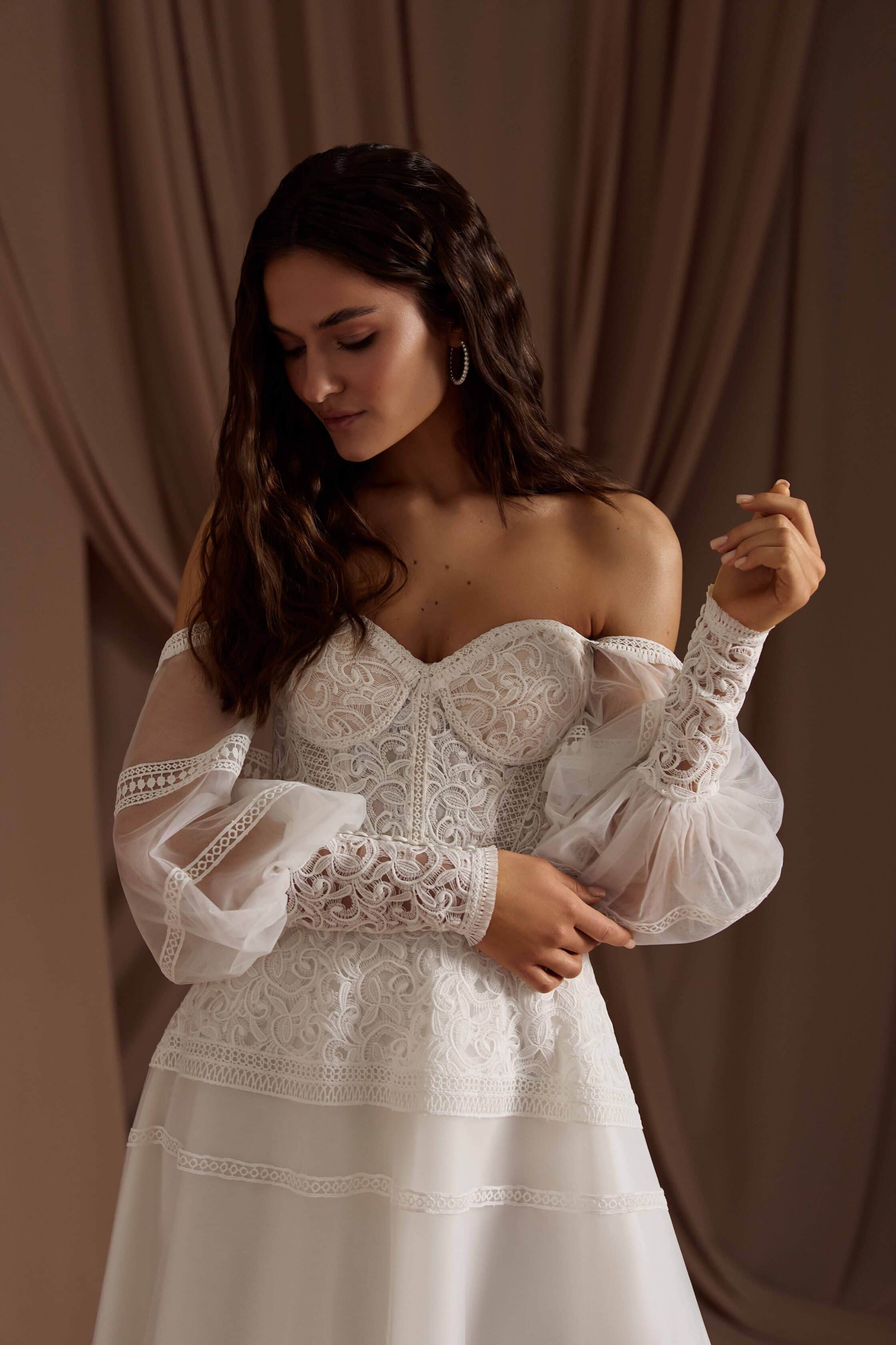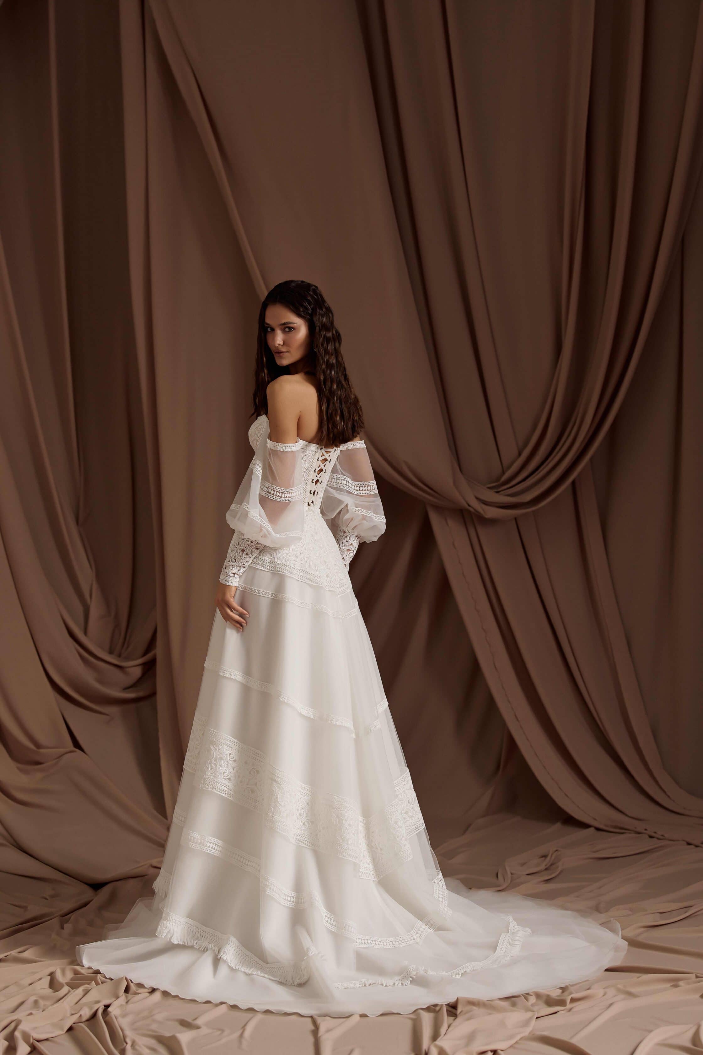 Rochia Genevieve este o invitație la visare pentru mireasa modernă cu suflet boem. Corsetul romantic, brodat delicat cu motive florale vintage, subliniază feminitatea într-un mod subtil, iar mânecile căzute din tul vaporos adaugă un aer eteric și relaxat întregii siluete. Fusta lejeră, cu aplicații de dantelă și franjuri fine, creează o armonie între rustic și rafinat, între vis și realitate. Este rochia perfectă pentru o nuntă în aer liber, un peisaj natural și o iubire liberă, autentică.