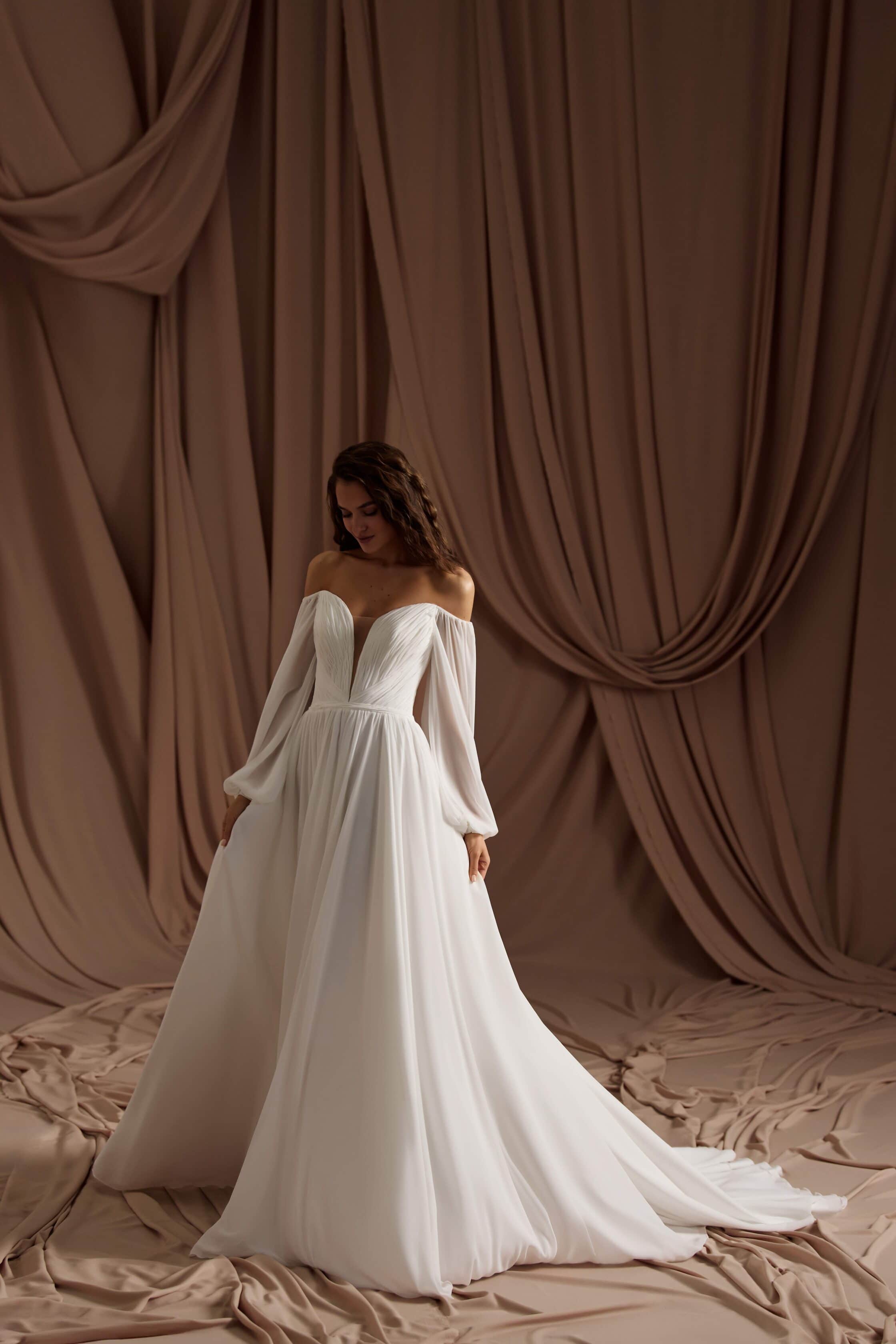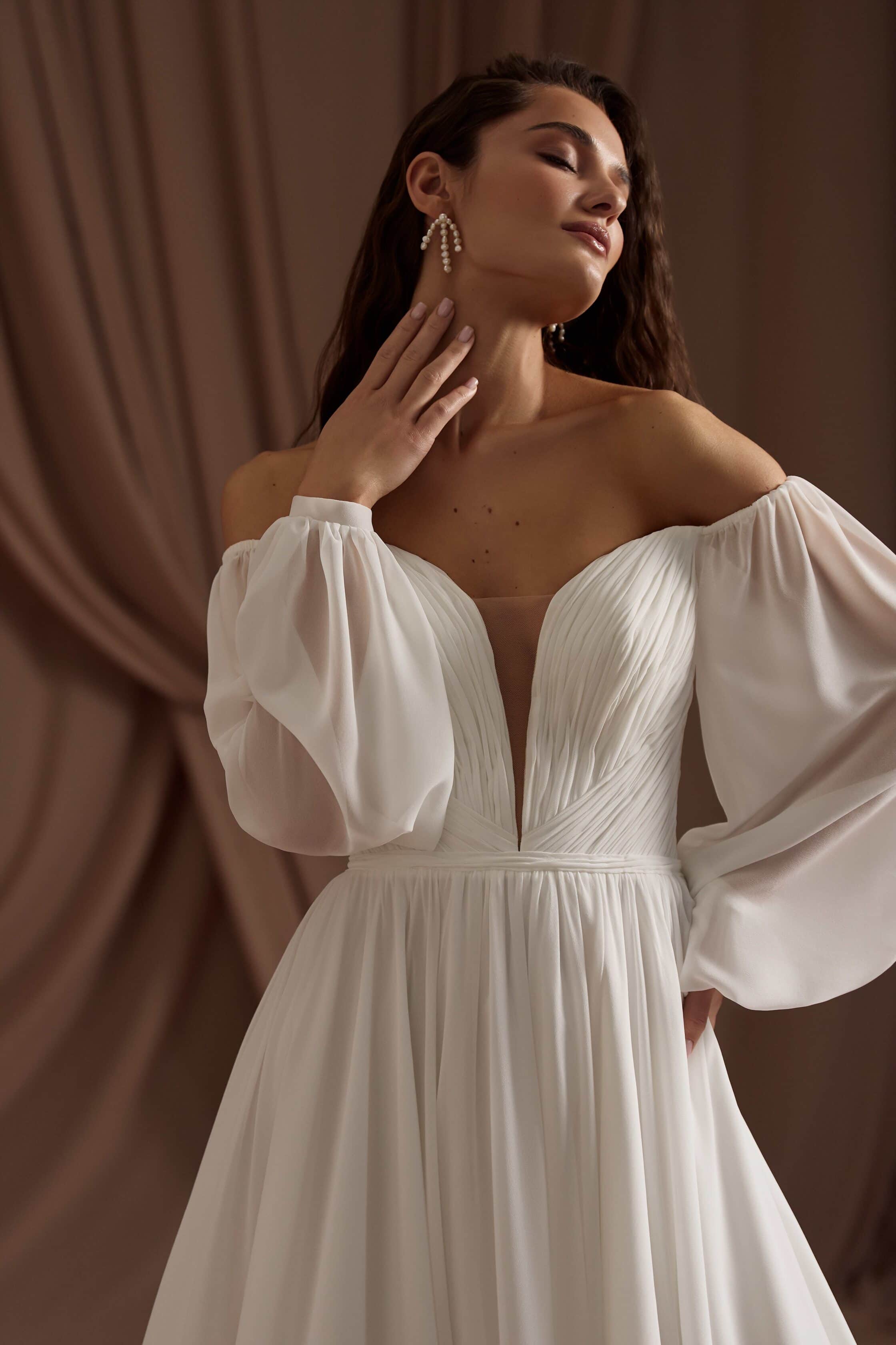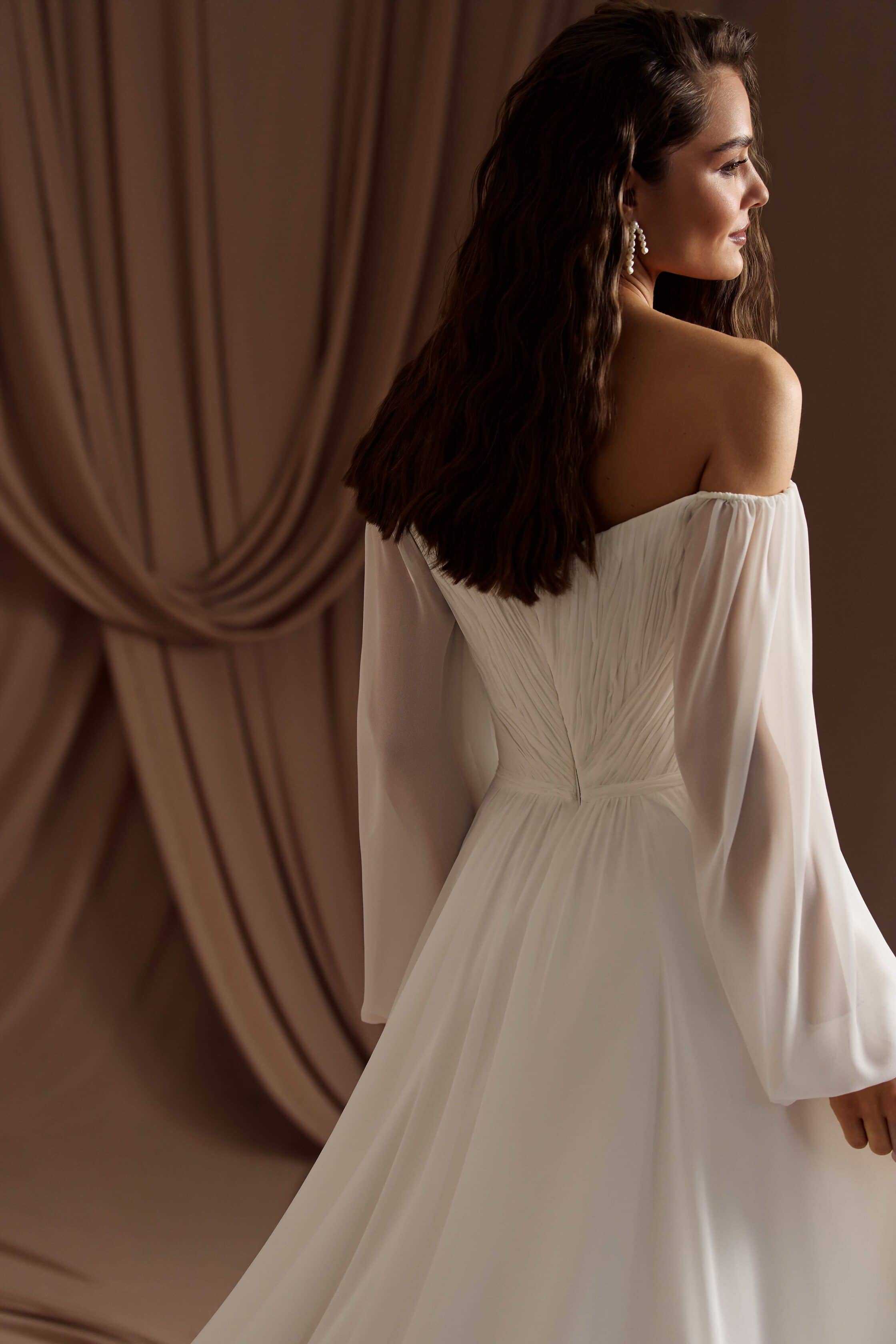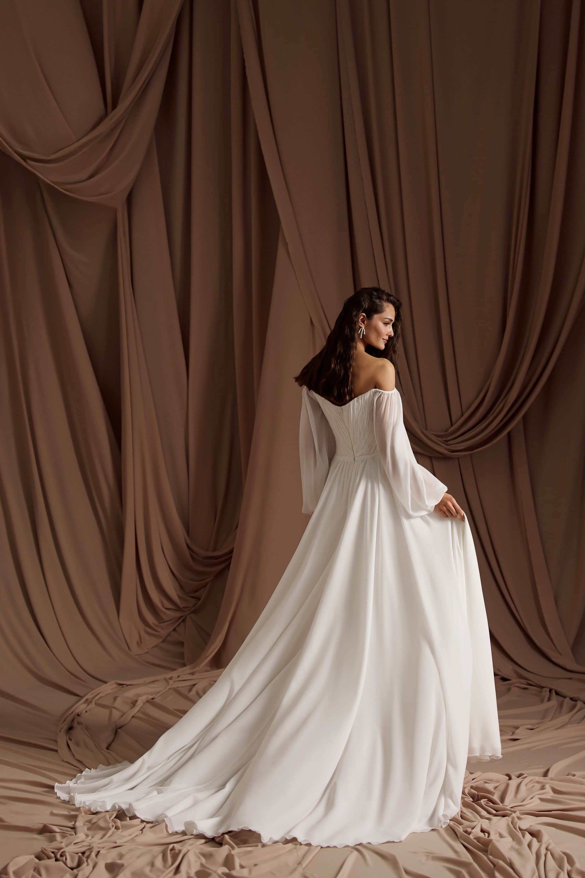 Rochia Julia întruchipează visul unei apariții poetice, delicate și complet atemporale. Cu un design inspirat din naturalețea pură a stilului boho, această rochie mizează pe lejeritate, fluiditate și o senzualitate discretă. Bustul tip corset cu drapaj fin este completat de mânecile căzute, ample și transparente, care accentuează eleganța umerilor și creează o aură de libertate și grație. Fusta vaporoasă din voal curge cu mișcare naturală în jurul corpului, iar trena amplă completează tabloul unei rochii desprinse dintr-un basm modern. Julia este alegerea ideală pentru mireasa care visează la o nuntă în aer liber, în lumina caldă a apusului sau sub bolta unei păduri romantice.