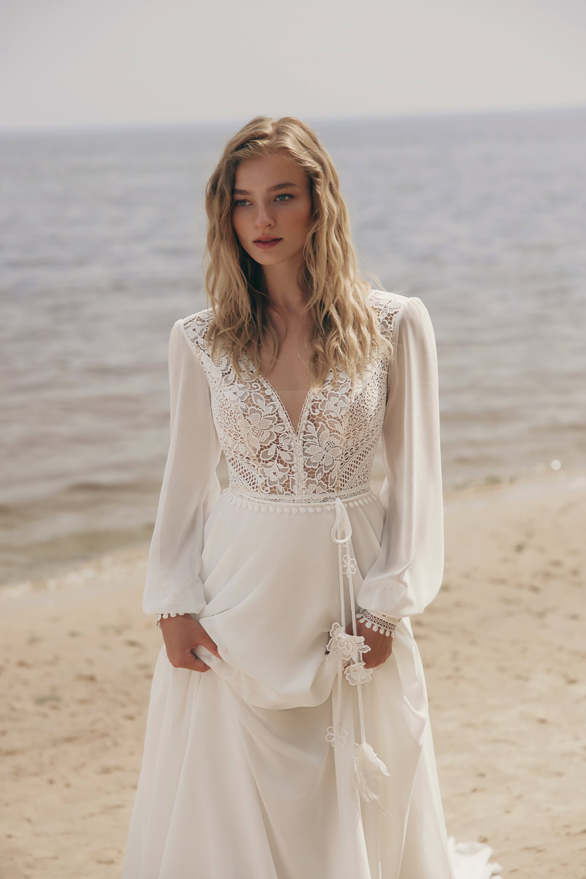 Rochia de mireasă Just The Two of Us este alegerea perfectă pentru miresele care iubesc naturalețea, feminitatea și delicatețea discretă. Confecționată din voal fluid și dantelă florală brodată, această rochie încântă prin simplitatea elegantă a croiului A-line și liniile curate care curg ușor odată cu mișcarea. Bustul cu decolteu în V adânc este completat de mâneci lungi din voal fin, iar spatele decupat în formă de V, ornat cu nasturi și fundă delicată, adaugă o notă romantică și rafinată. Cordonul subțire accentuează talia, iar trena ușoară oferă un plus de grație siluetei. Este rochia ideală pentru o nuntă în aer liber, unde atmosfera este caldă și sinceră, exact ca iubirea adevărată.