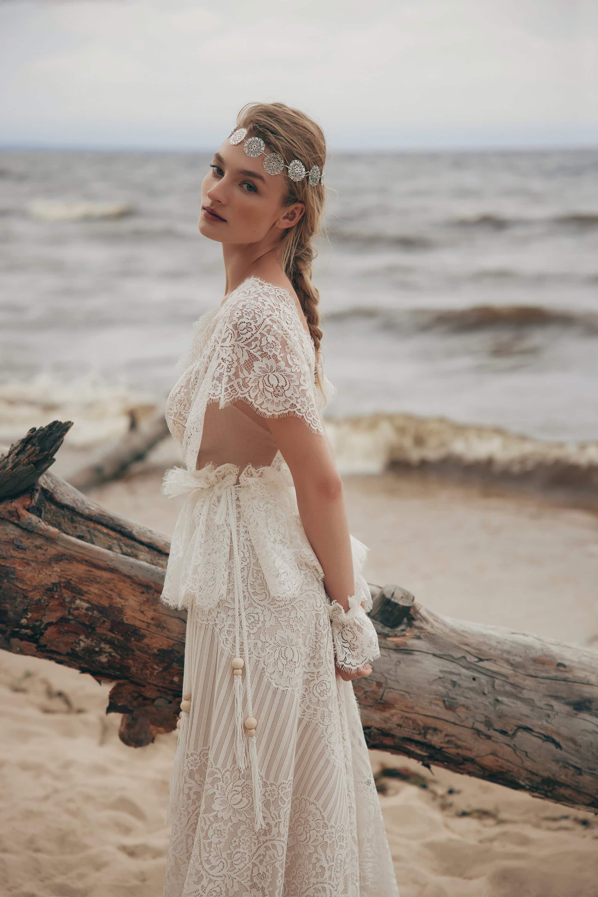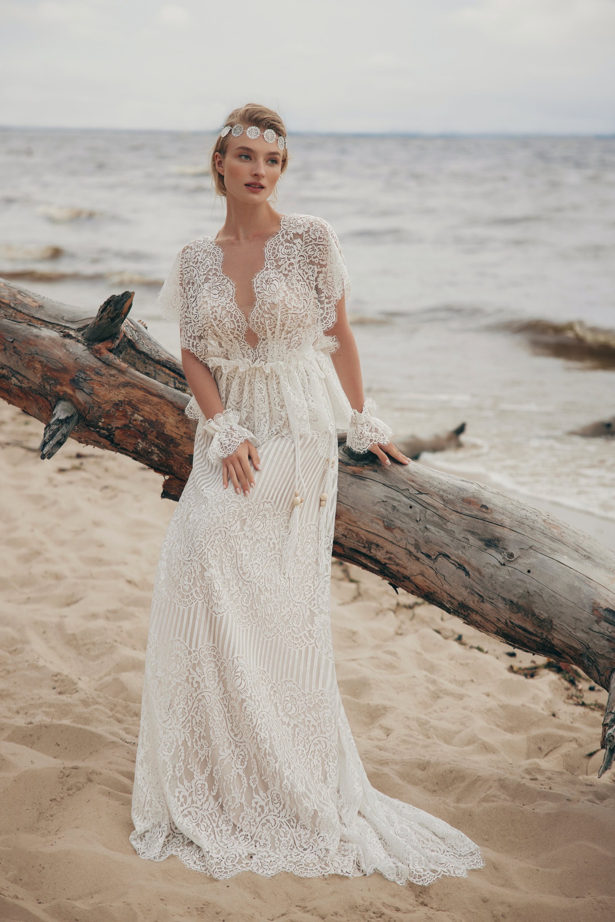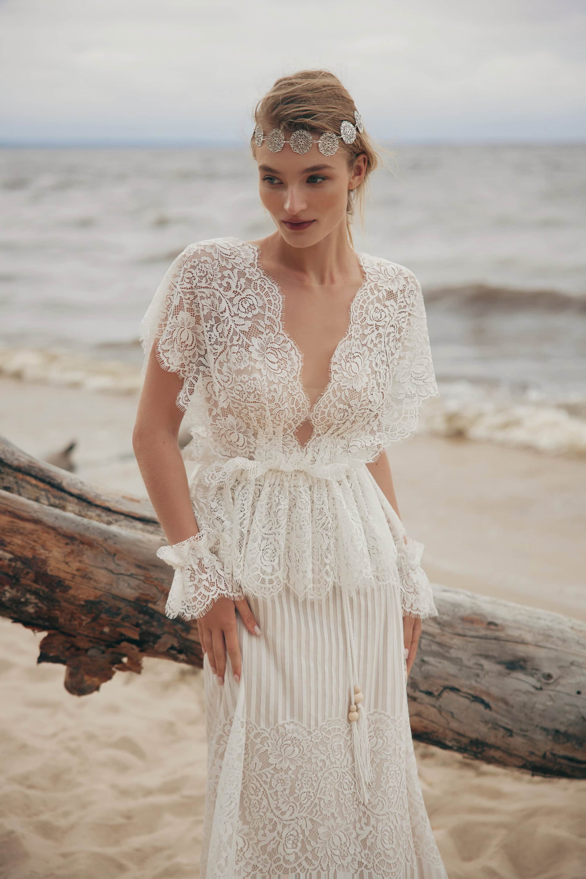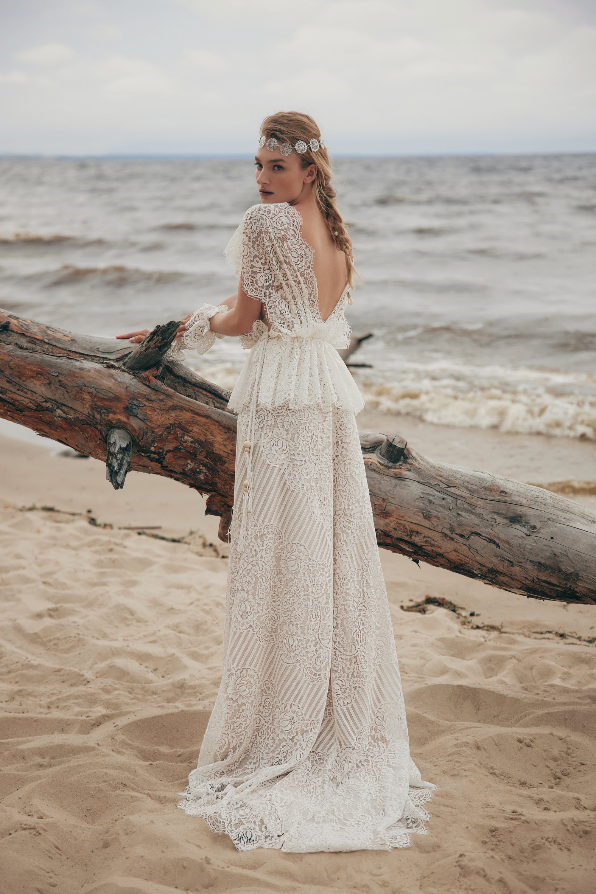 Rochia de mireasă Liberian Girl este o reinterpretare boemă și romantică a eleganței vintage, creată pentru miresele care își doresc un look diafan, natural și artistic. Confecționată dintr-o dantelă bogată, cu motive florale mari și delicate inserții cu dungi verticale, această rochie mângâie silueta într-un mod fluid și lejer. Corsajul lejer, cu mâneci scurte tip fluture, este accentuat de un peplum din dantelă care conturează talia, adăugând o notă de feminitate subtilă. Spatele adânc în formă de V se termină cu o legătură fină din panglică, iar ciucurașii cu mărgele naturale completează perfect estetica boho chic. Cu o fustă amplă, ce cade în valuri moi până la sol, această rochie este ideală pentru o nuntă în natură, la malul mării sau într-un cadru rustic cu suflet artistic.