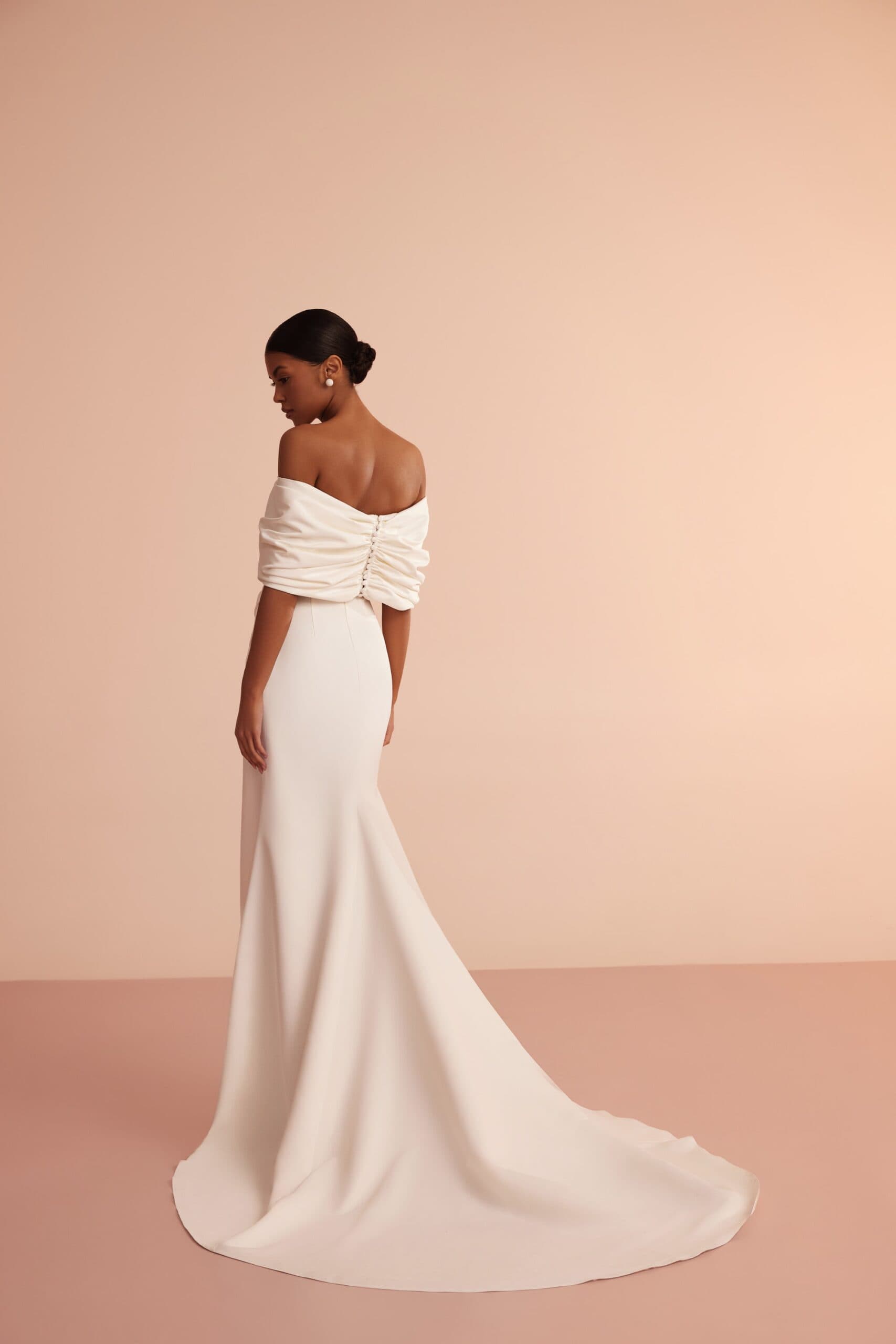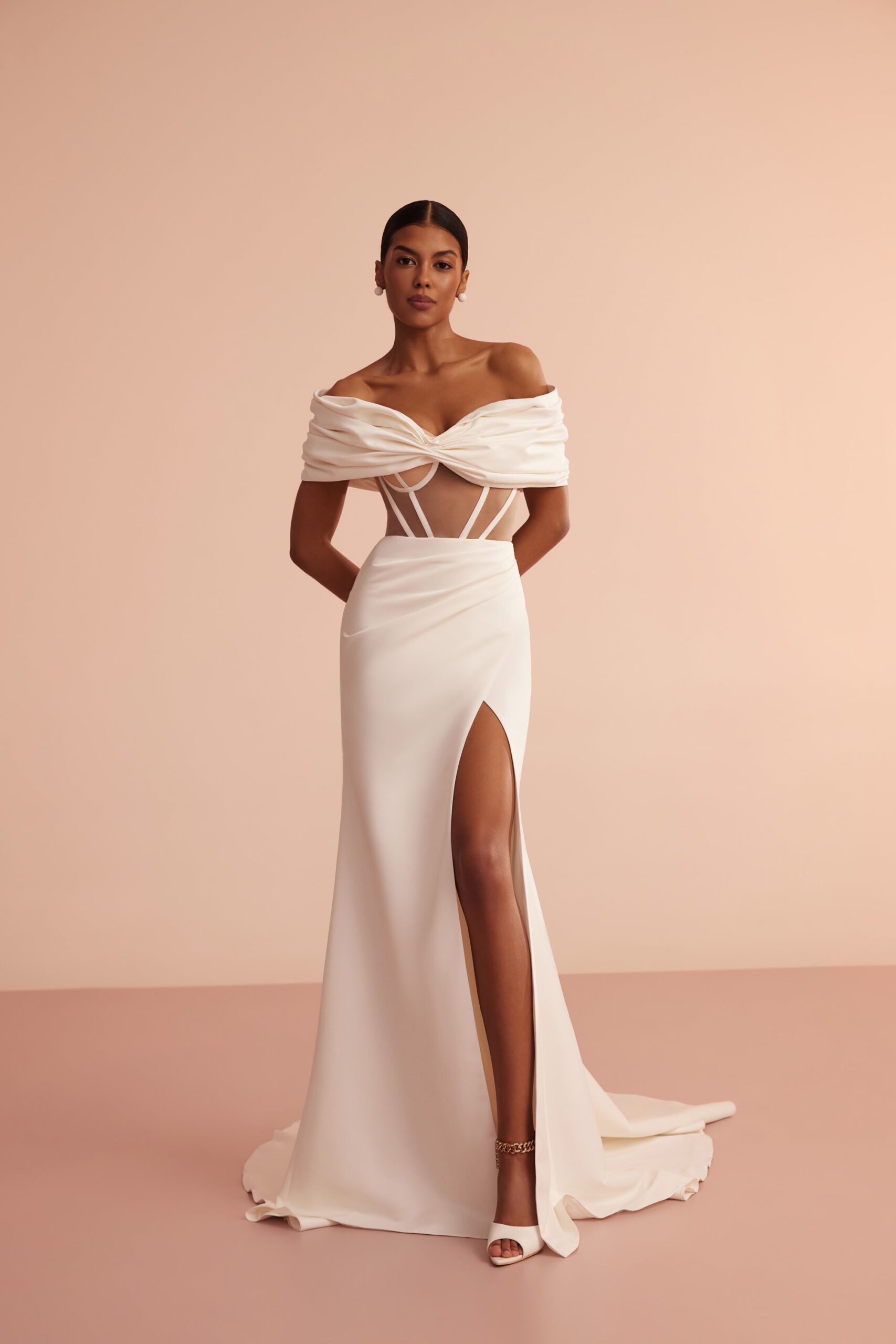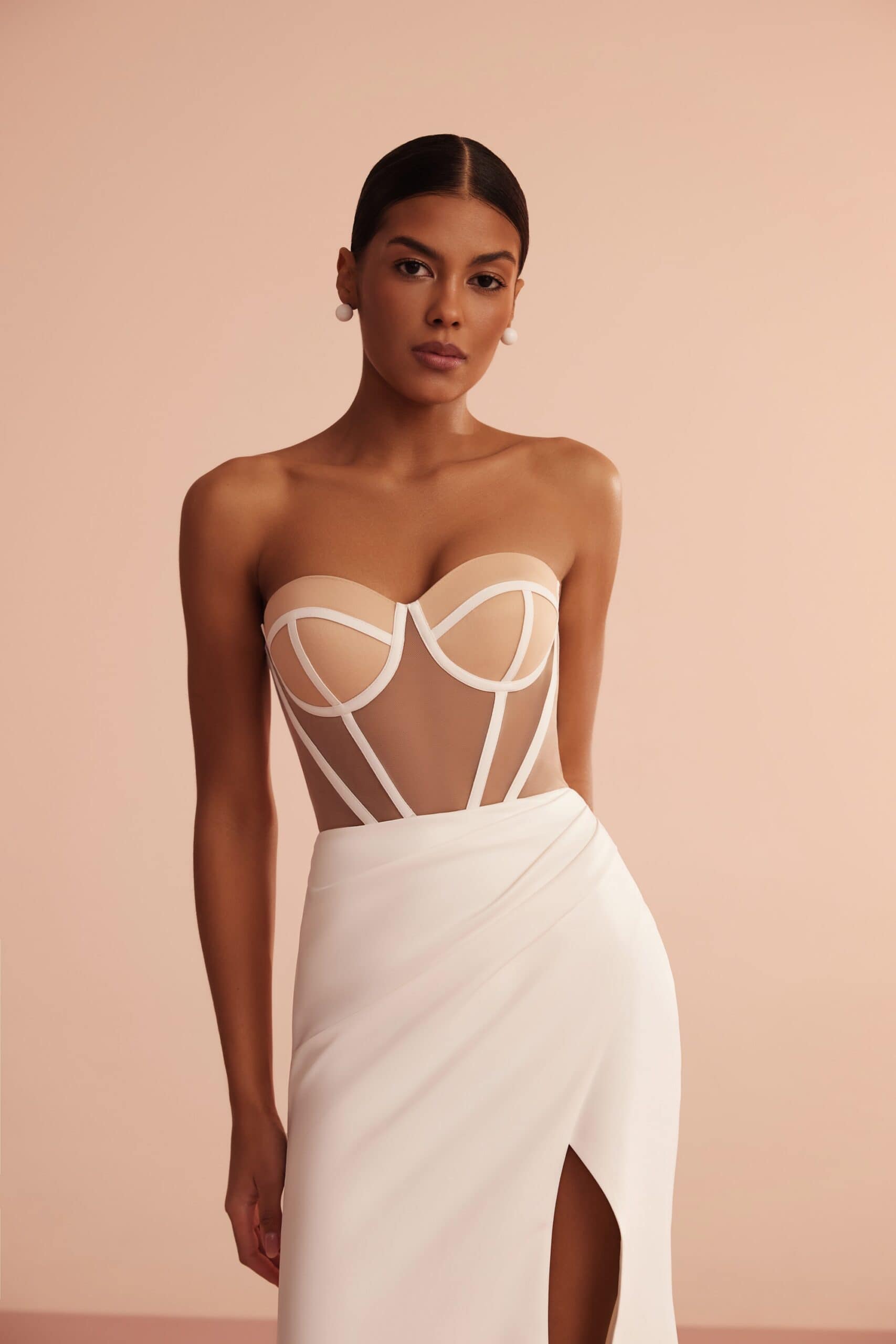 Rochia Light Dress 419 este o apariție puternică și memorabilă, construită pentru mireasa care caută un mix rar între senzualitate, structură couture și eleganță modernă. Bustul este modelat din drapaje ample, care se așază delicat pe umeri și creează un efect sculptural, în timp ce zona taliei dezvăluie detalii transparente ce subliniază linia corpului fără a pierde din rafinament. Fusta fluidă, cu slit înalt, conferă mișcare și alungire, iar spatele lejer decupat completează designul cu o notă sofisticată și echilibrată. Light Dress 419 transformă fiecare pas într-o declarație de stil — o alegere ideală pentru mireasa care dorește o apariție sigură, îndrăzneață și impecabil stilizată.