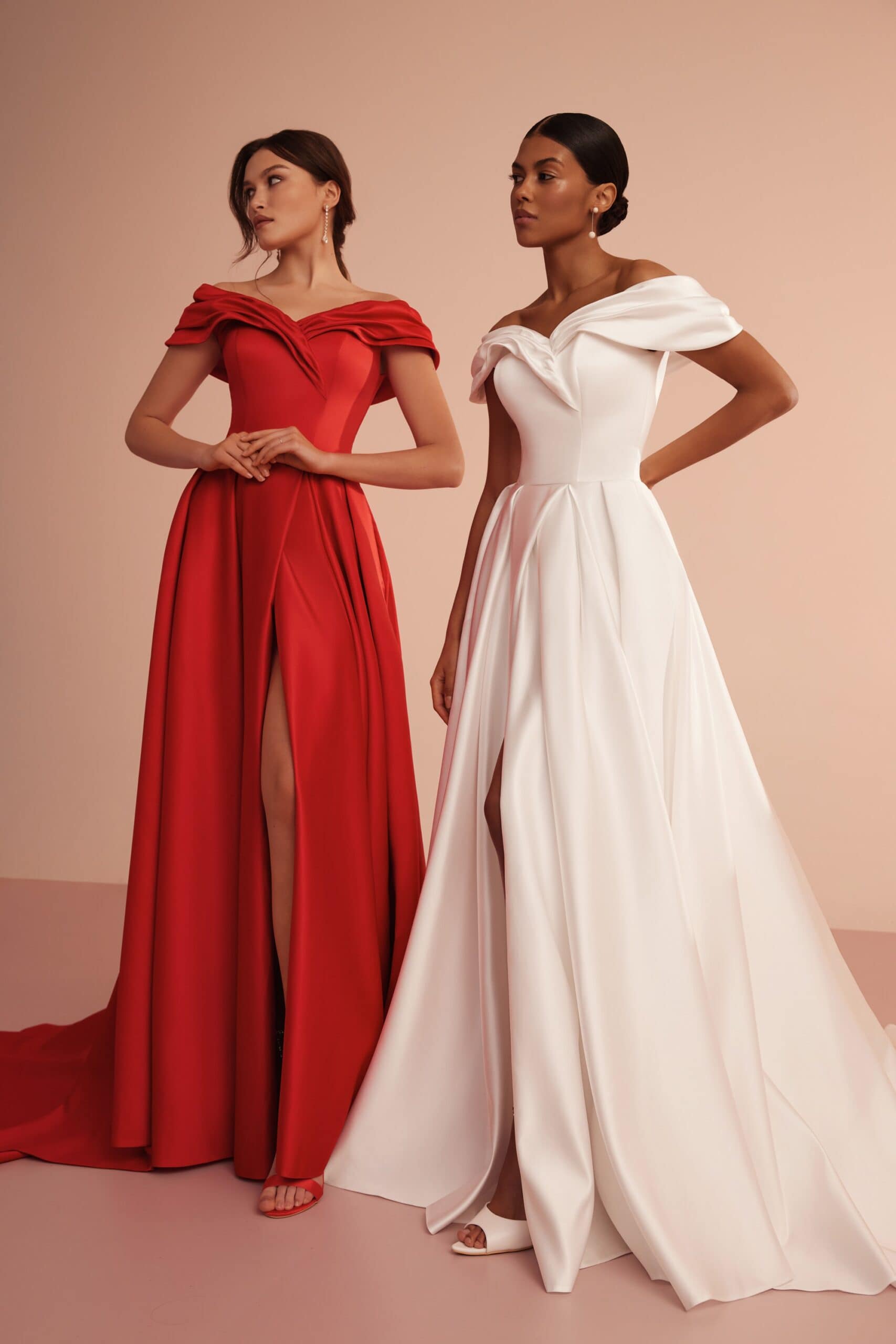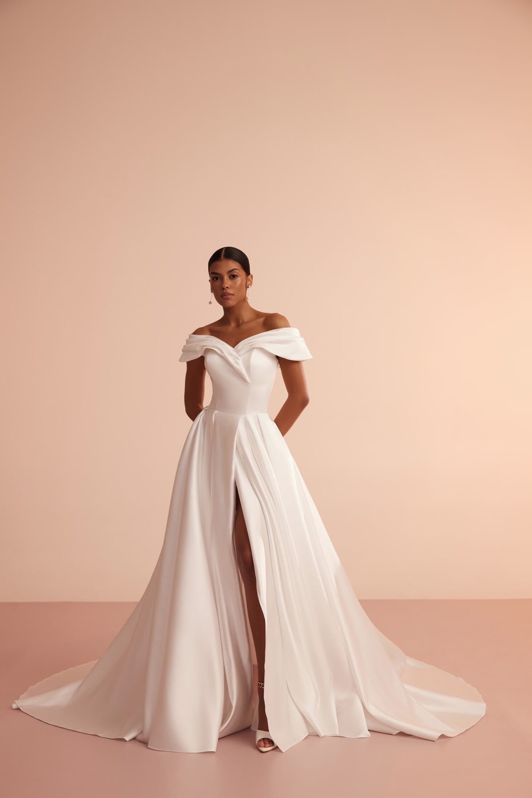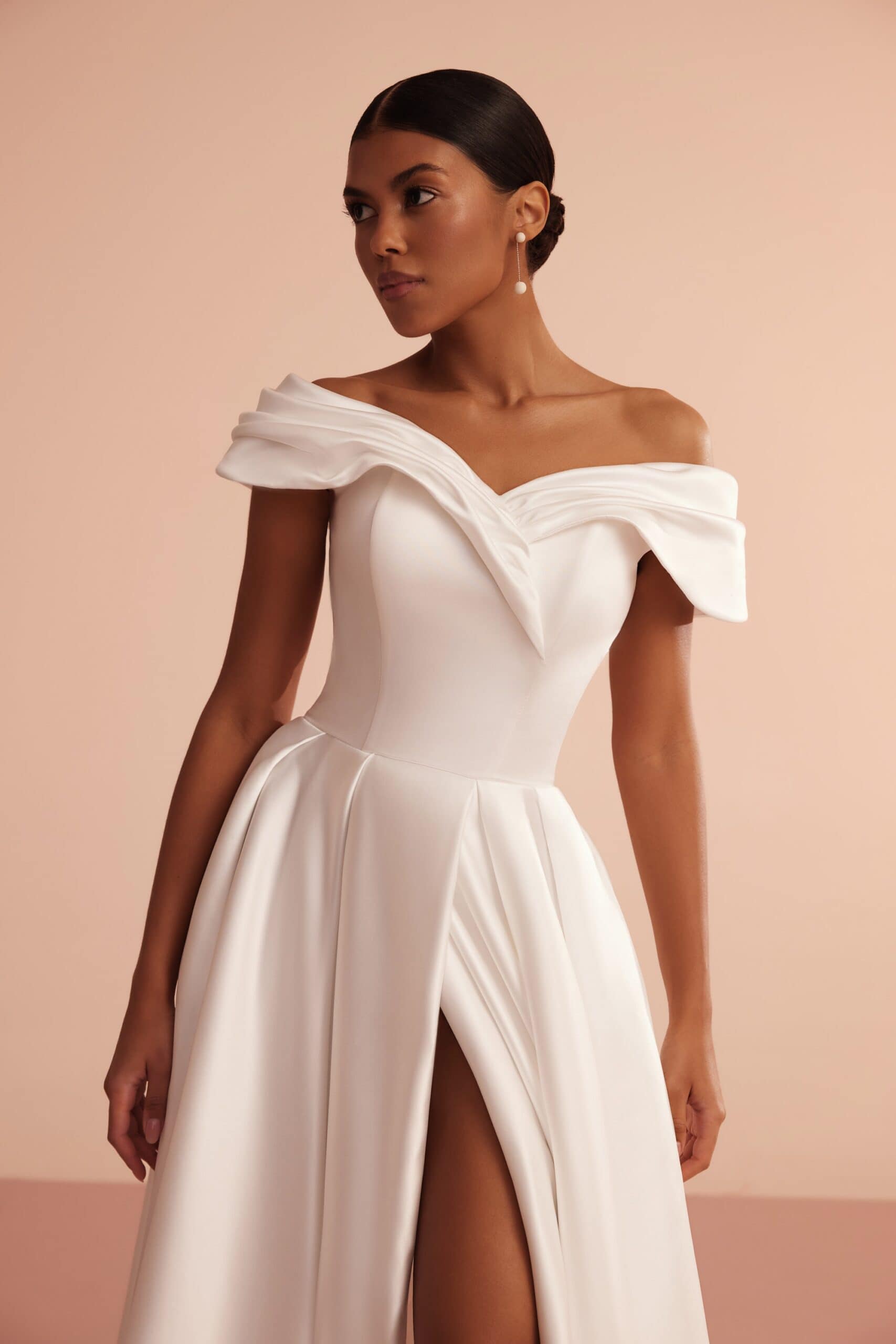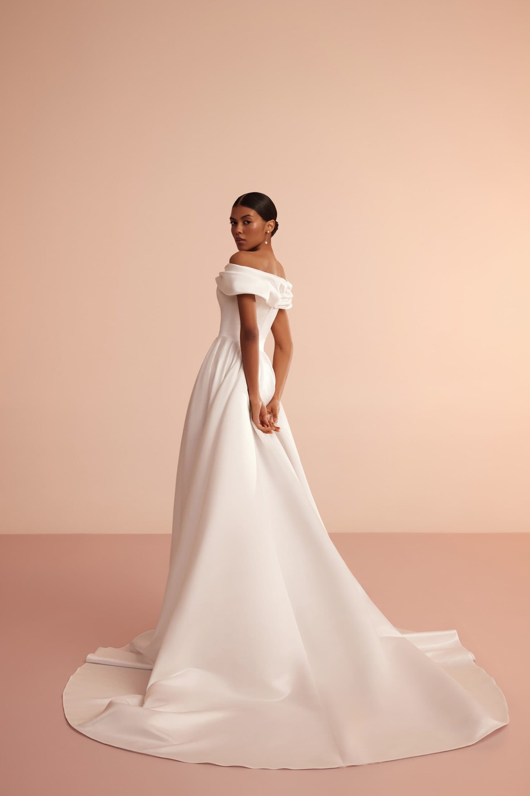 Rochia de mireasă Light Dress 426 aduce un rafinament sculptural care transformă minimalismul într-o declarație de eleganță modernă. Bustul modelat în stil off-the-shoulder, construit din falduri arhitecturale perfect definite, creează o linie sofisticată ce pune în valoare zona umerilor. Fusta amplă, cu deschidere frontală fluidă, adaugă dinamism siluetei și conferă piesei un aer de opulență contemporană, în timp ce proporțiile impecabile mențin puritatea unui design couture atemporal.