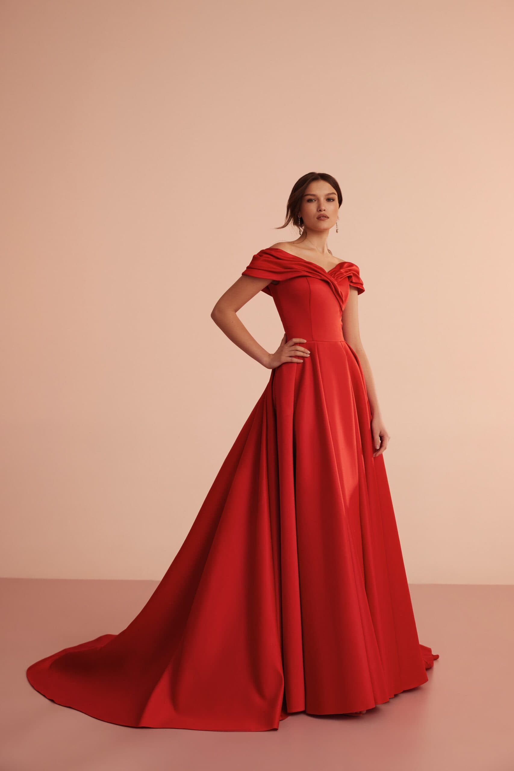 Detalii: fustă amplă cu crepeu frontal, bust sculptat în plieri couture