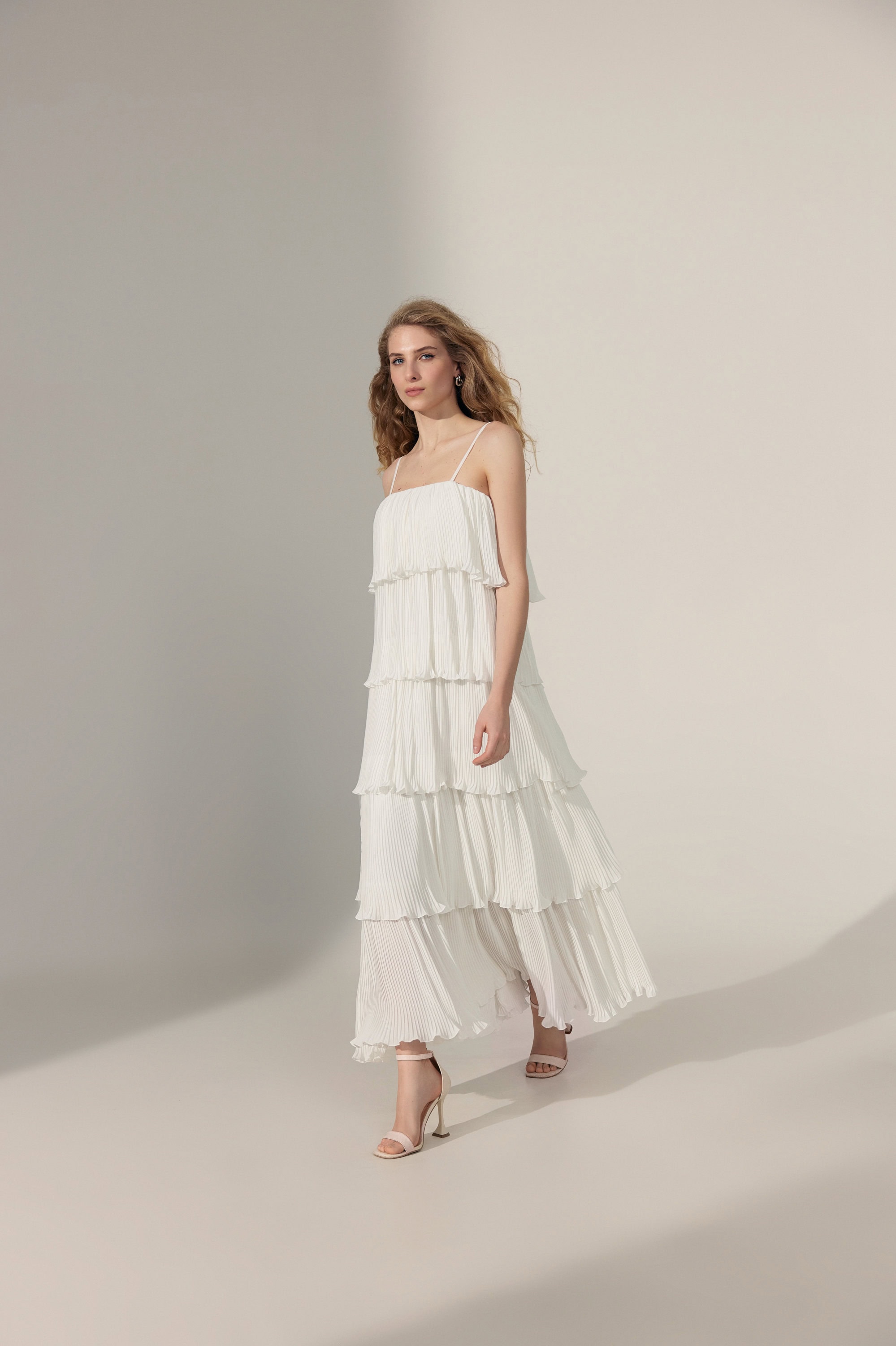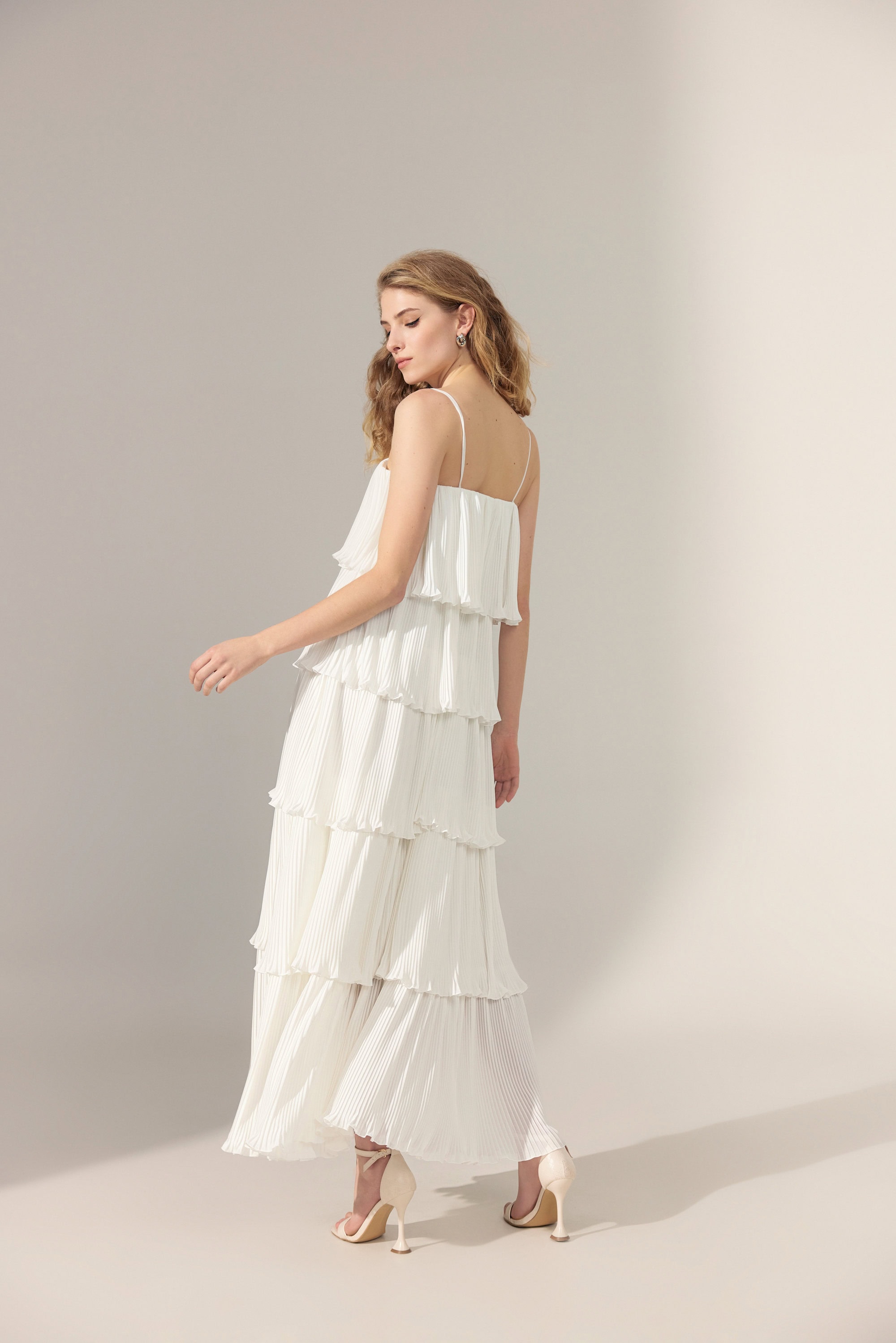 Rochia Light Dress 525 emană lejeritate, prospețime și rafinament boem, fiind alegerea ideală pentru o mireasă modernă care iubește naturalețea. Realizată din straturi delicate de plisat fin, rochia creează o mișcare fluidă și un joc subtil de volum. Bretelele subțiri și croiala aerisită aduc un aer romantic, fără efort, perfect pentru o ceremonie civilă sau o petrecere estivală. Fiecare pas devine o unduire de lumină și grație.