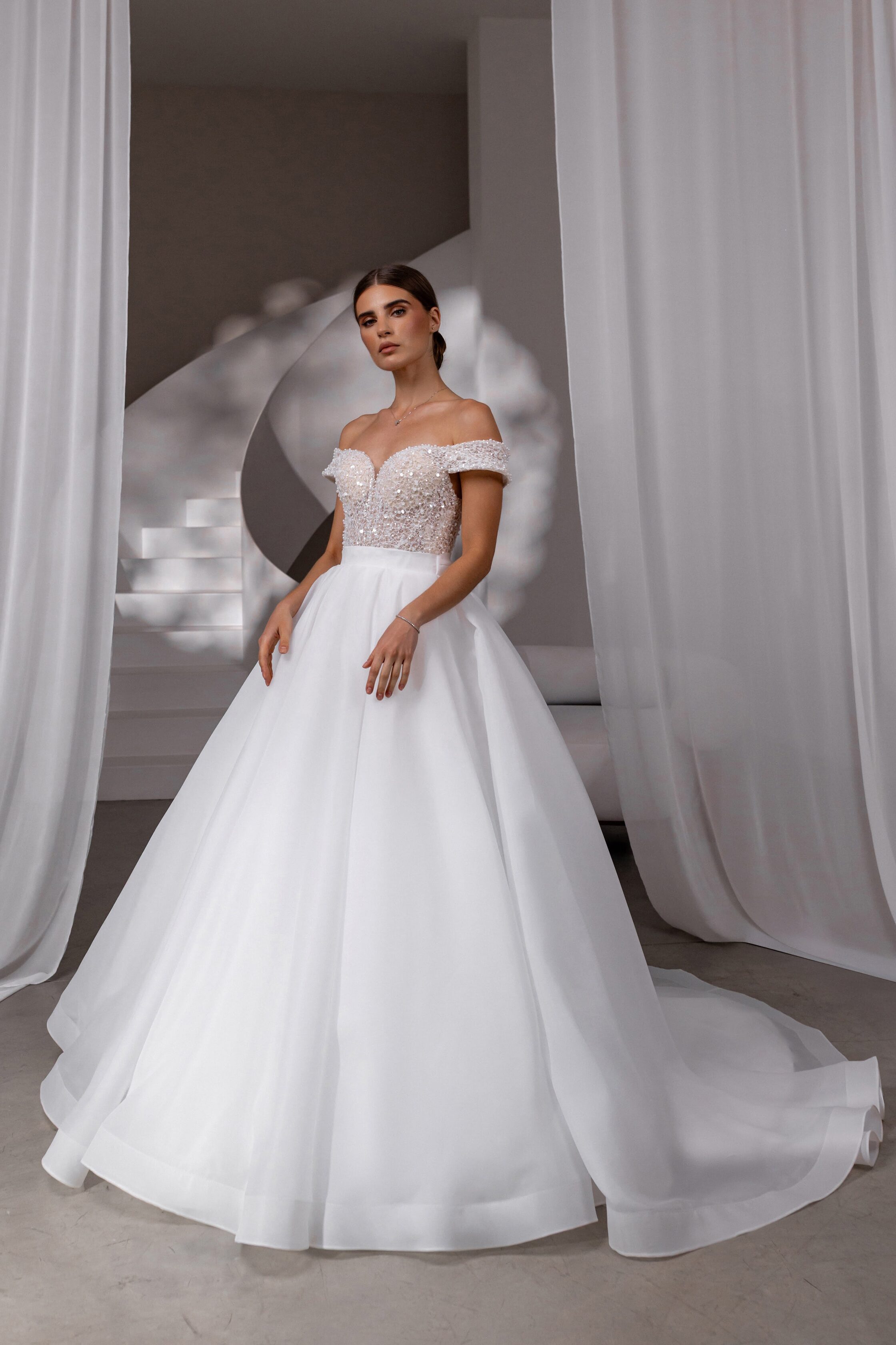 Rochia de mireasă Lume (mărimea 40) emană romantism și rafinament prin detalii atent lucrate și un design ce îmbină delicatețea cu eleganța clasică. Corsetul este decorat cu o broderie bogată din paiete și mărgele, ce conferă un efect subtil de strălucire și textură, în timp ce decolteul în inimă conturat de mânecuțele căzute pune în evidență linia umerilor cu grație. Fusta amplă din organza fină completează silueta de tip ball gown, oferind un plus de volum și lejeritate. Spatele este deschis, cu un sistem de închidere cu șiret ce adaugă un aer sofisticat, fiind completat de o fundă delicată plasată în talie.