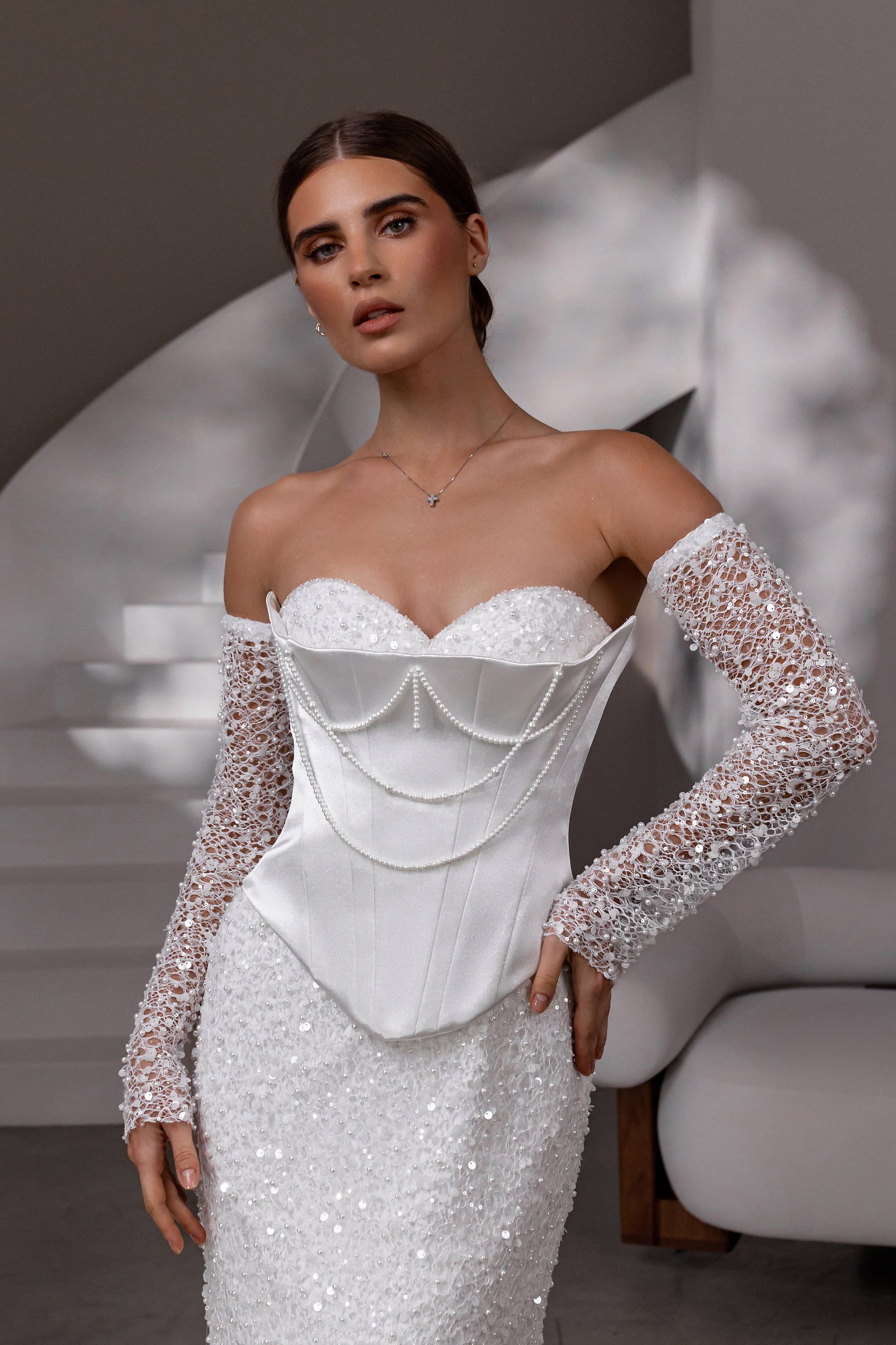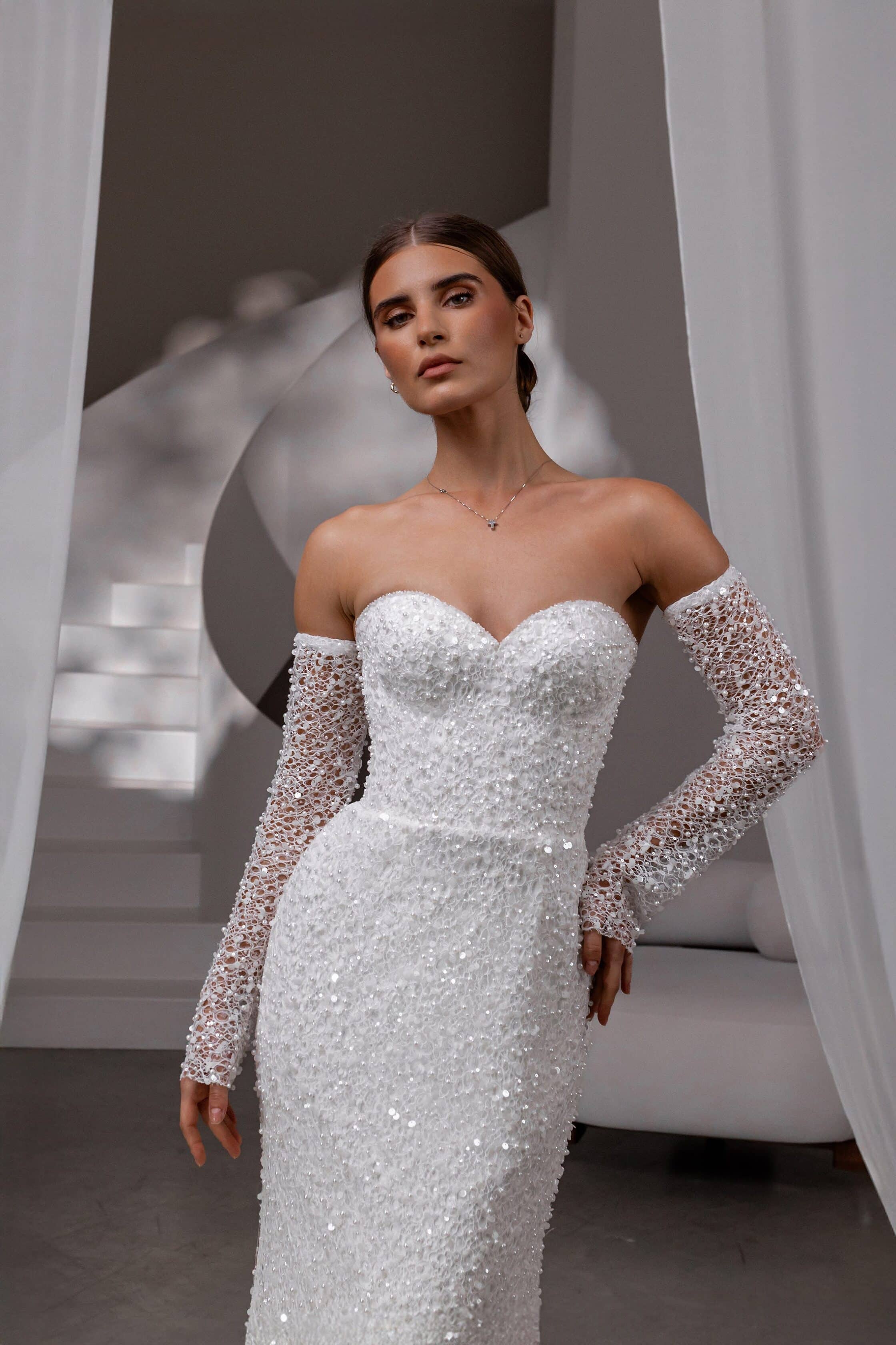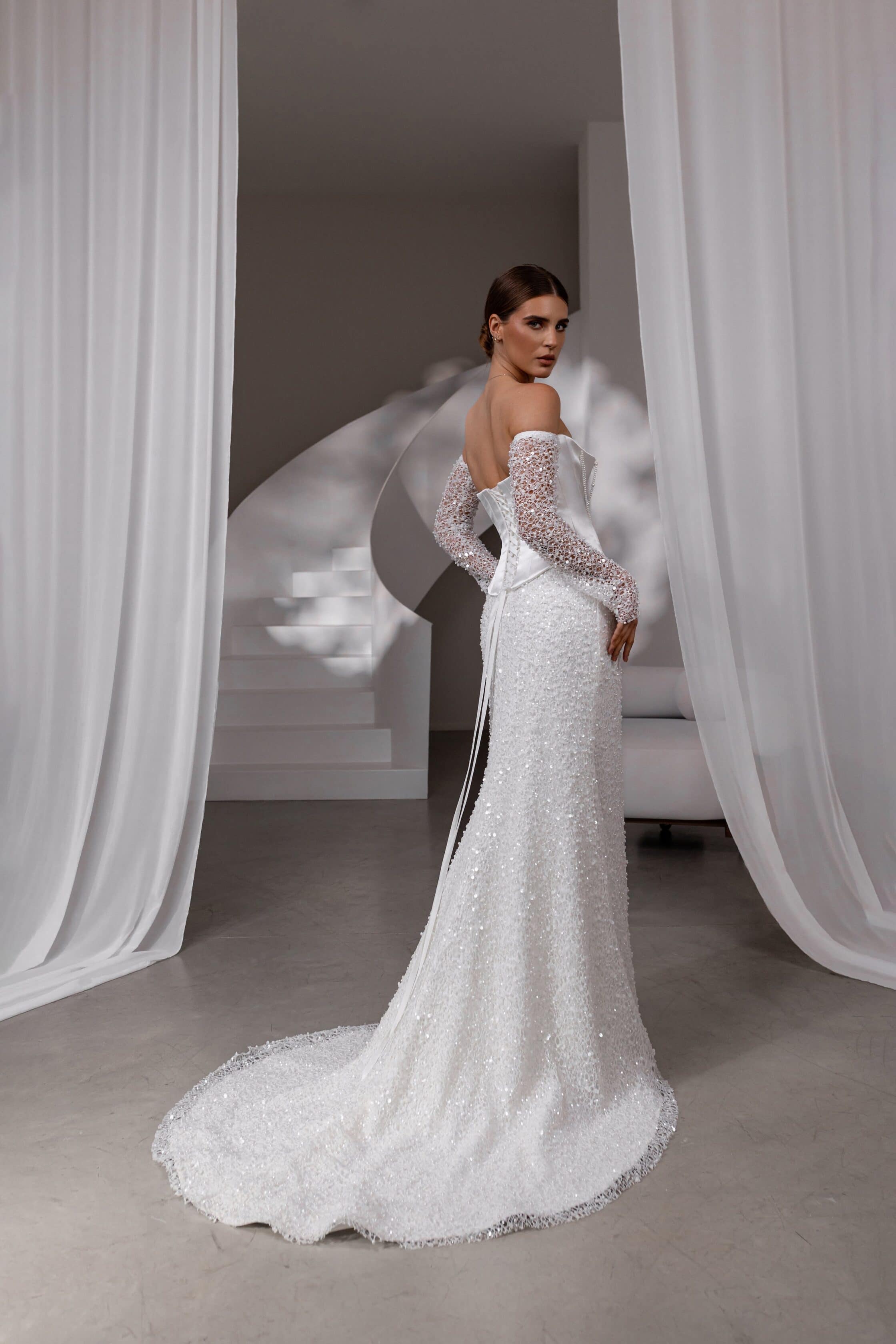 Rochia de mireasă Lys Blanc, are o croială tip sirenă, care îmbină perfect stilul modern cu rafinamentul clasic. Fiecare detaliu este gândit pentru a evidenția frumusețea siluetei, iar corsetul detașabil tip bustieră, întărit cu balene, oferă suport și contur. Talia alungită în formă de V subliniază eleganța, în timp ce materialul luxos, decorat cu paiete și perle fine, strălucește sublim în lumina nopții. Mânecile detașabile din material fin, de asemenea decorat cu paiete, adaugă un plus de glam și versatilitate, iar trena discretă completează acest look sofisticat, perfect pentru o zi de neuitat.