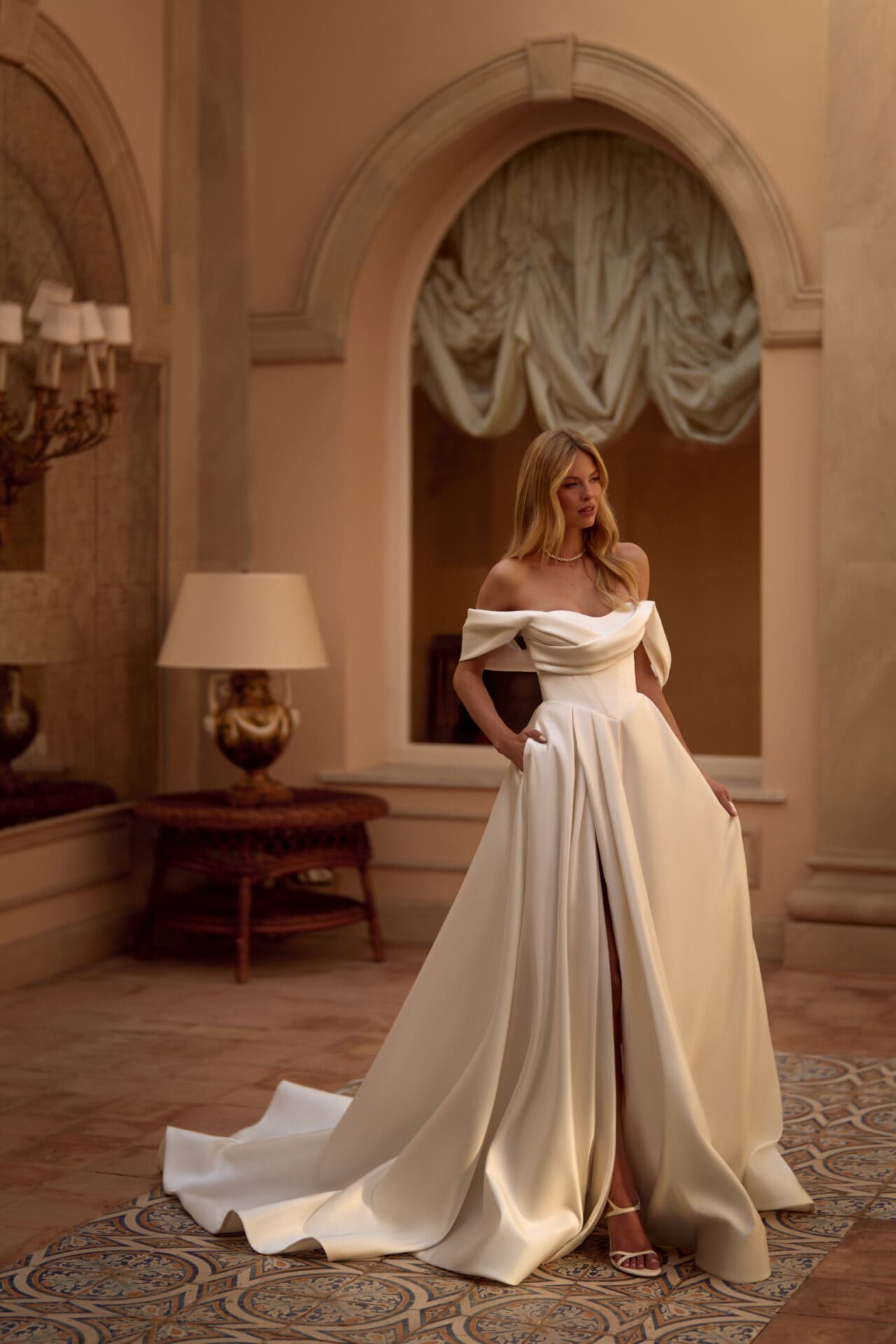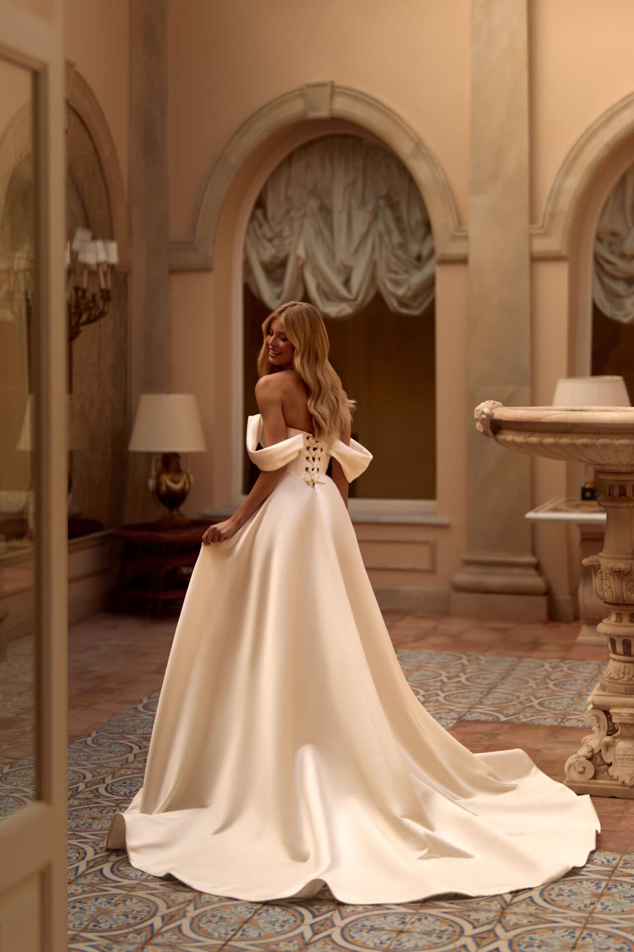 Rochia Metelika impresionează printr-un design sculptural și o eleganță desprinsă din vis. Bustul drapat, cu linie off-shoulder, pune în valoare umerii și gâtul într-o manieră regală, iar fusta amplă din material dens creează o mișcare fluidă, sofisticată. Croiala evidențiază talia și conferă o prezență impunătoare, dar extrem de feminină. O creație care îmbină echilibrul dintre arhitectură și romantism — perfectă pentru o mireasă modernă cu spirit clasic.
