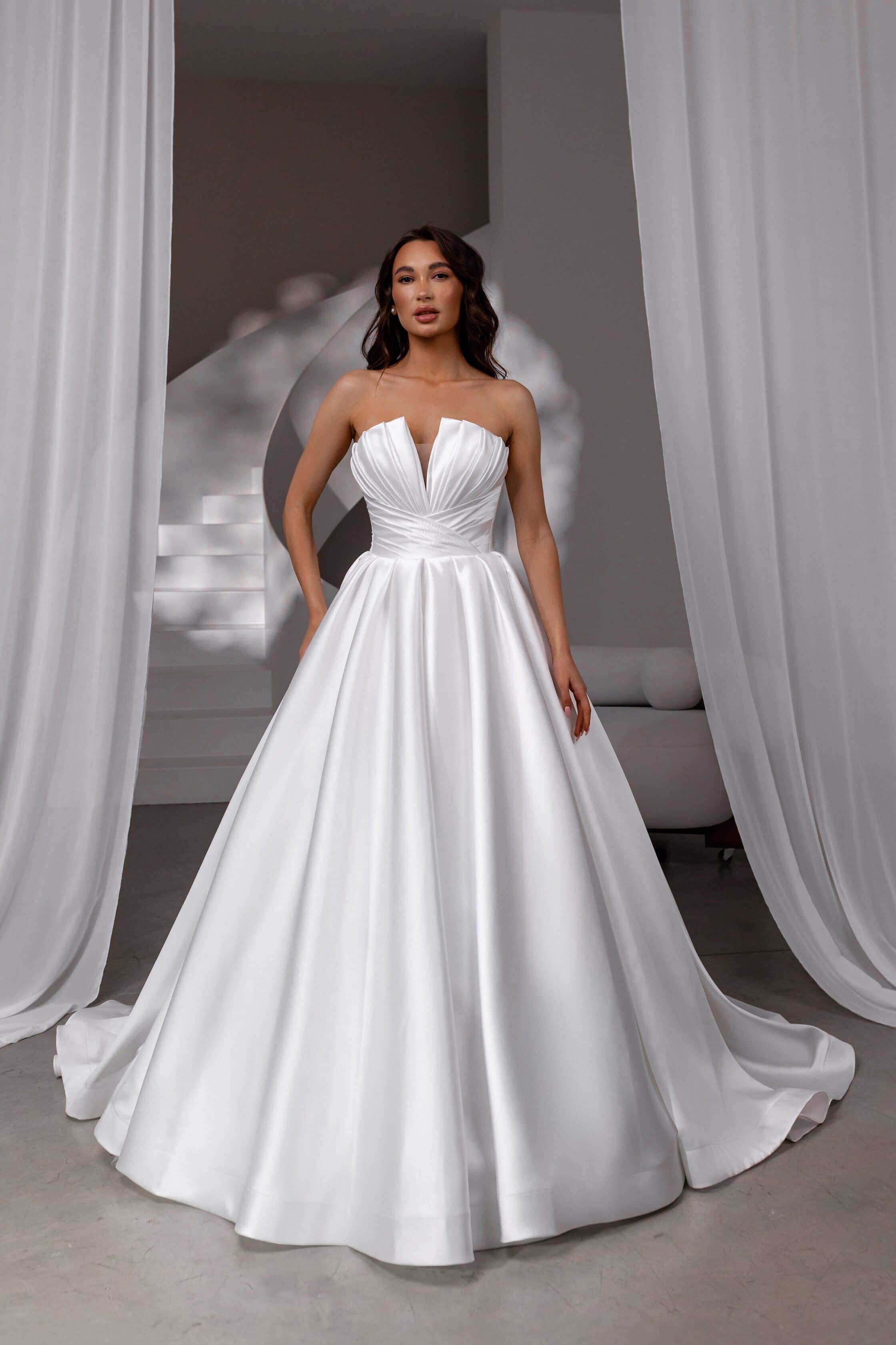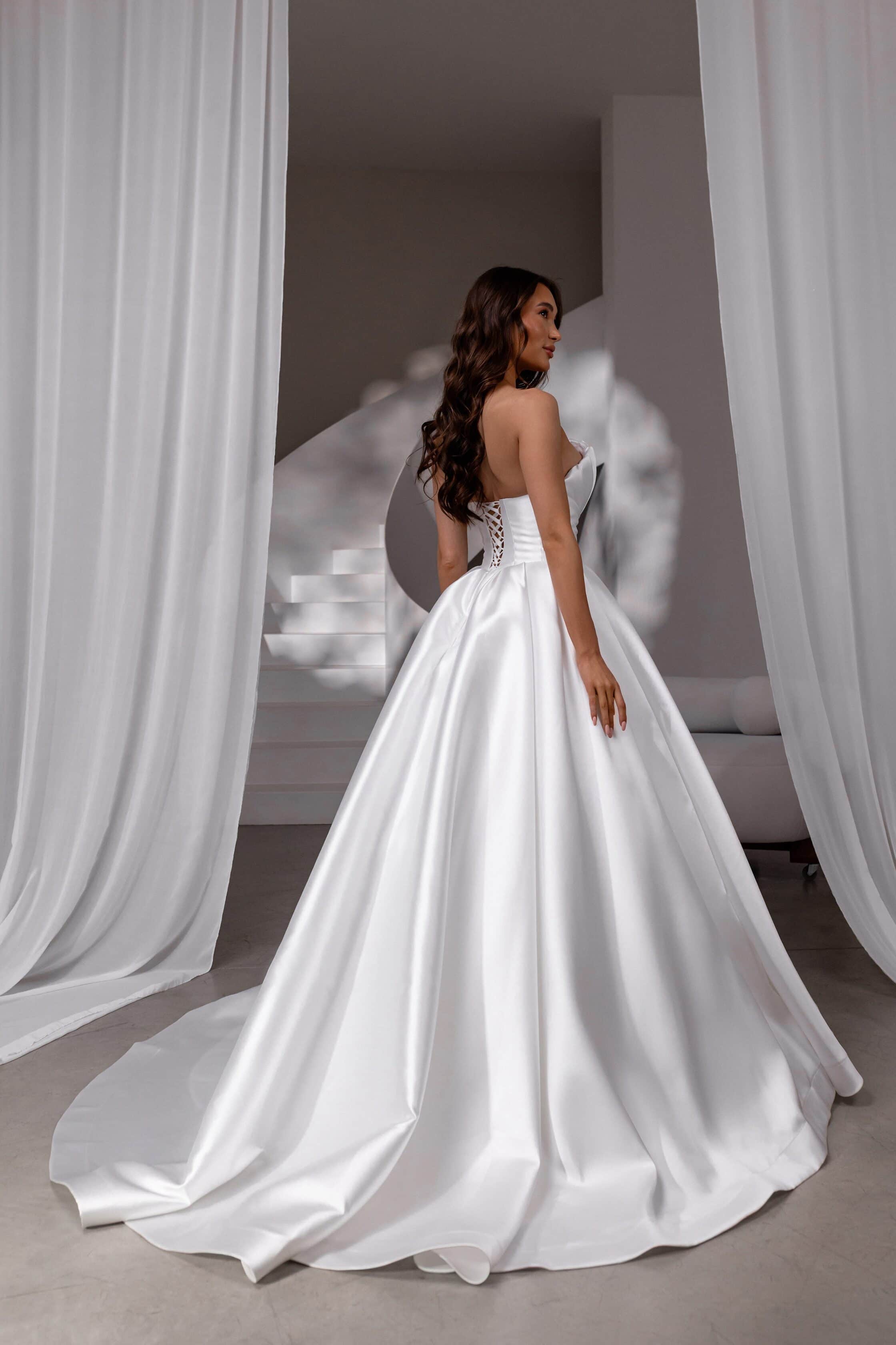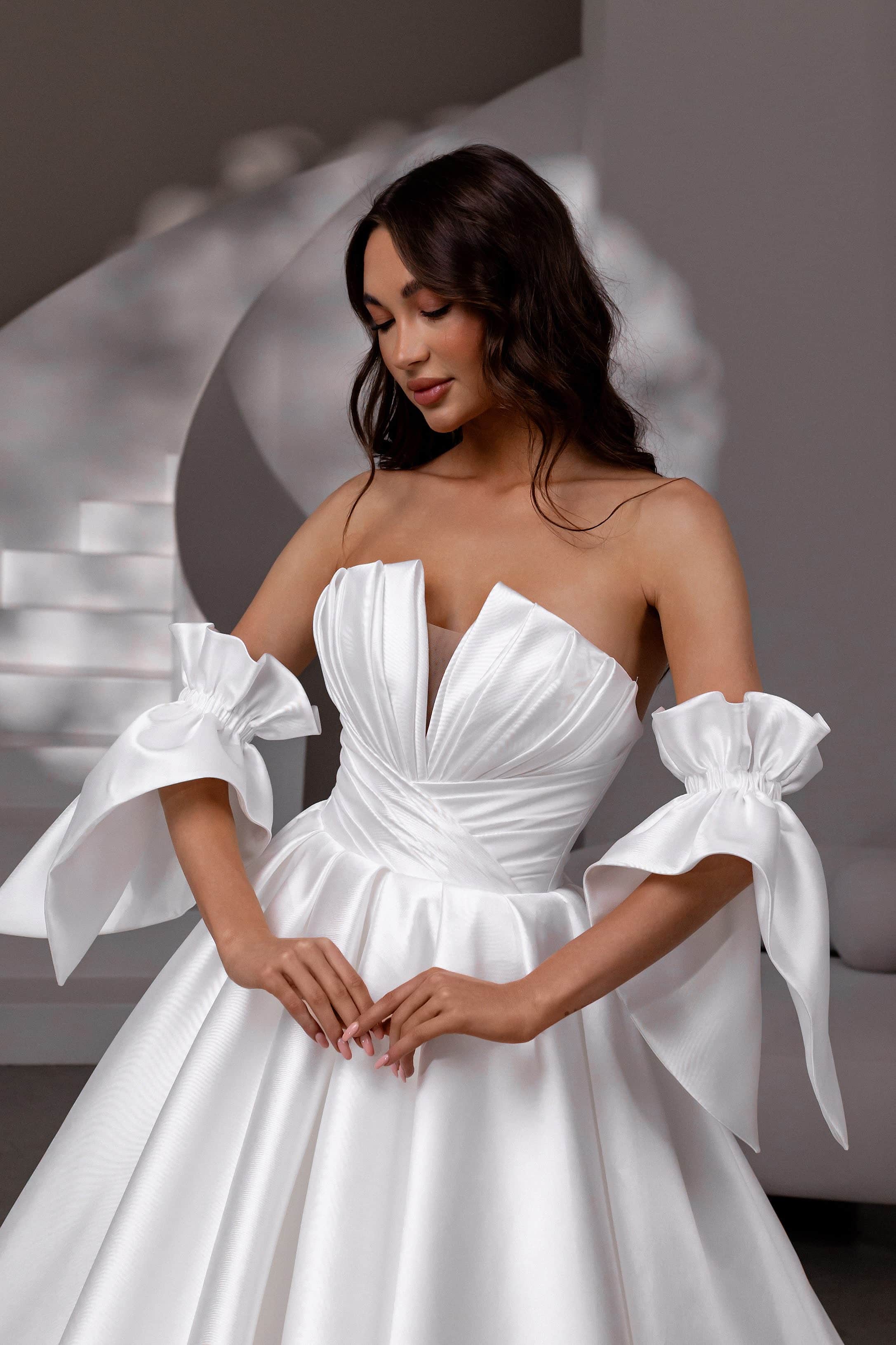 Rochia Monro Vero cucerește prin echilibrul dintre dramatismul unei siluete prințesă și delicatețea detaliilor couture. Corsetul tip petrecut atrage atenția prin pensele adânci ce creează un efect arhitectural și evidențiază bustul într-un decolteu adânc, tip inimă. Mânecuțele detașabile, decorate cu volane ample și funde romantice, oferă versatilitate și un aer teatral. Fusta amplă din tafta mikado satinată adaugă structură și fluiditate, completând perfect liniile elegante ale corsetului. Închiderea la spate, cu un corset cu șiret, asigură o potrivire impecabilă. Ideală pentru mireasa care își dorește un look sofisticat, dar cu un accent îndrăzneț.