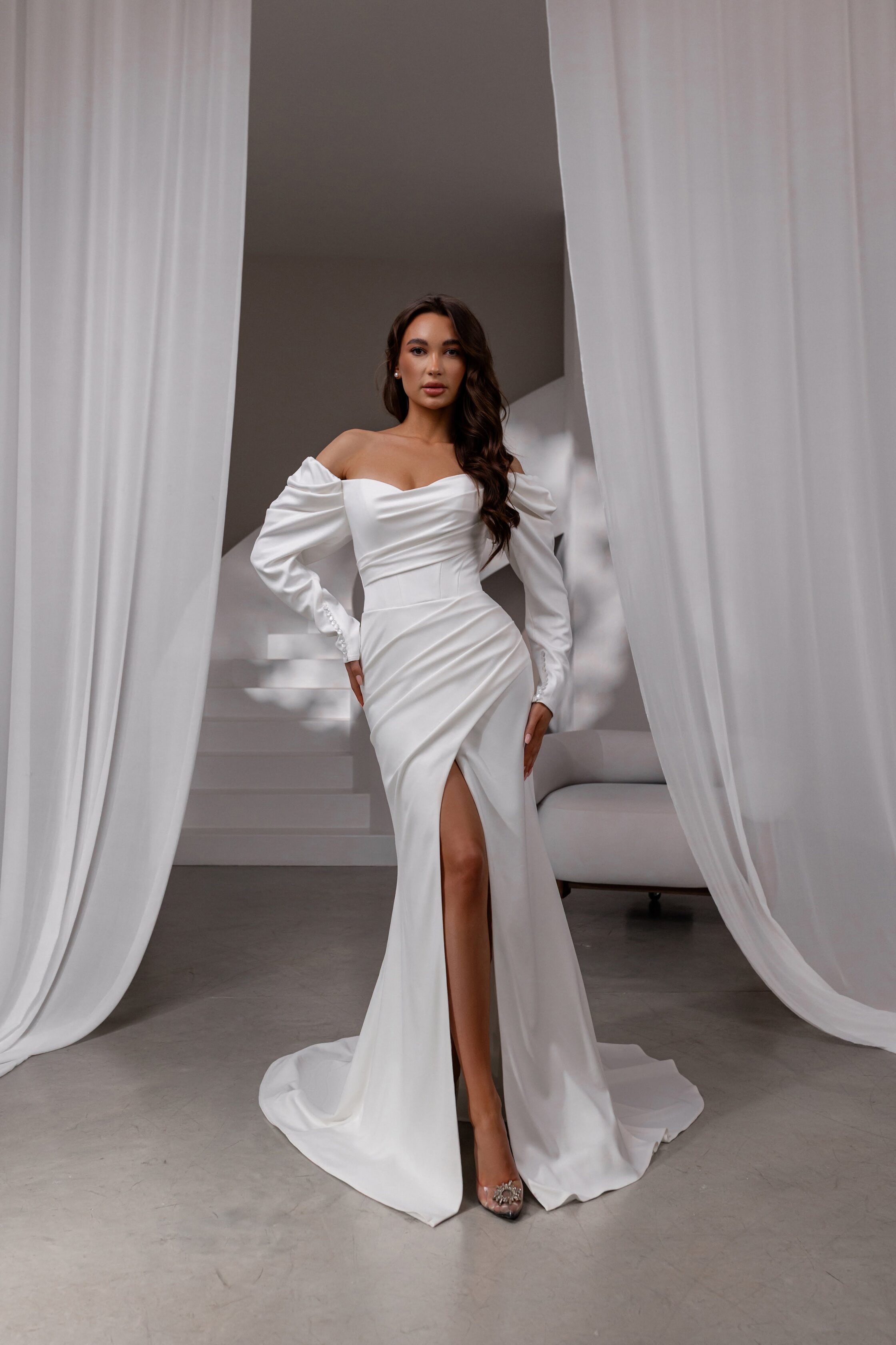 Rochia de mireasă Murmure impresionează prin eleganța sa minimalistă și senzualitatea subtilă a croiului. Realizată dintr-un material satinat cu textură moale și cădere impecabilă, rochia urmărește linia corpului într-un mod rafinat. Corsetul drapat evidențiază zona bustului și talia, creând un efect sculptural, în timp ce mânecile lungi, ușor bufante și căzute pe umeri, adaugă un aer romantic și sofisticat. Crăpătura adâncă pe picior oferă un detaliu îndrăzneț și modern, echilibrând perfect clasica siluetă a unei rochii sirenă. Murmure este alegerea ideală pentru mireasa care caută un look contemporan, dar profund feminin.