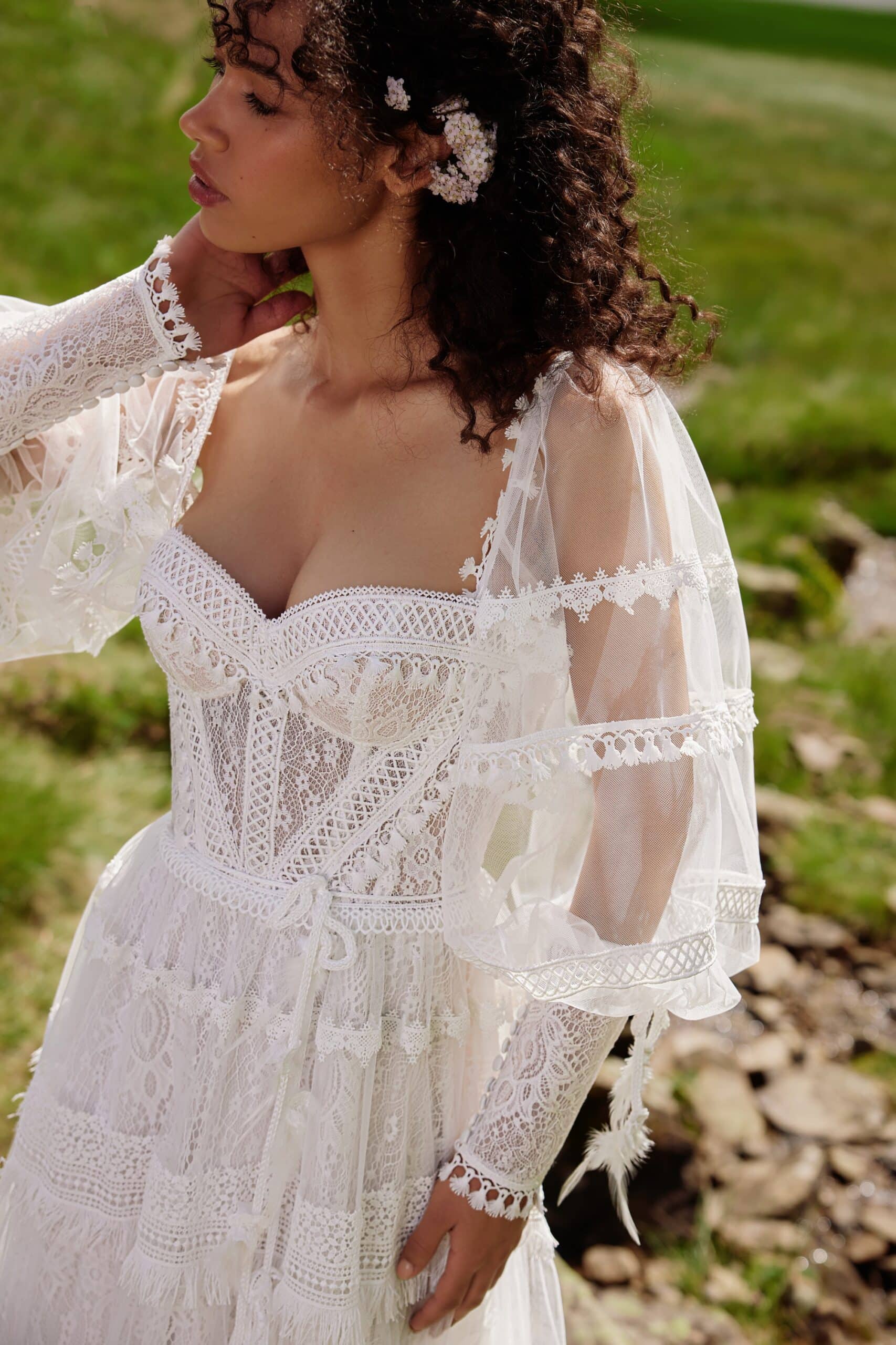 Detalii: corset cu structură vizibilă, mâneci romantice, accente boho couture