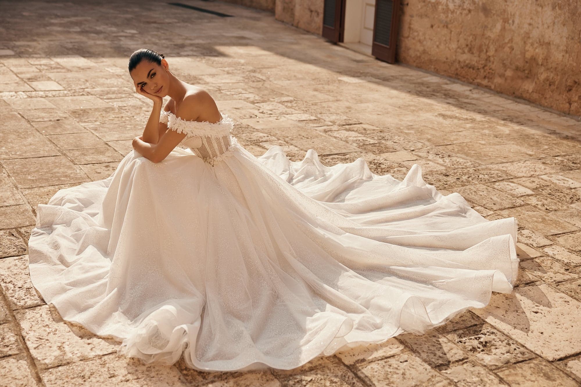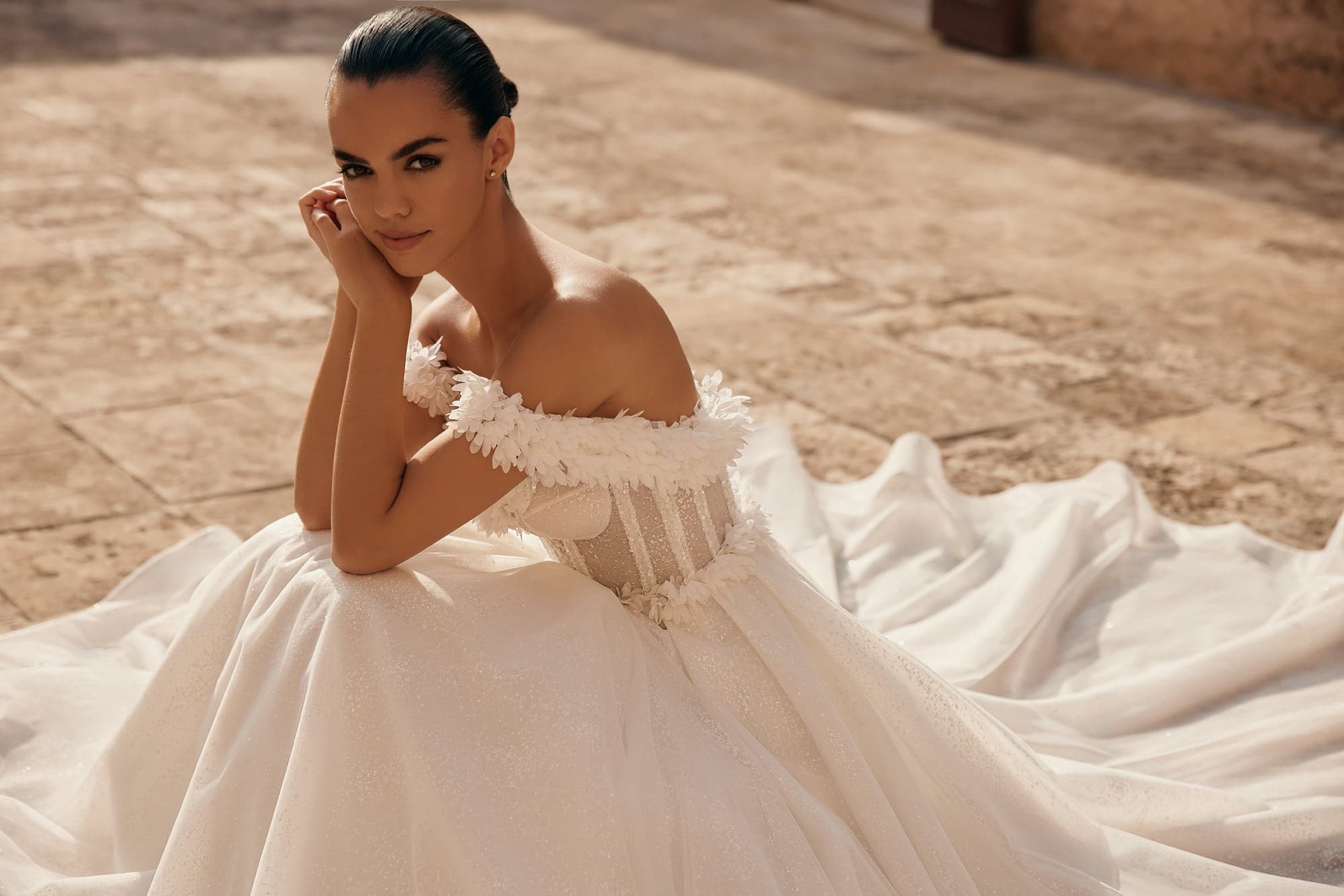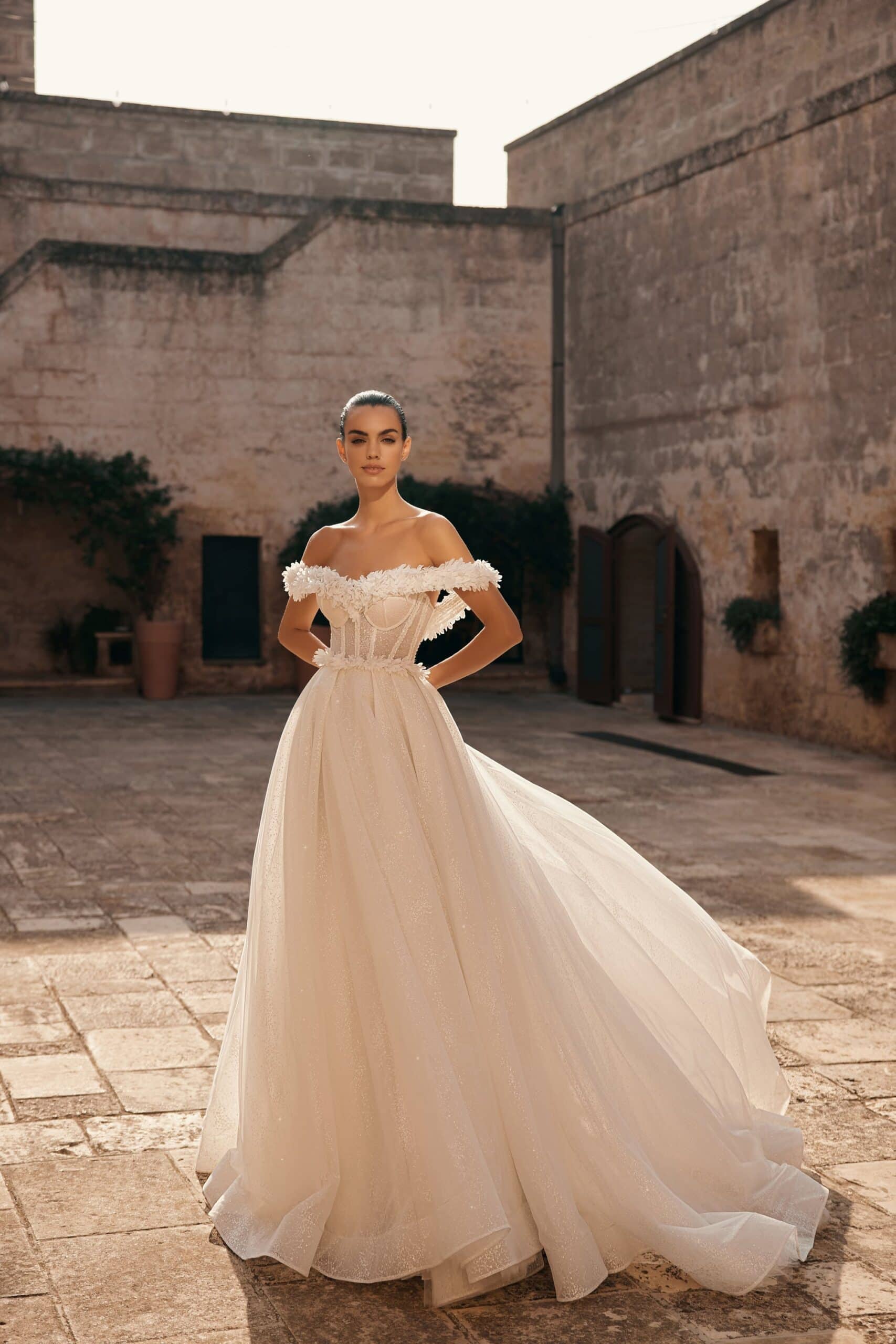 Rochia Emanuela aduce acea frumusețe diafană care pare desprinsă dintr-un tablou vechi, dar reinterpretată cu o eleganță modernă. Corsetul translucid cu structură vizibilă, decorat cu aplicații florale delicate, creează un joc subtil între senzualitate și rafinament. Linia căzută a umerilor, îmbogățită cu petale fine, adaugă un aer romantic, în timp ce fusta amplă din straturi vaporoase de tulle oferă volum eteric și fluiditate regală. O creație care se remarcă prin feminitate luminoasă și detalii lucrate impecabil, perfectă pentru o mireasă care vrea să fie memorabilă fără să renunțe la naturalețe.