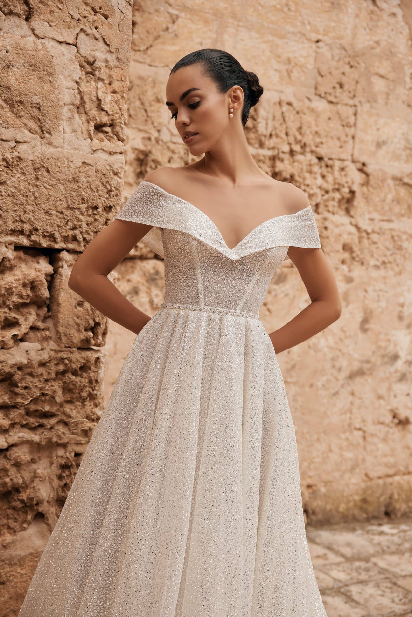 O creație care cucerește dintr-o privire, Federica aduce eleganța pură în forma ei cea mai rafinată. Linia lejeră, dar regală, scoate în evidență ușurința cu care silueta se mișcă, iar decolteul căzut subliniază feminitatea într-un mod delicat și sofisticat. Materialul fin, cu textură discretă, surprinde lumina în mod natural, creând un efect de strălucire caldă și diafană — exact acea prezență care transformă orice pas într-un moment memorabil.