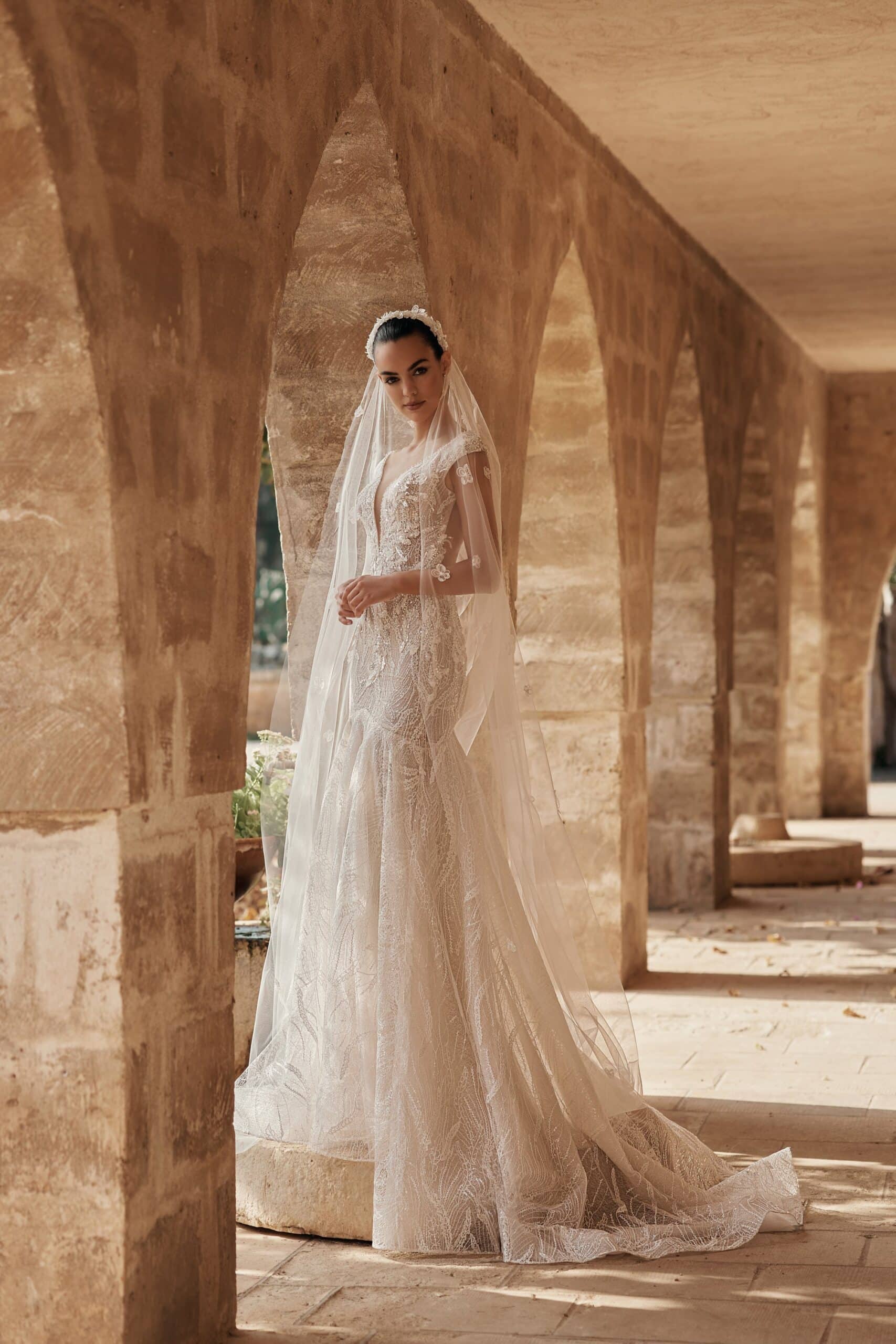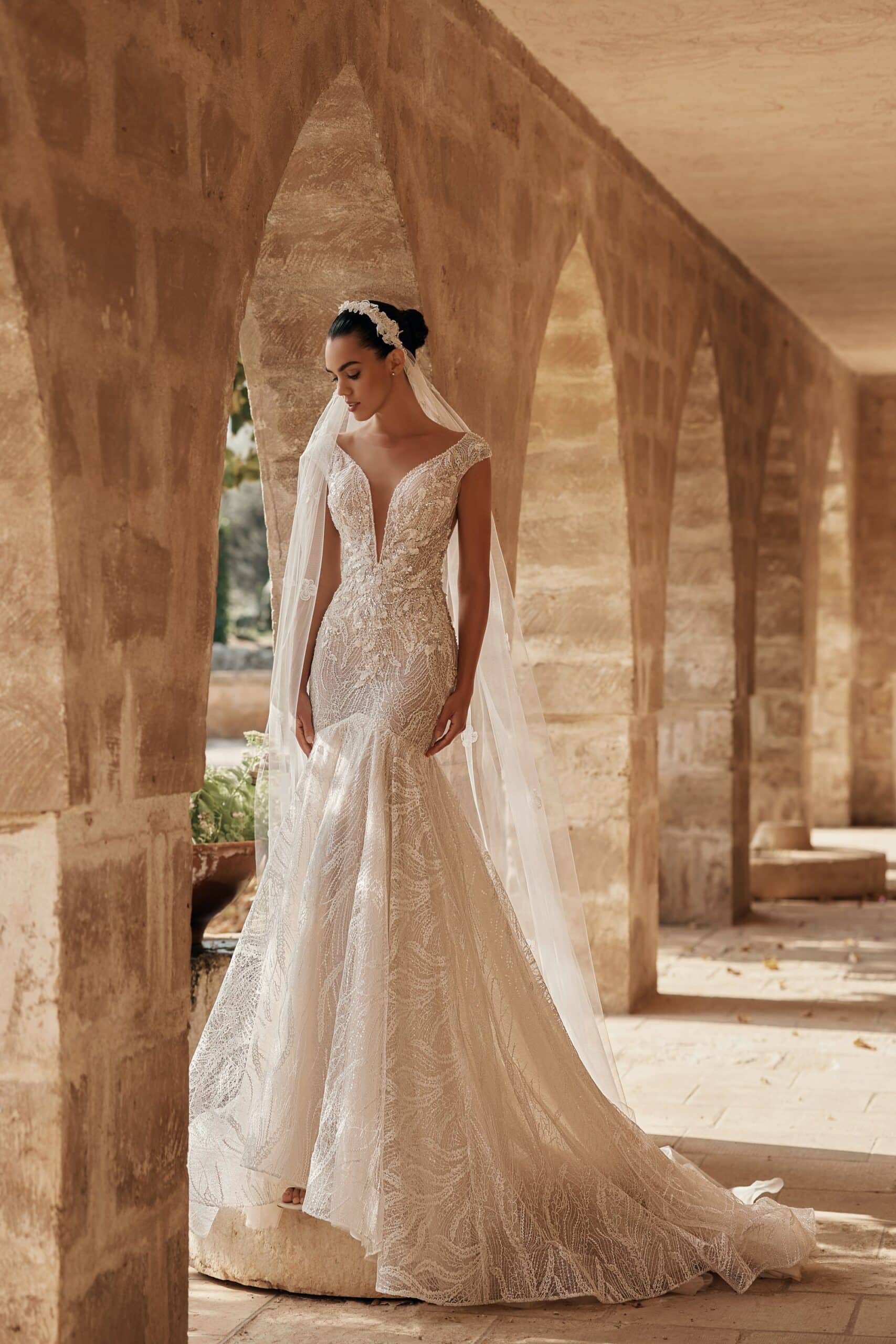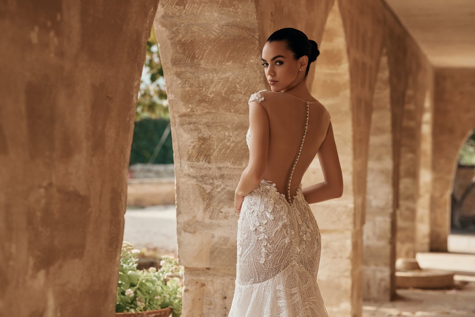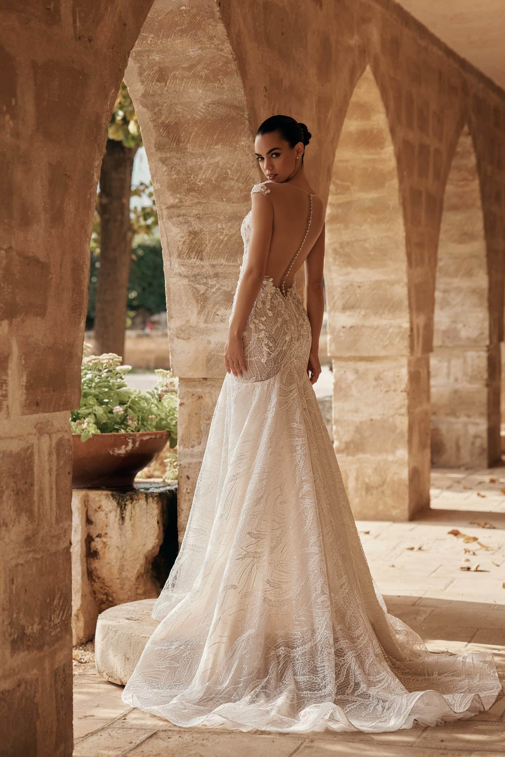 Rochia Lucrezia este o creație Ariamo care îmbină senzualitatea cu rafinamentul couture, sculptând o apariție memorabilă pentru mireasa modernă. Corsetul bogat texturat, brodat integral, se contopește cu transparențele fine ale spatelui adânc, unde linia de nasturi creează un efect grafic spectaculos. Fluidele jocuri de dantelă și paiete se prelungesc într-o trenă sculptată, conferind mișcare, lumină și un aer regal. Este o alegere desăvârșită pentru mireasa care caută eleganță sofisticată și impact vizual puternic.