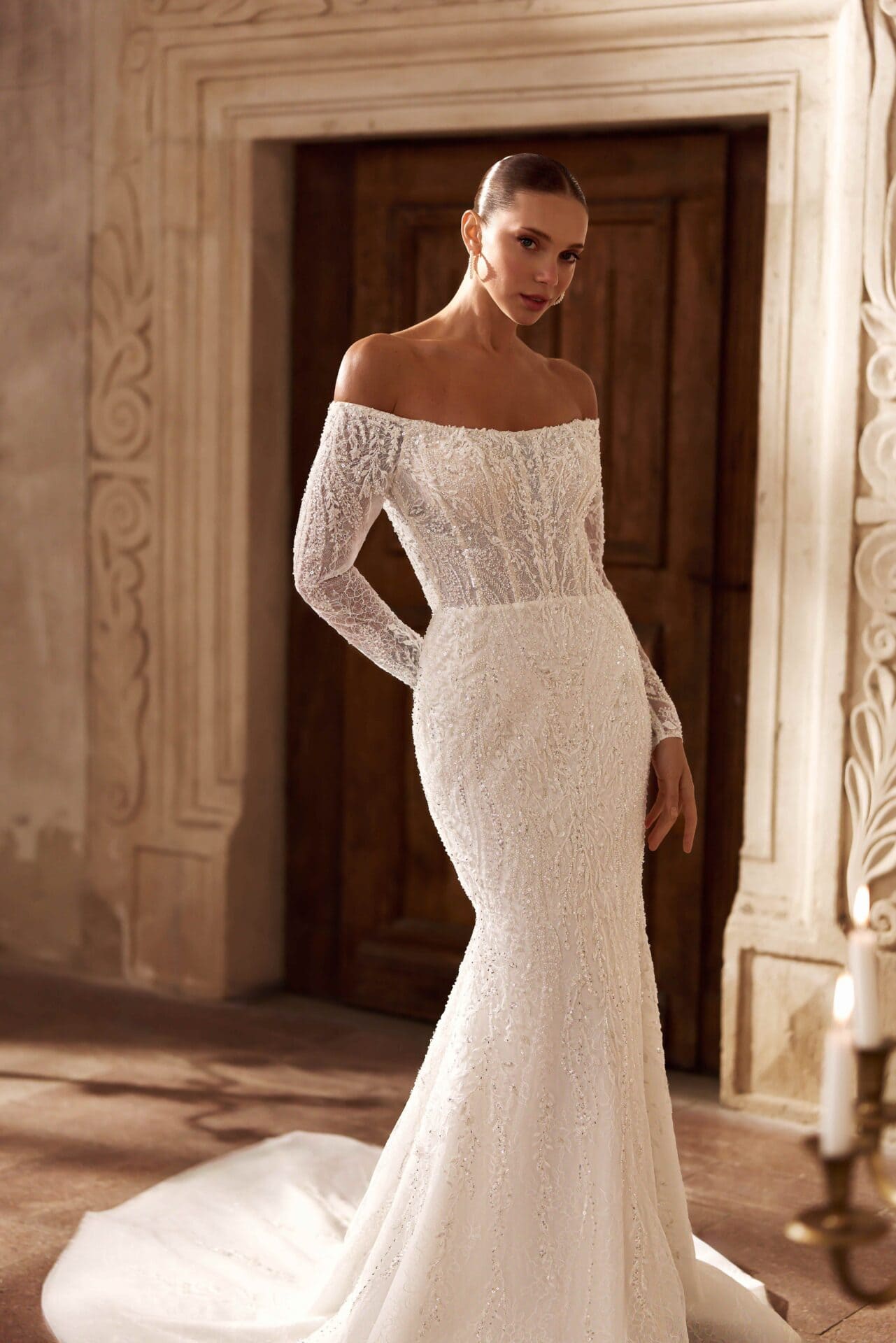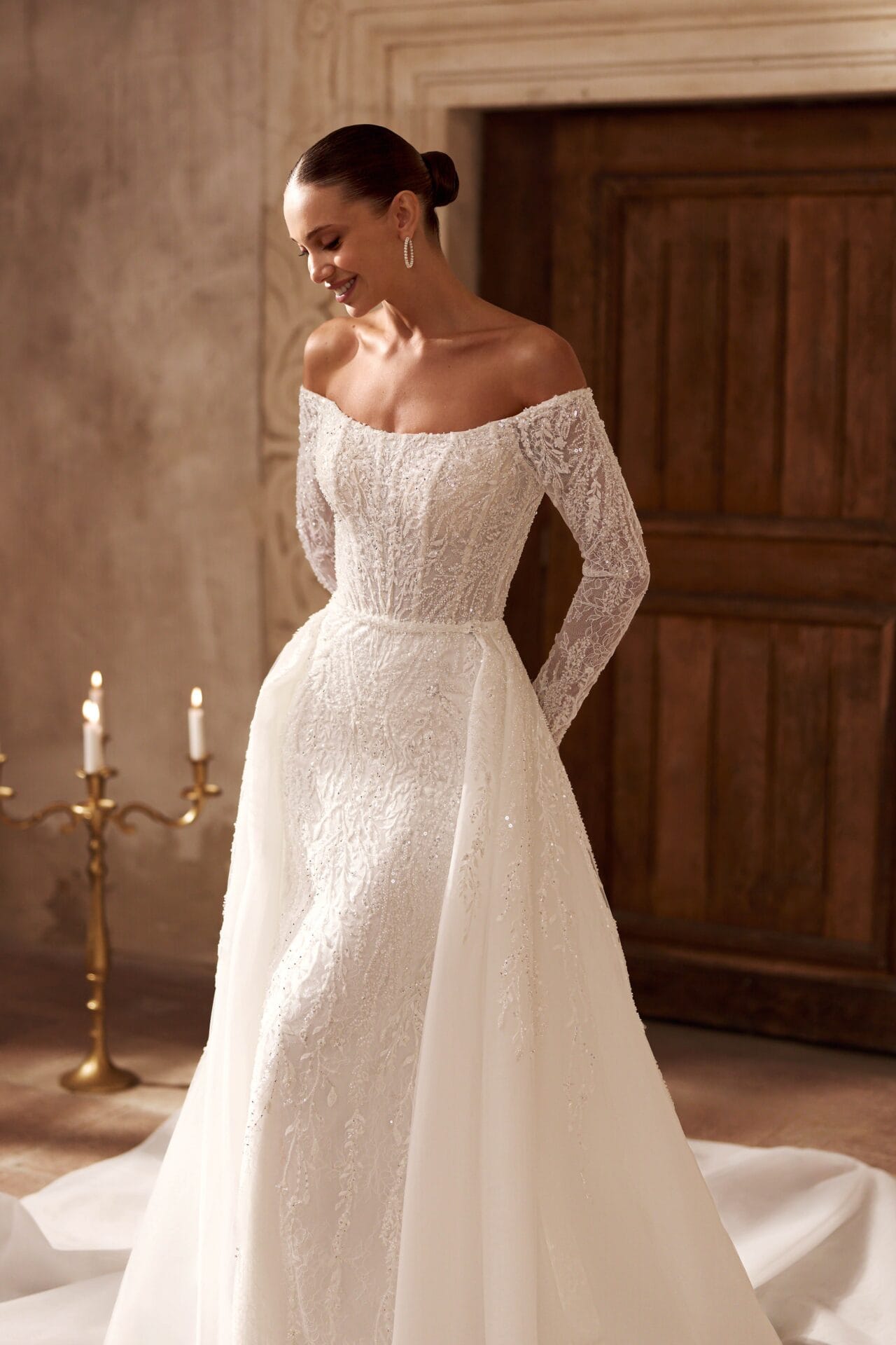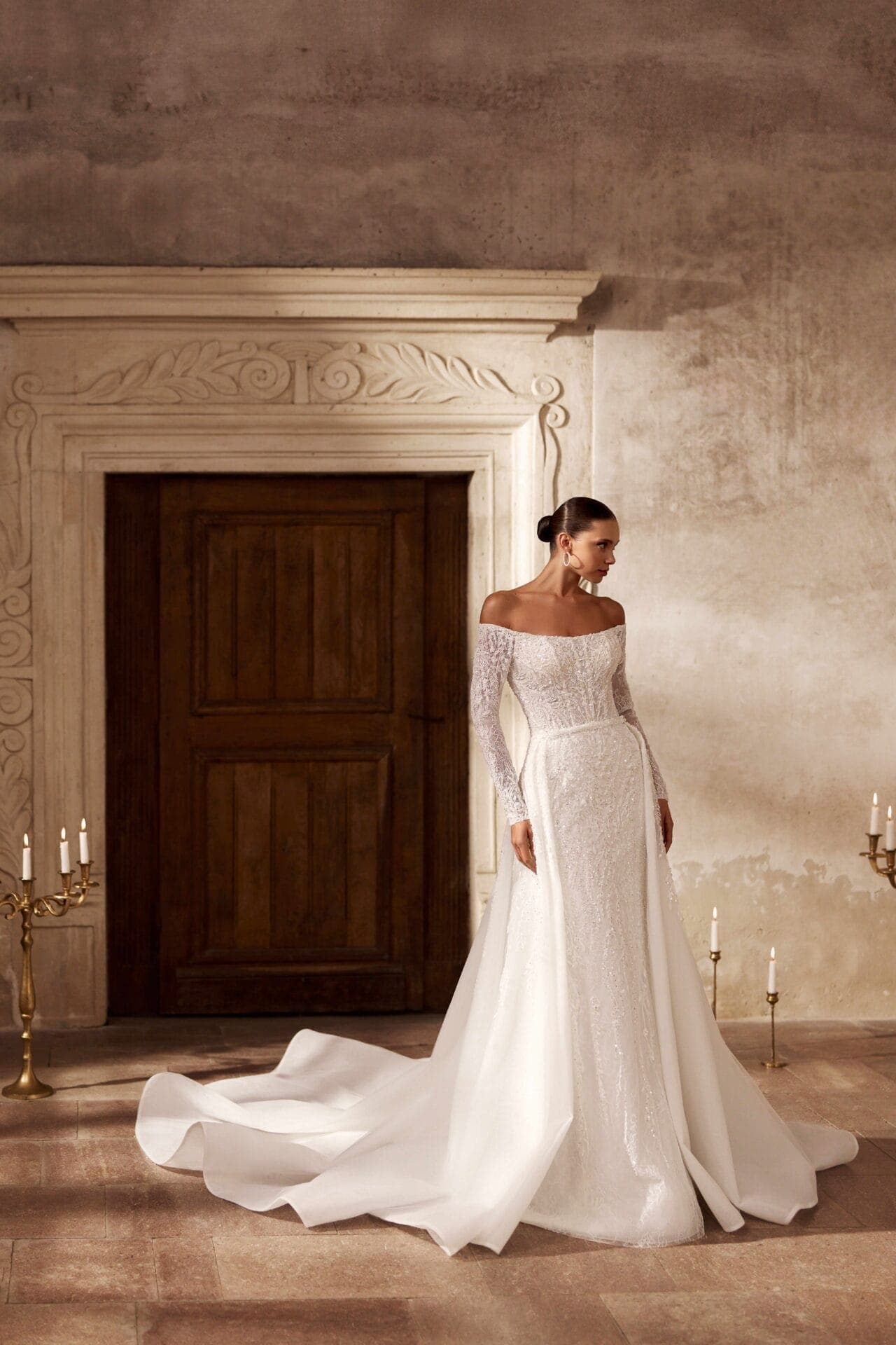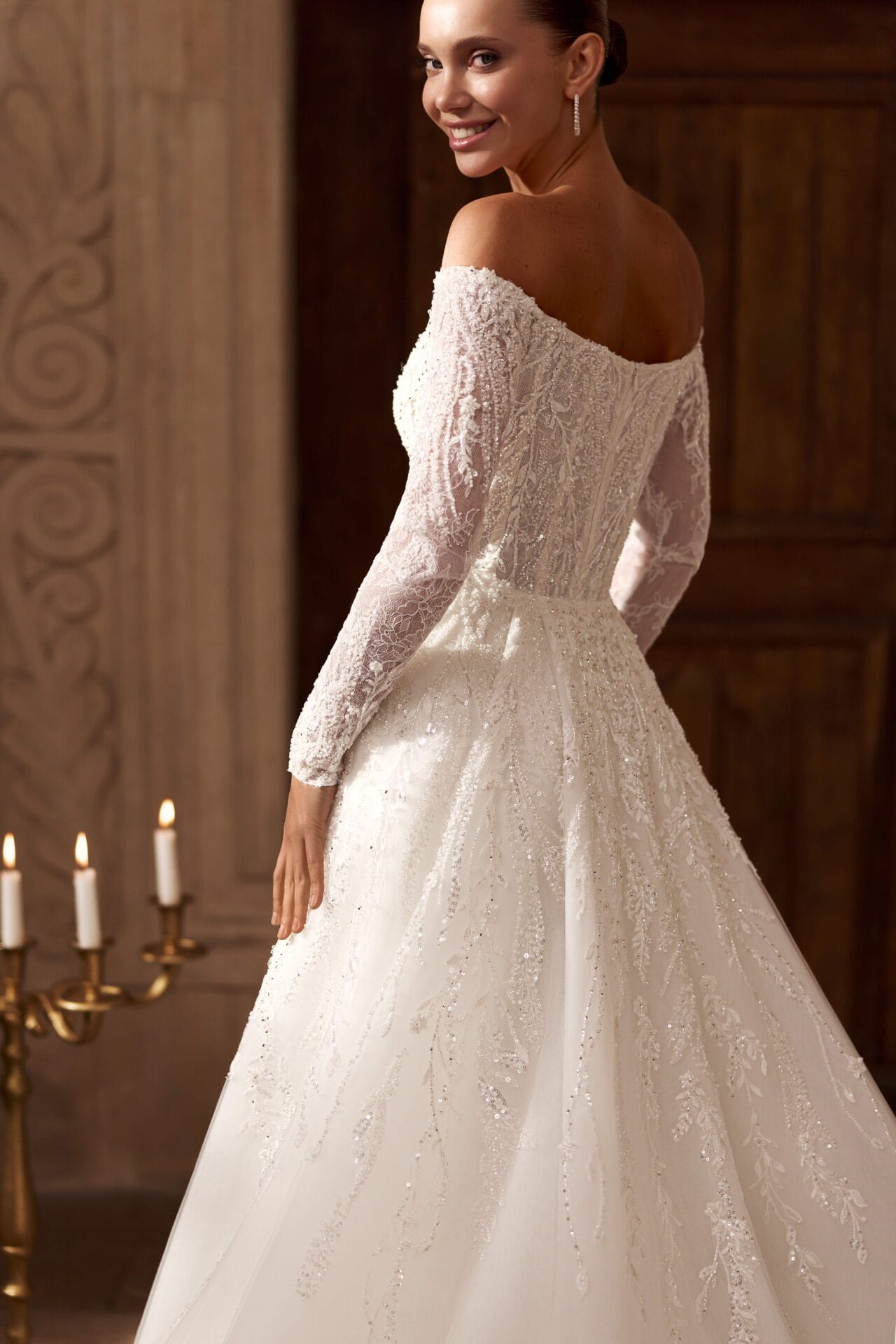Corsetul tip inimă, decorat cu broderii fine și linii verticale ce subliniază silueta, se completează cu mâneci lungi din dantelă translucidă, ce oferă un aer nobil și grațios.