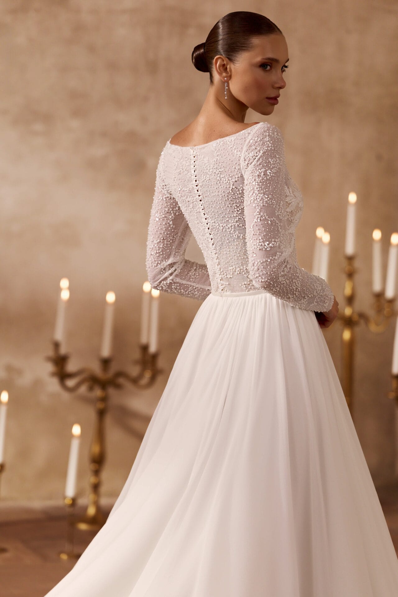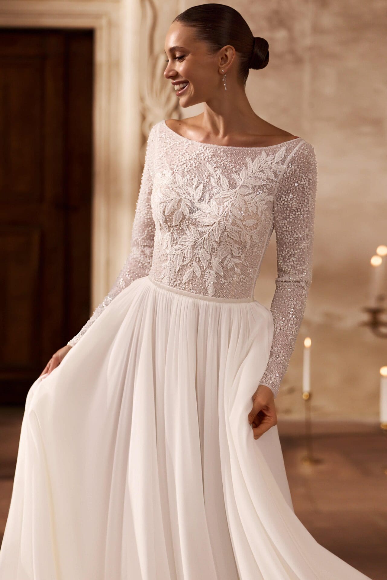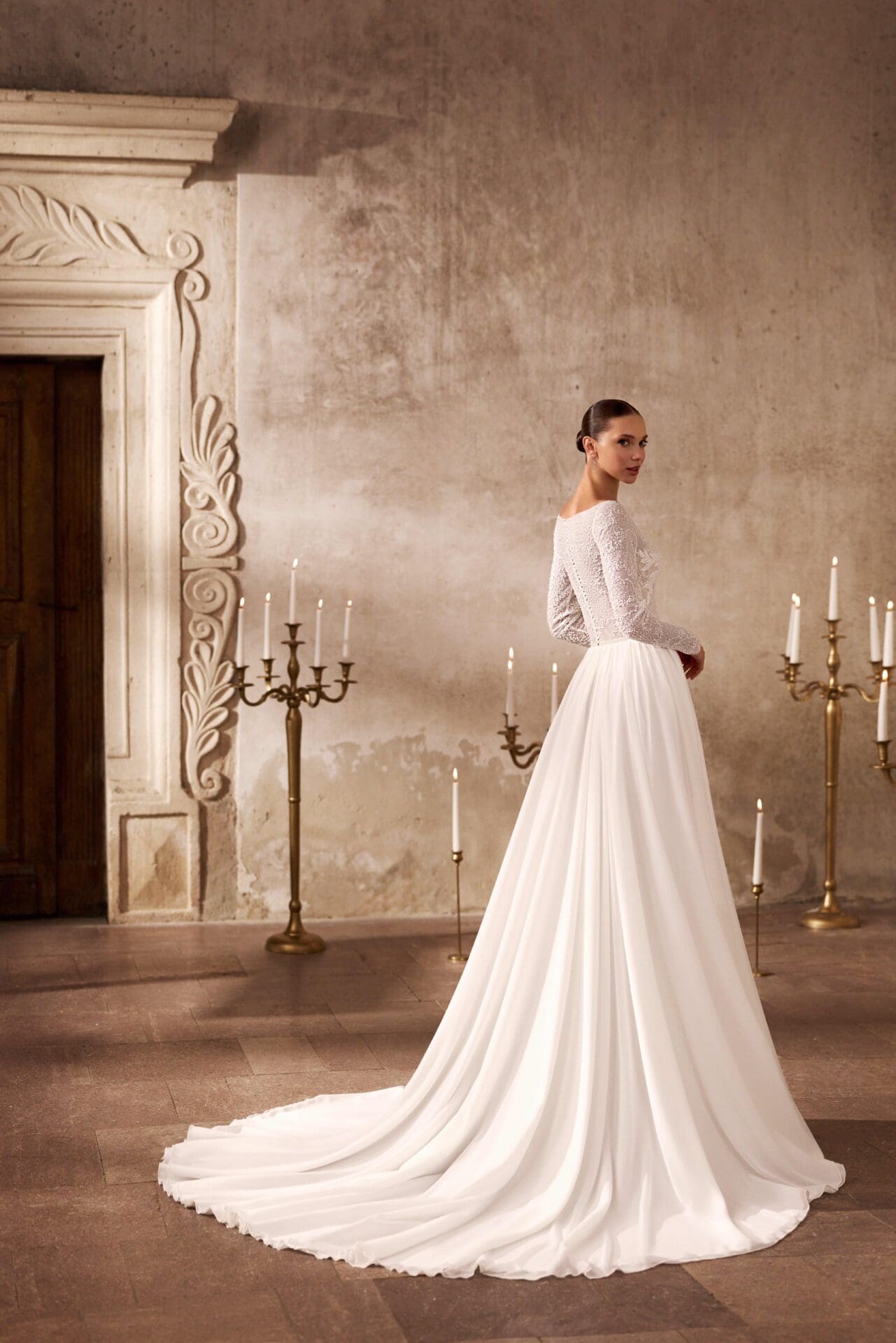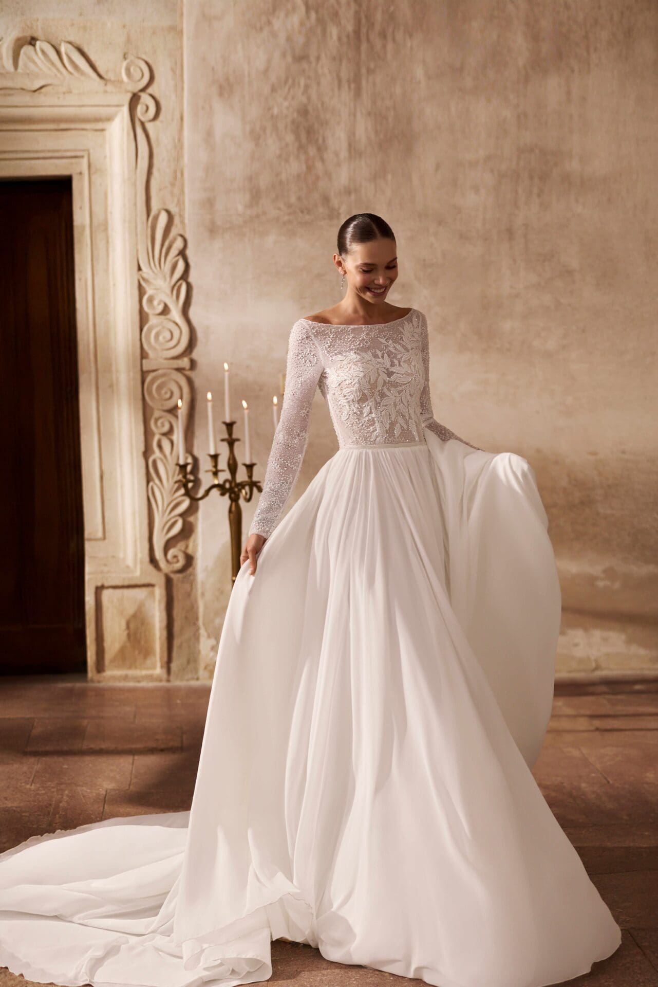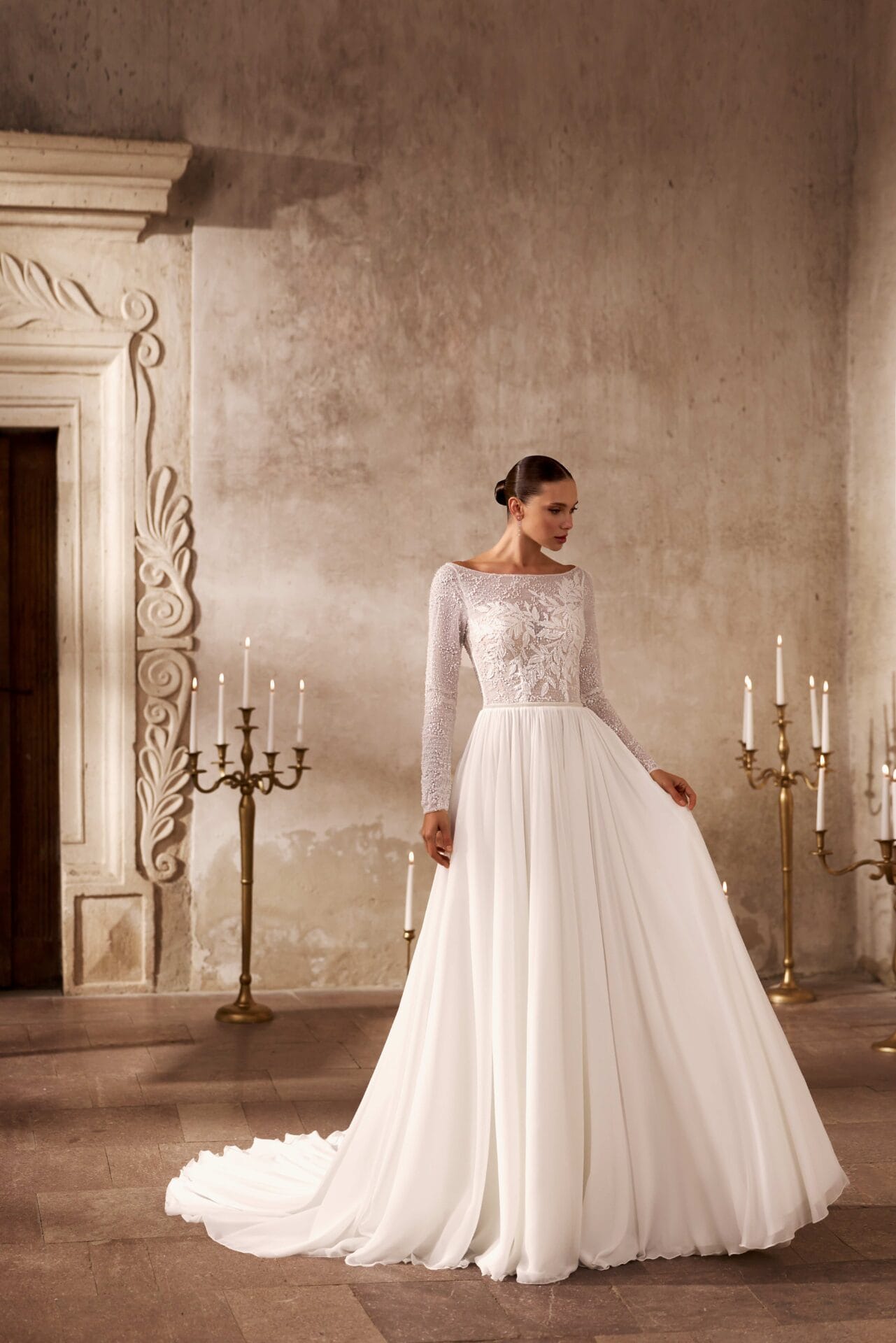 Rochia Bety este expresia eleganței pure și a feminității serene, concepută pentru mireasa care apreciază rafinamentul discret. Partea superioară, realizată din dantelă fină brodată, dezvăluie un joc subtil de transparențe, completat de mâneci lungi și decolteu bateau, ce alungește linia gâtului cu o grație nobilă. Fusta amplă din chiffon vaporos curge fluid din talie, creând o siluetă ușoară, plină de mișcare și romantism. Întregul ansamblu emană un aer de calm sofisticat, ideal pentru o nuntă clasică, în care frumusețea se exprimă prin simplitate și echilibru.