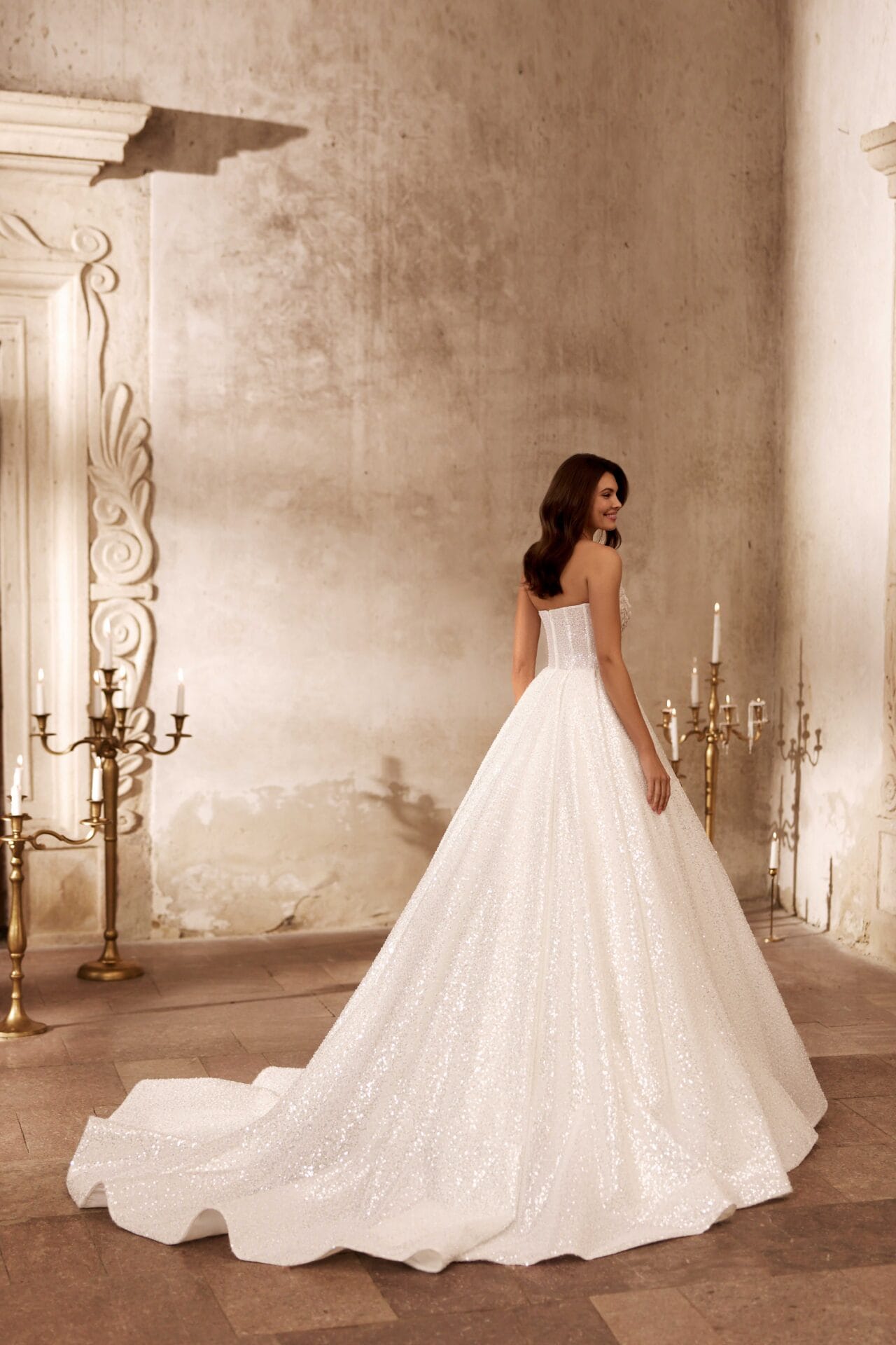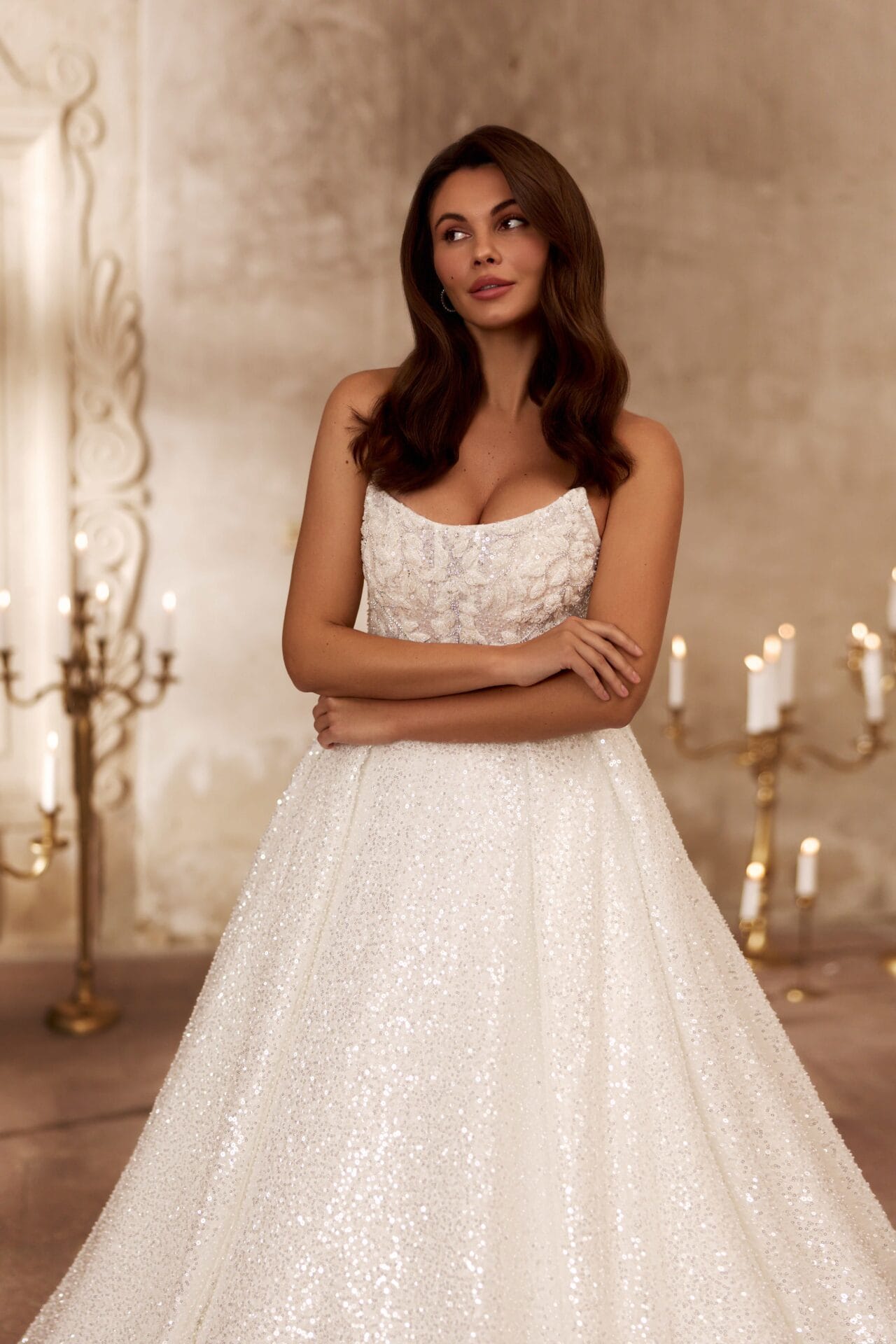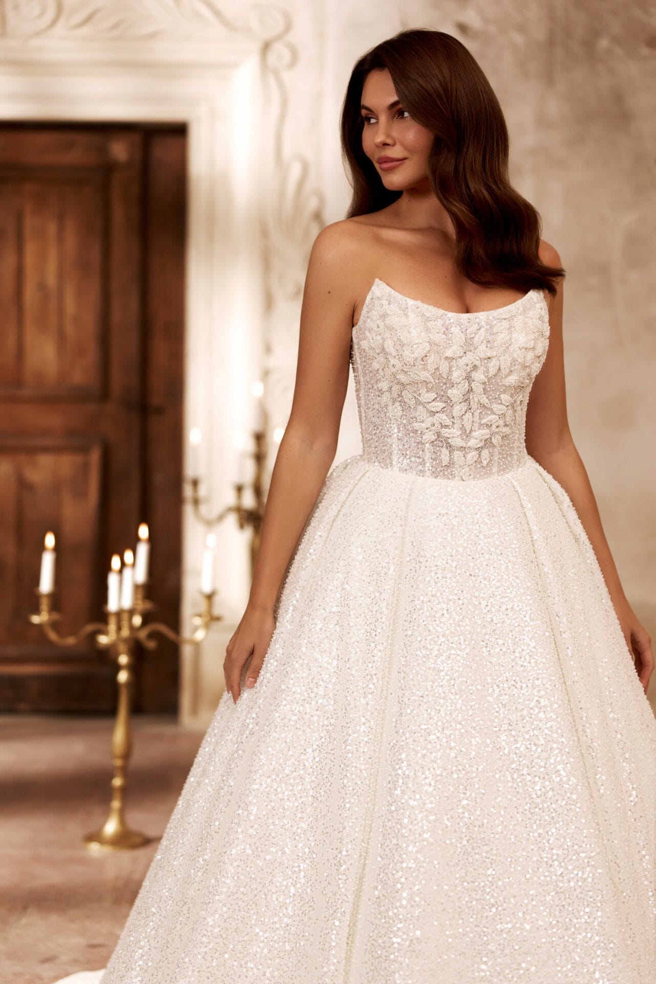Rochia Bridget îmbină eleganța regală cu o strălucire modernă, oferind o prezență impunătoare și sofisticată. Corsetul cu structură vizibilă și broderii fine accentuează talia, în timp ce decolteul rotund delicat conturează bustul cu naturalețe. Fusta amplă, realizată din material cu inserții strălucitoare, creează un joc spectaculos de lumină la fiecare pas, transformând mișcarea într-un dans rafinat. Trena lungă completează compoziția cu o notă de grație imperială, ideală pentru o mireasă care dorește o apariție memorabilă și atemporală.