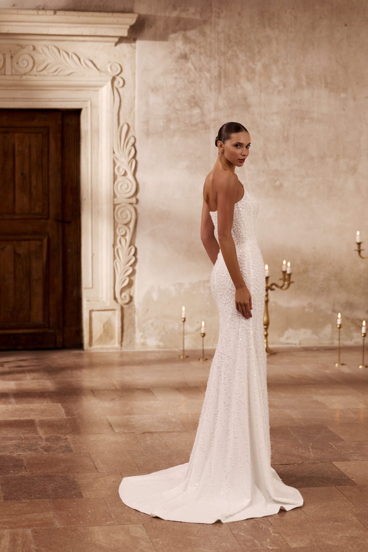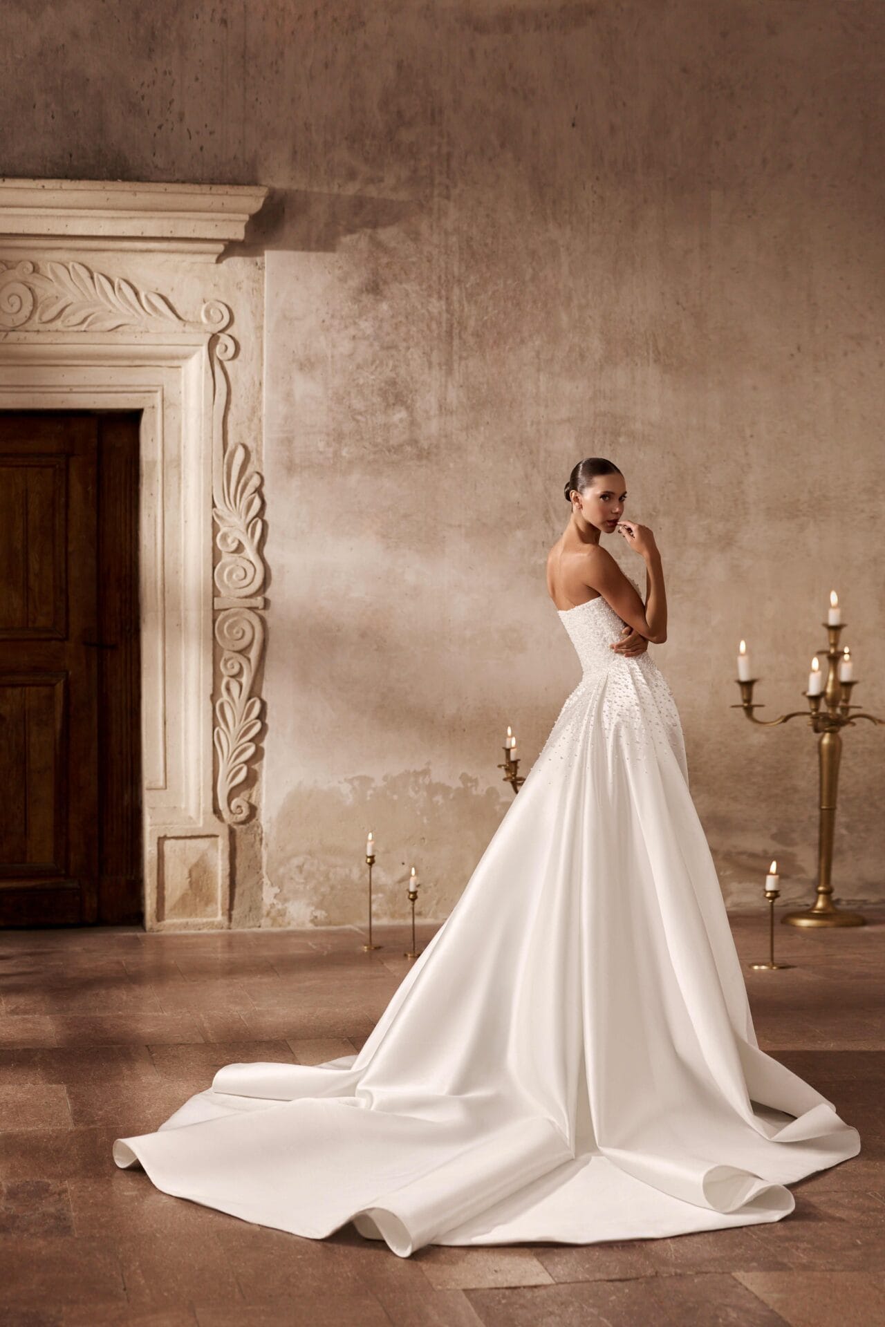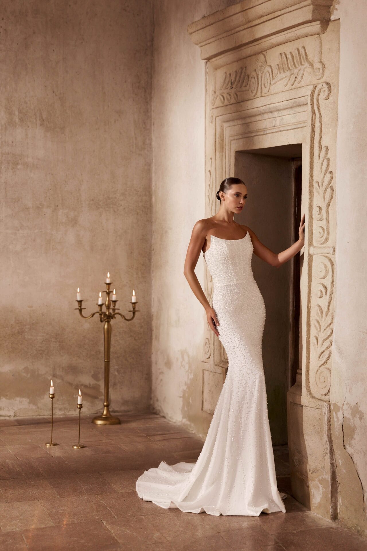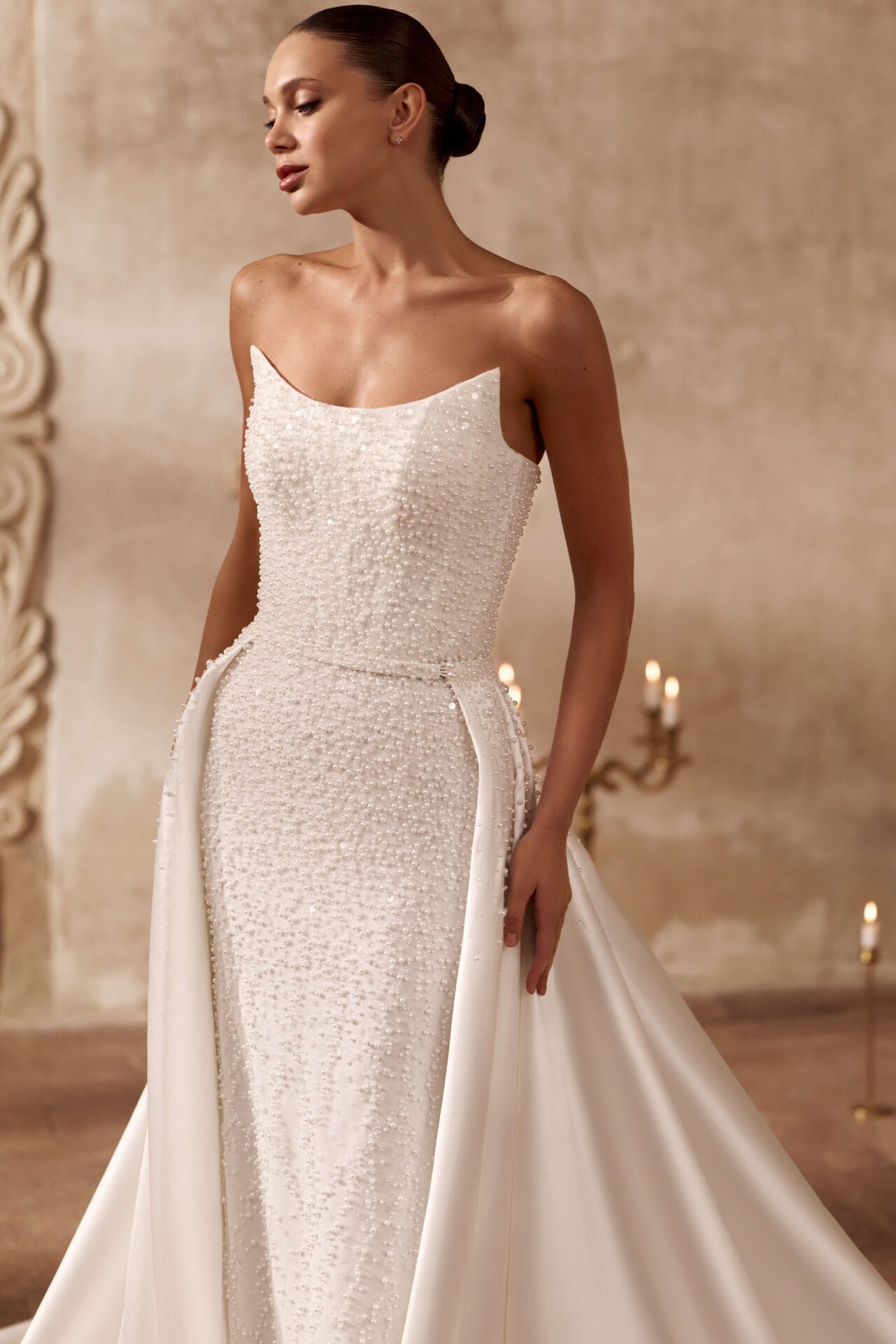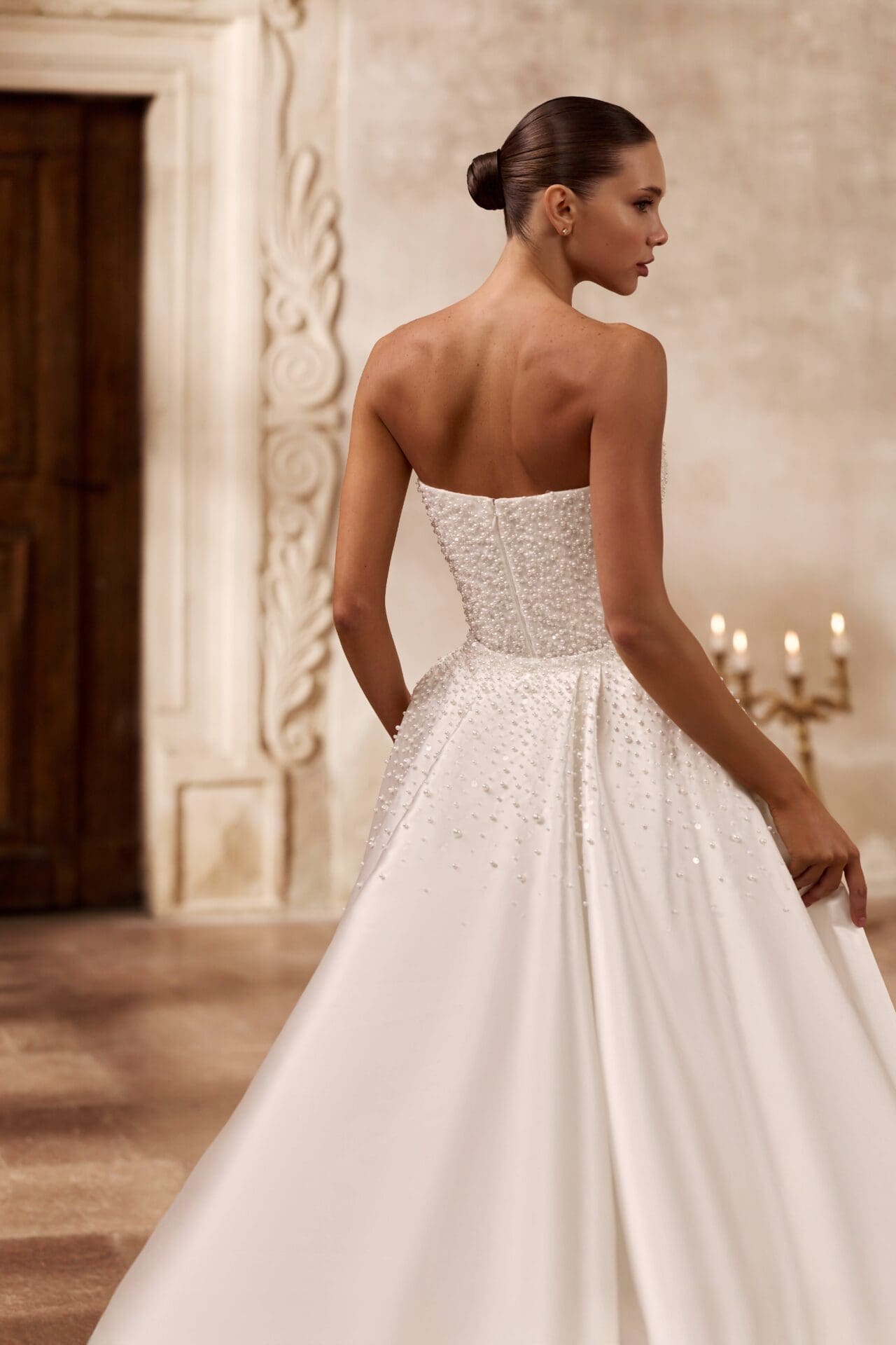 Rochia Electra este o declarație de rafinament pur, concepută pentru mireasa care își dorește un echilibru perfect între senzualitate și noblețe. Silueta sirenă subliniază grațios formele feminine, în timp ce materialul brodat manual cu perle și paiete fine adaugă un luciu subtil, ca o dantelă de lumină. Corsetul fără bretele, cu decolteu ușor curbat, aduce un aer modern și sofisticat, iar trena amplă detașabilă din tafta creează o transformare spectaculoasă, ideală pentru trecerea de la ceremonie la petrecere. Electra este rochia care îmbină minimalismul couture cu luxul atemporal.