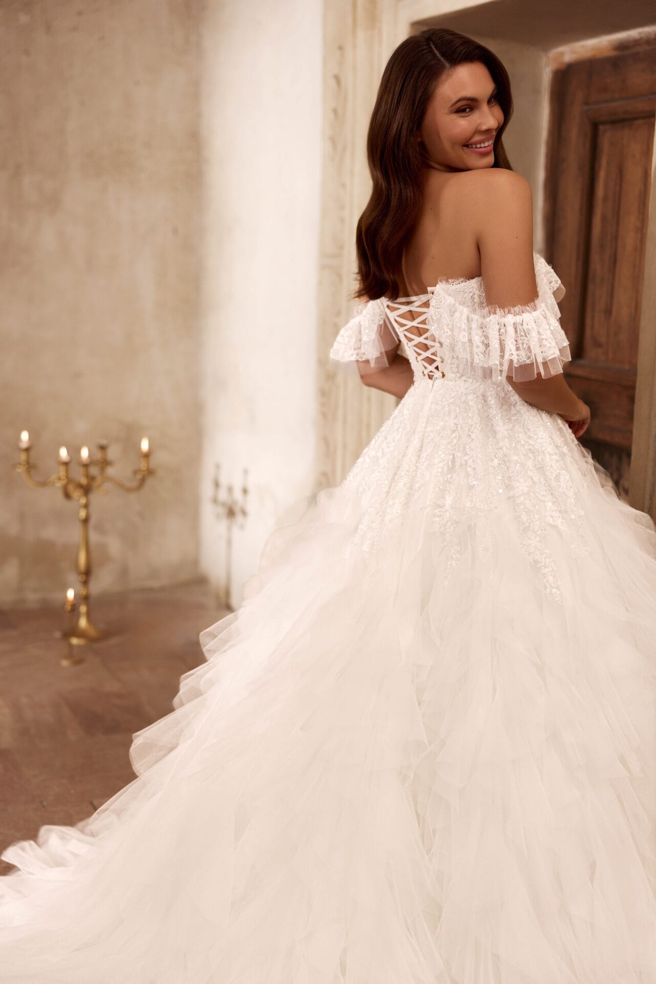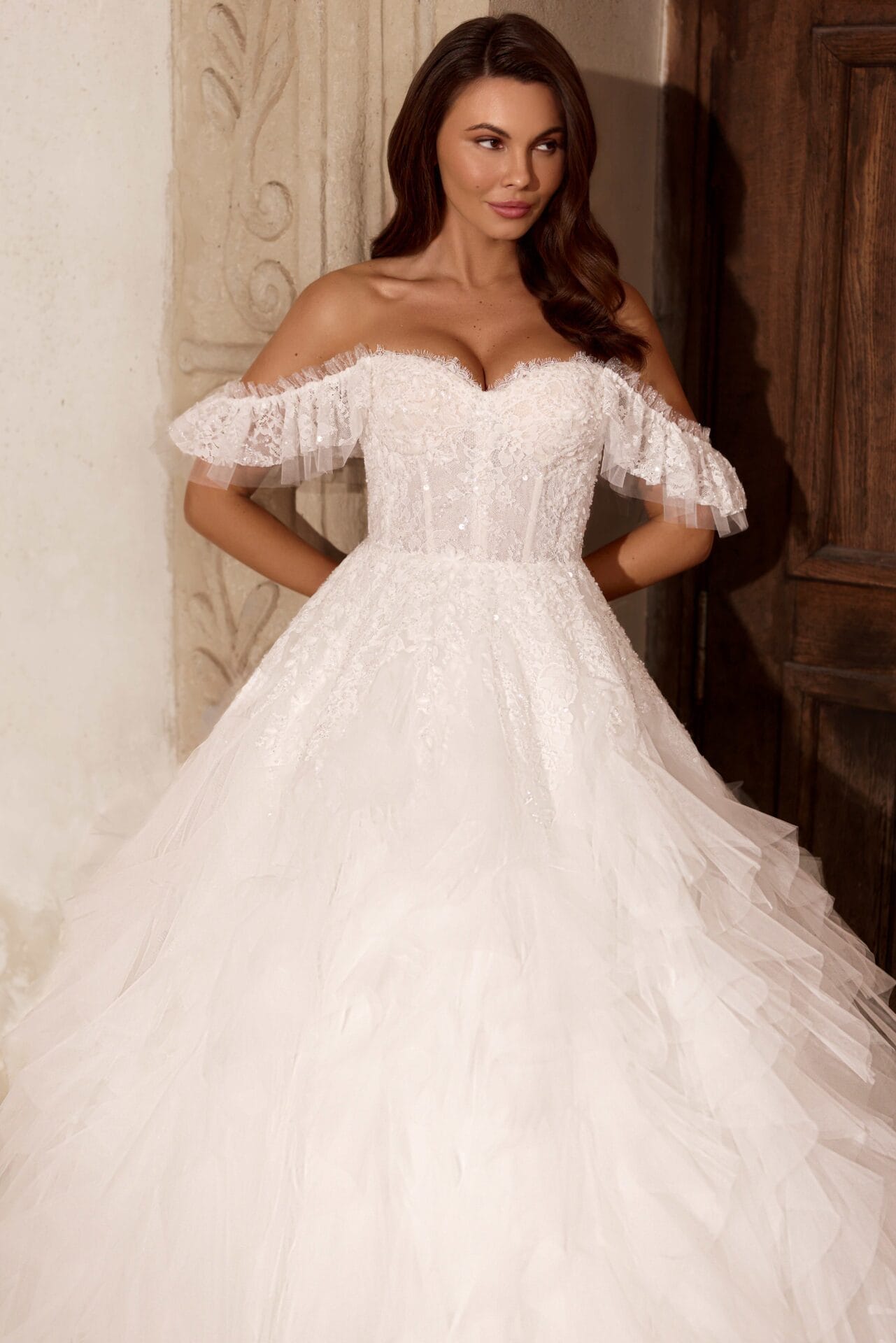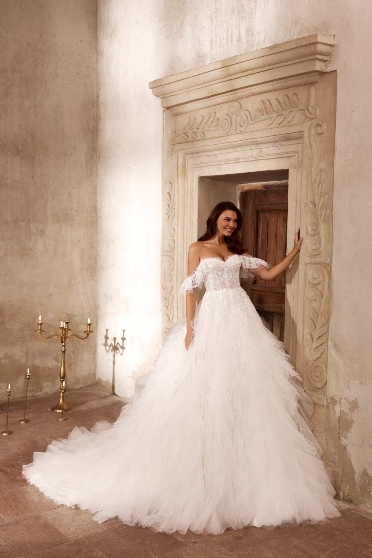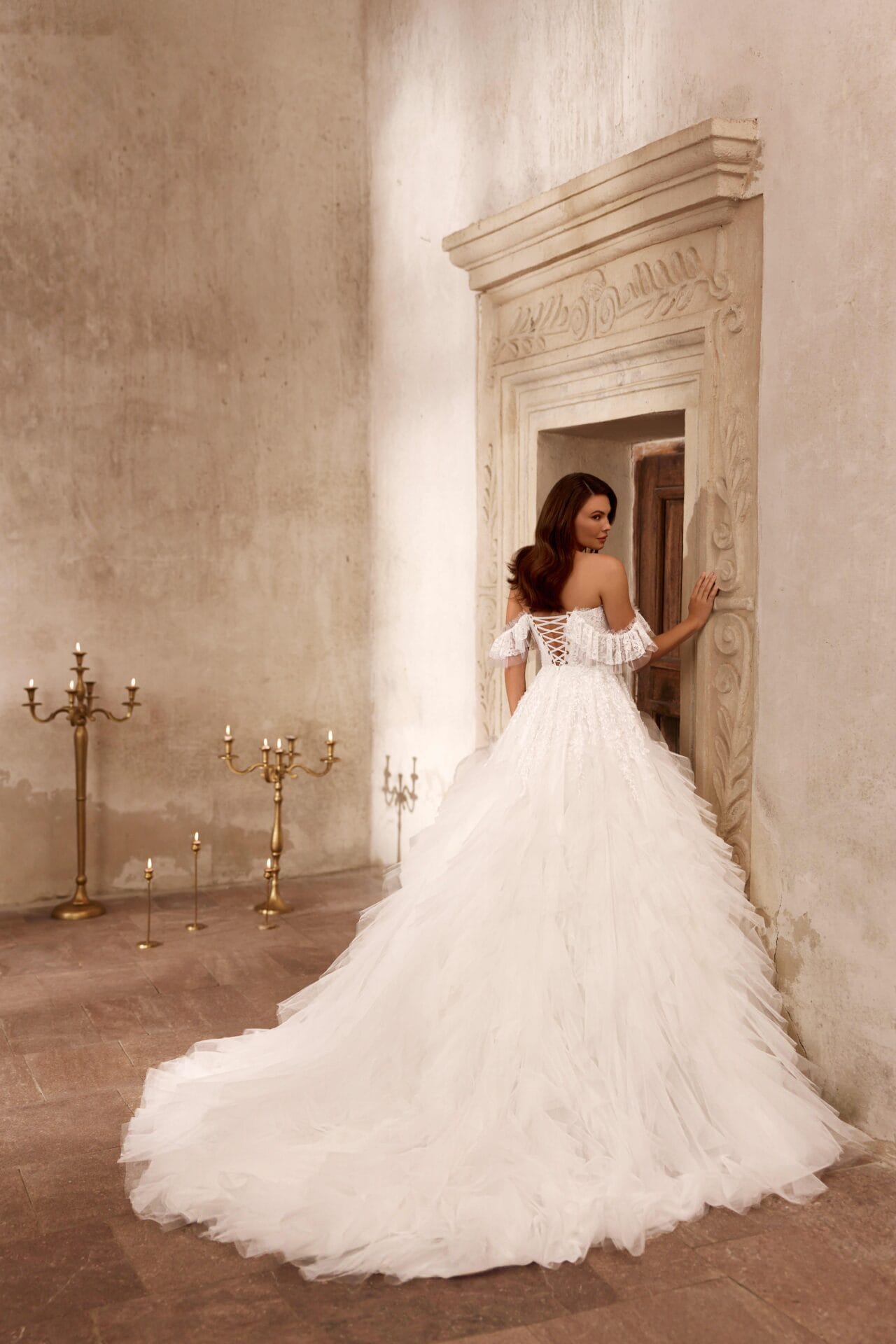 Rochia Elinnda este o adevărată apariție de basm, creată pentru mireasa care își dorește un look romantic, cu o notă de teatralitate rafinată. Corsetul elegant, decorat cu broderii fine și aplicații florale, pune în valoare linia umerilor printr-un decolteu în inimă cu mâneci căzute din dantelă. Fusta amplă, realizată din straturi vaporoase de tull, creează un volum spectaculos și o mișcare plină de lejeritate. Trena generoasă completează compoziția cu o aură regală, iar spatele cu închidere tip corset adaugă un farmec clasic și feminin. Elinnda este rochia care transformă fiecare pas într-un moment desprins dintr-un vis.