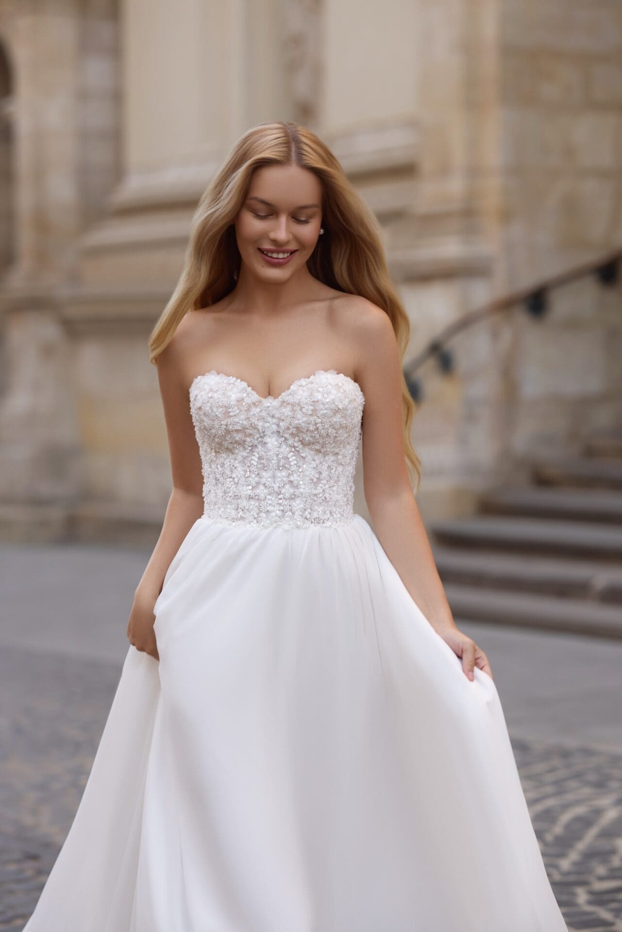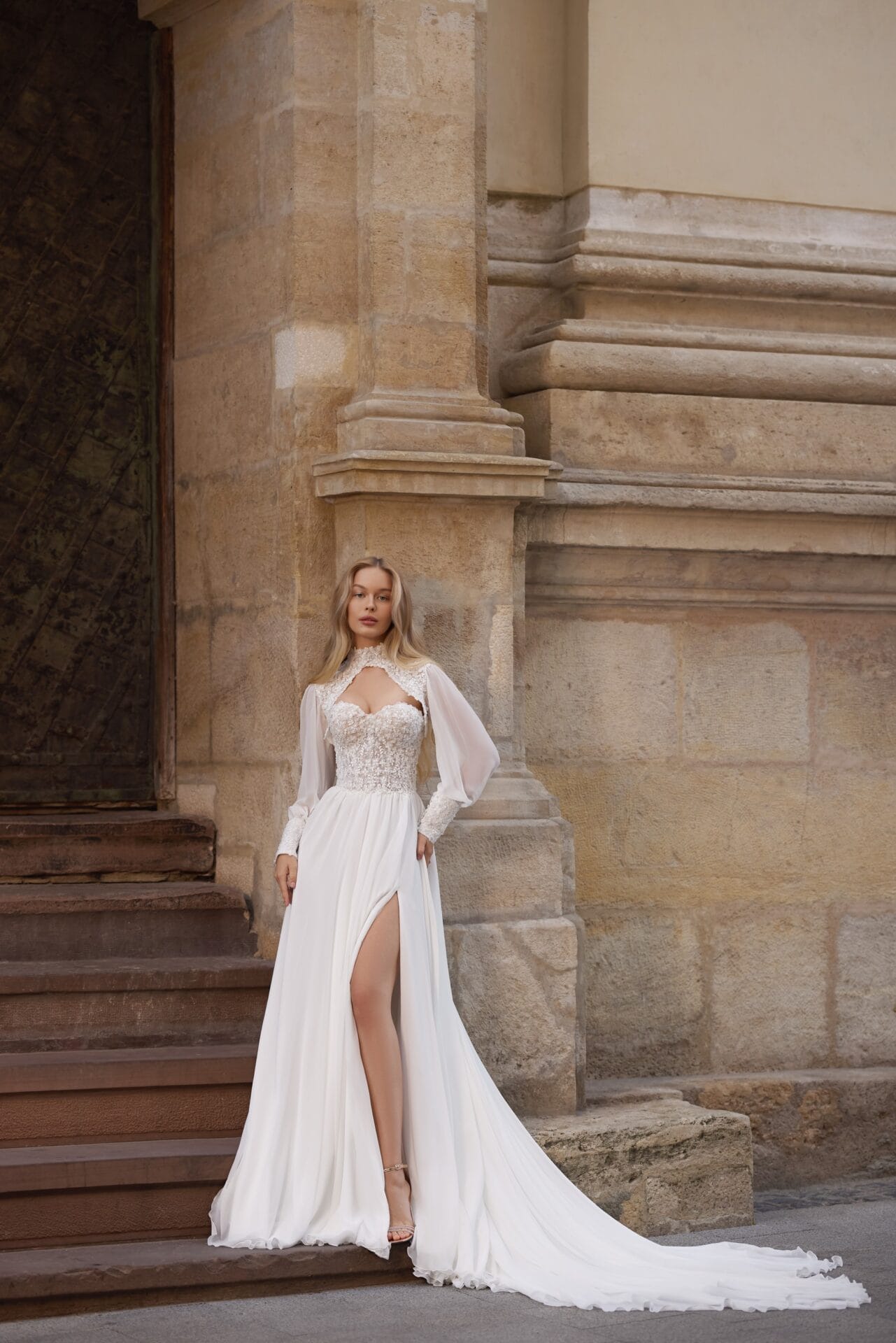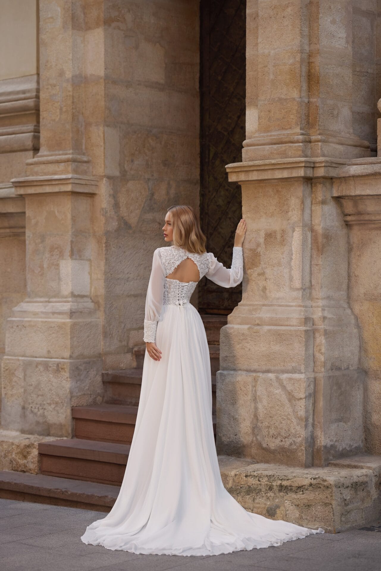 Rochia Jade este definiția rafinamentului contemporan, o alegere pentru mireasa care își dorește o apariție elegantă, dar cu accente sofisticate și feminine. Corsetul tip bustieră, bogat decorat cu aplicații fine și texturi delicate, evidențiază linia bustului într-un mod armonios, în timp ce gulerul înalt și mânecile lungi, vaporoase, adaugă un aer nobil și ușor dramatic. Fusta fluidă, din material ușor și plin de mișcare, este completată de crăpătura pe picior, oferind un contrast subtil între clasic și modern. Spatele decupat, cu sistem de închidere tip corset, transformă rochia Jade într-o piesă memorabilă, ideală pentru o nuntă elegantă, cu stil și personalitate.