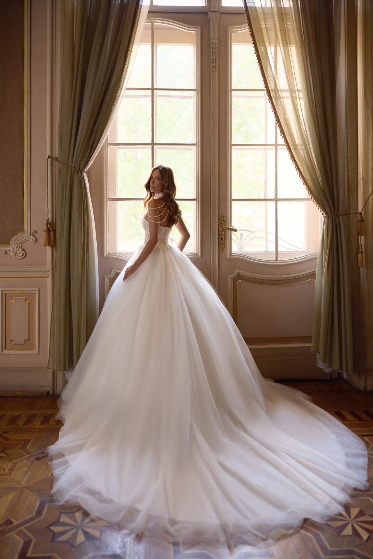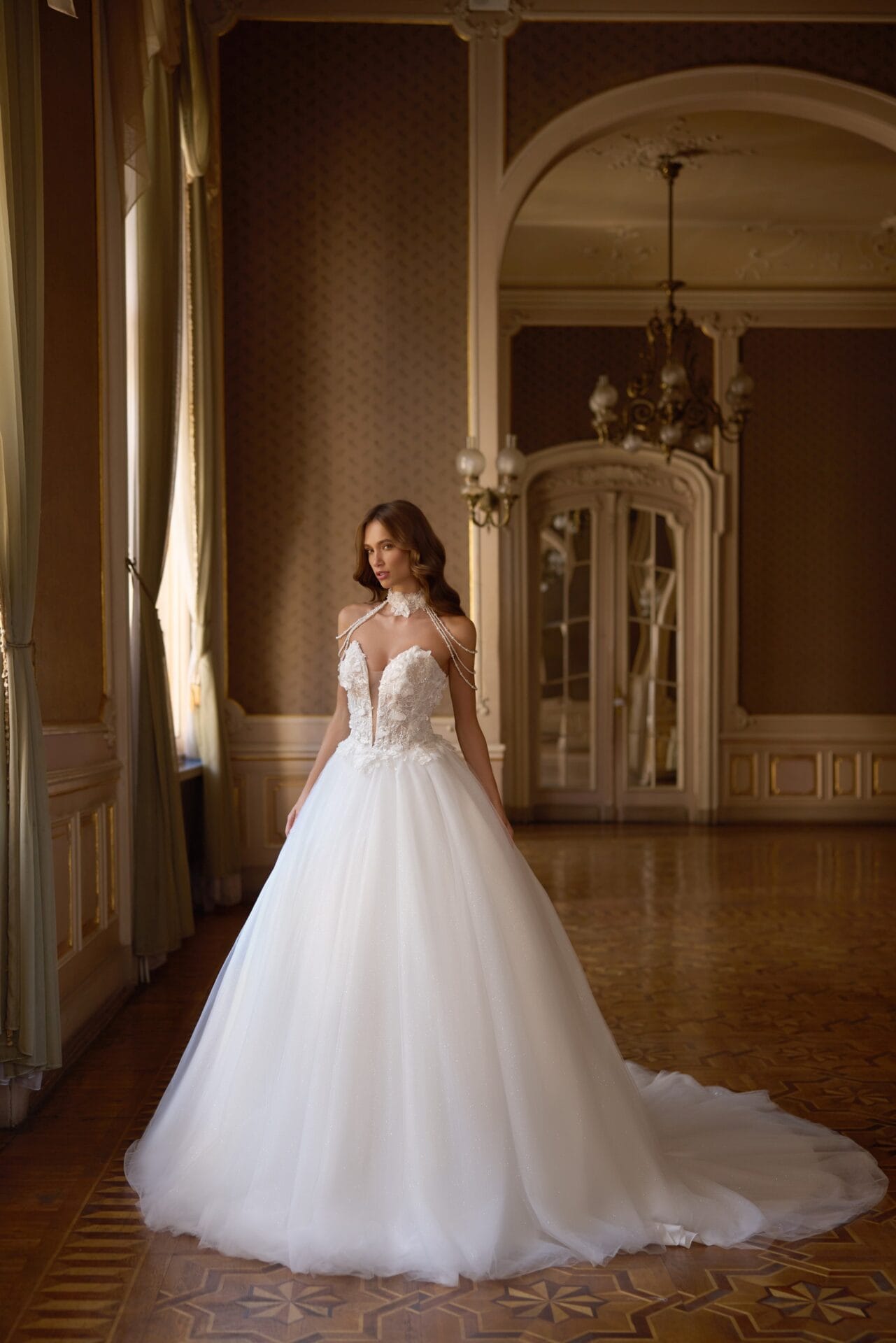 Rochia Rachel este o apariție spectaculoasă, creată pentru mireasa care visează la un look regal, sofisticat și absolut memorabil. Corsetul elaborat, cu transparențe fine și aplicații florale delicate, este accentuat de un decolteu adânc în V, echilibrat perfect de detalii prețioase ce se continuă pe umeri sub formă de șiraguri elegante. Gulerul fin, decorat cu broderii florale, adaugă o notă couture și un aer aristocratic. Fusta amplă, din tulle vaporos cu subtil efect sidefat, se deschide grandios într-o trenă amplă, transformând fiecare pas într-un moment de poveste. Rachel este rochia care impune prezență, rafinament și emoție pură.