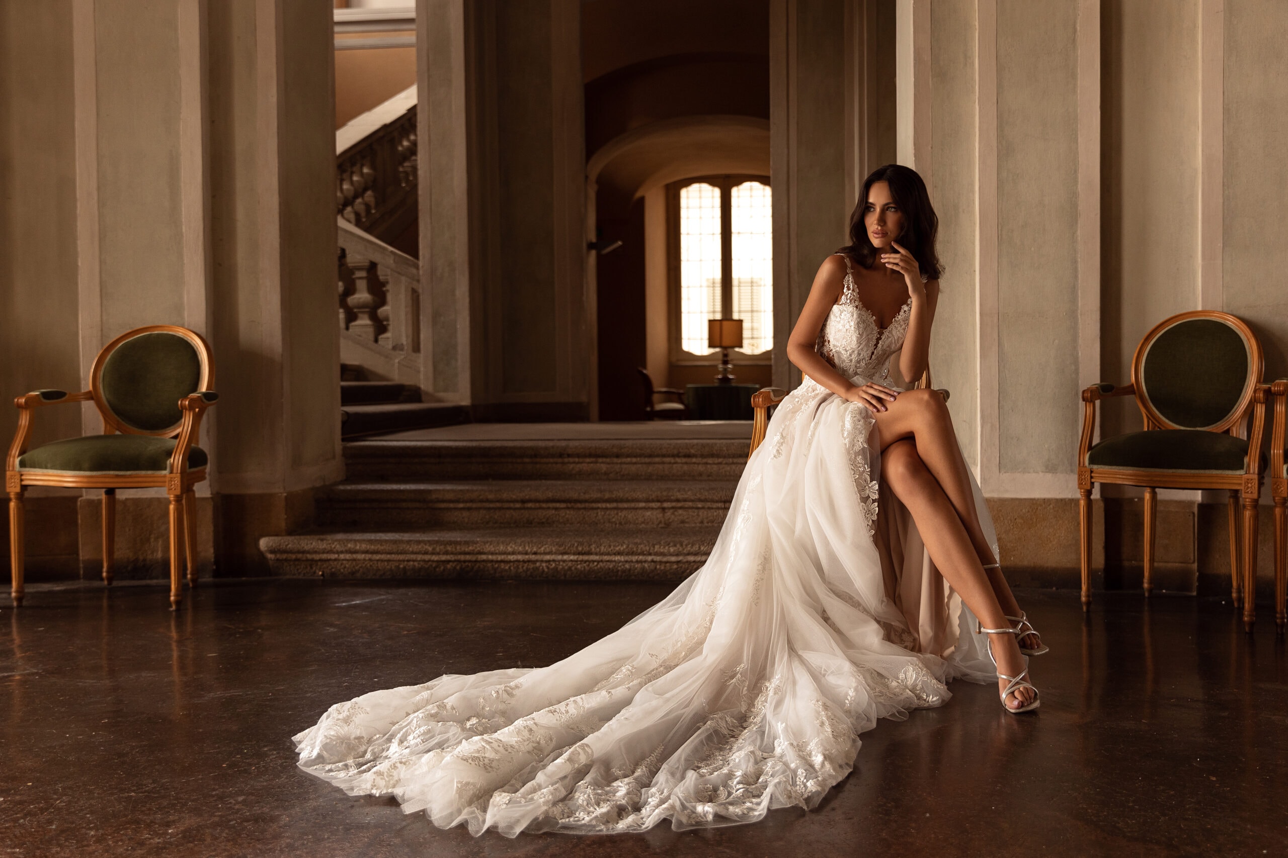 Rochia Grutin este întruchiparea eleganței eterice, ideală pentru o mireasă care visează la un look regal cu note romantice. Bustul este evidențiat de un decolteu adânc în formă de inimă, conturat de aplicații florale delicate care creează un joc subtil de transparență și textură. Talia bine definită se deschide într-o fustă amplă din tulle fin, cu broderii florale ce curg lin spre o trenă impresionantă. Spatele decupat adaugă o notă senzuală, iar bretelele subțiri echilibrează perfect între rafinament și naturalețe. Această rochie creează o prezență de neuitat, ca desprinsă dintr-o poveste sofisticată de iubire.
