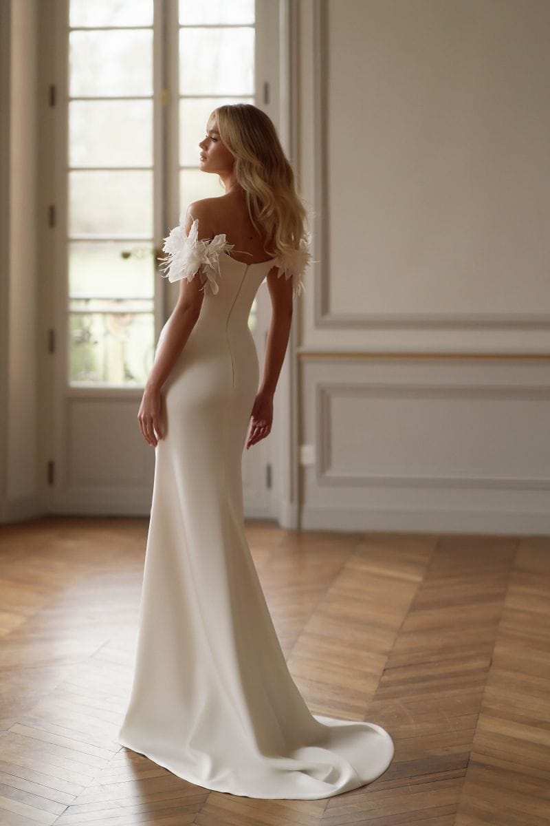 Rochia Wisteria este o alegere sofisticată pentru miresele moderne care își doresc o apariție seducătoare, dar rafinată. Confecționată dintr-un crep fin ce urmează grațios linia siluetei, această rochie tip sirenă impresionează prin simplitatea elegantă a croiului și detaliile spectaculoase de la bust și umeri. Elementele florale tridimensionale aplicate delicat pe mânecile căzute și în zona bustului adaugă un aer romantic și luxuriant, în timp ce despicătura frontală dezvăluie subtil piciorul, oferind un contrast îndrăzneț și feminin. Spatele decupat completează designul într-o notă de senzualitate atent dozată, iar trena moale sporește rafinamentul întregii ținute.