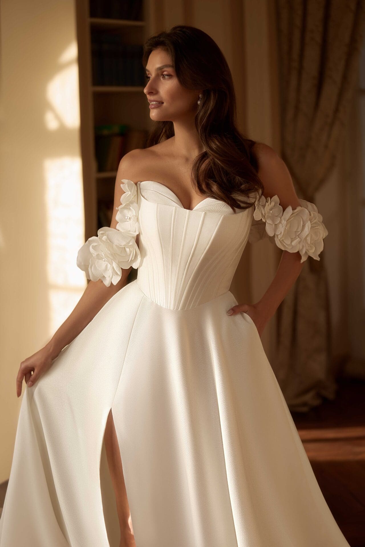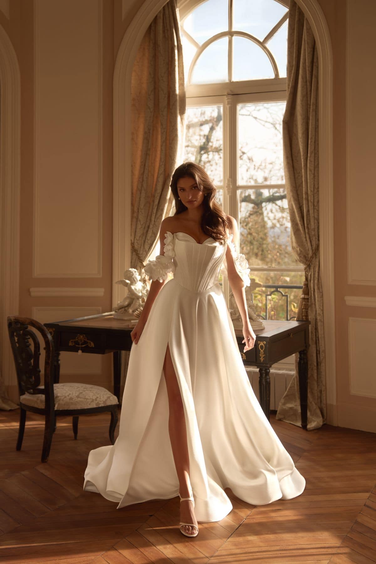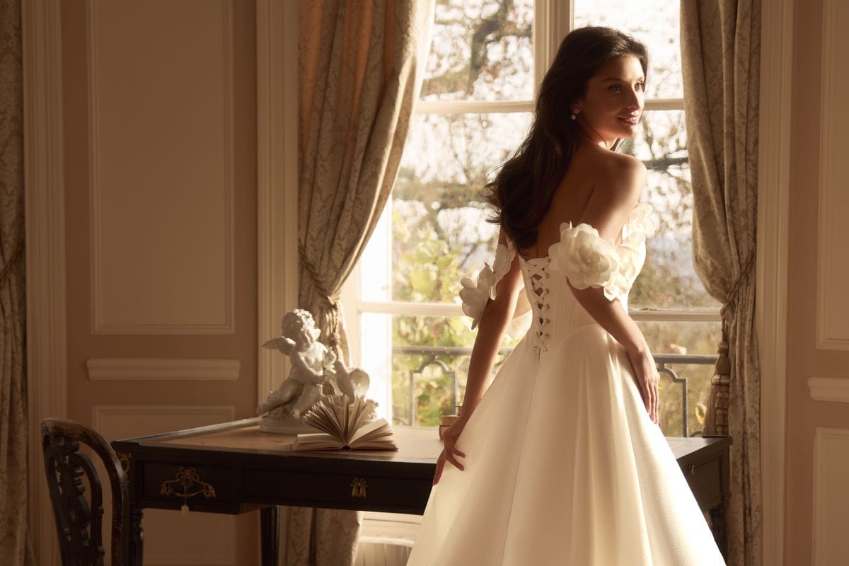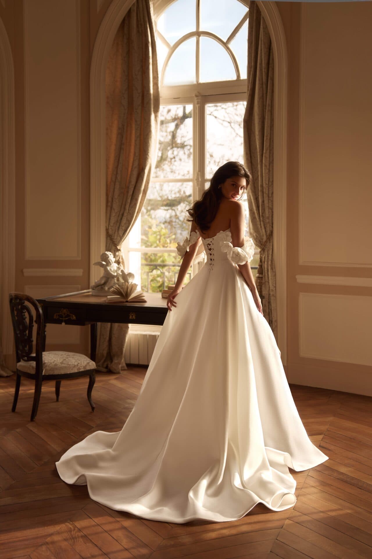 Rochia Yukima emană grația unei prințese moderne prin croiul său amplu și rafinamentul detaliilor florale. Corsetul cu decupaj arhitectural subliniază delicat talia, iar mânecile căzute cu aplicații florale tridimensionale adaugă un aer romantic și sofisticat. Fusta vaporoasă din material satinat curge fluid, cu o deschidere frontală ce dezvăluie subtil feminitatea și libertatea de mișcare. O creație atemporală, dedicată mireselor care iubesc eleganța pură și detaliile sculpturale.